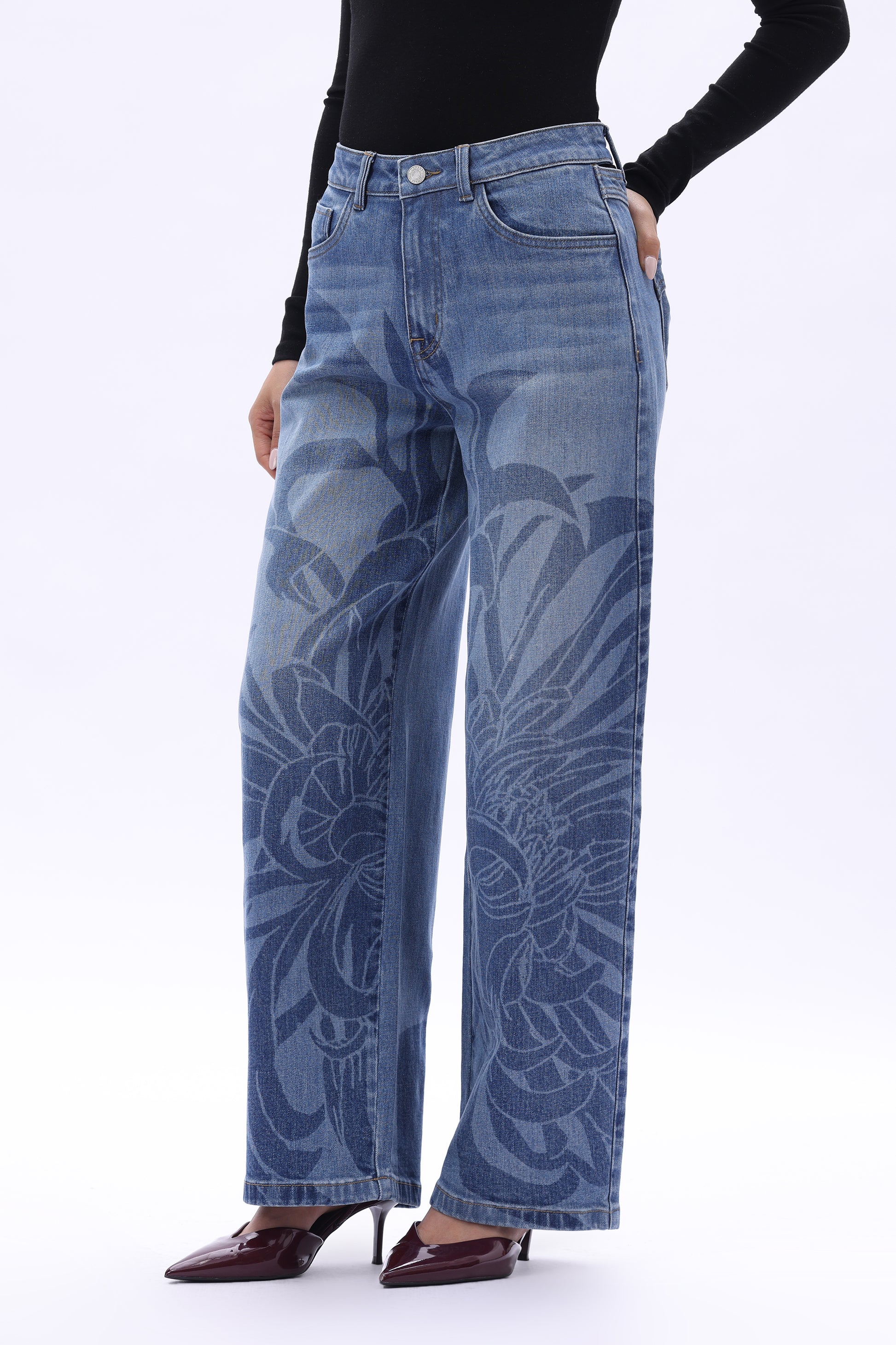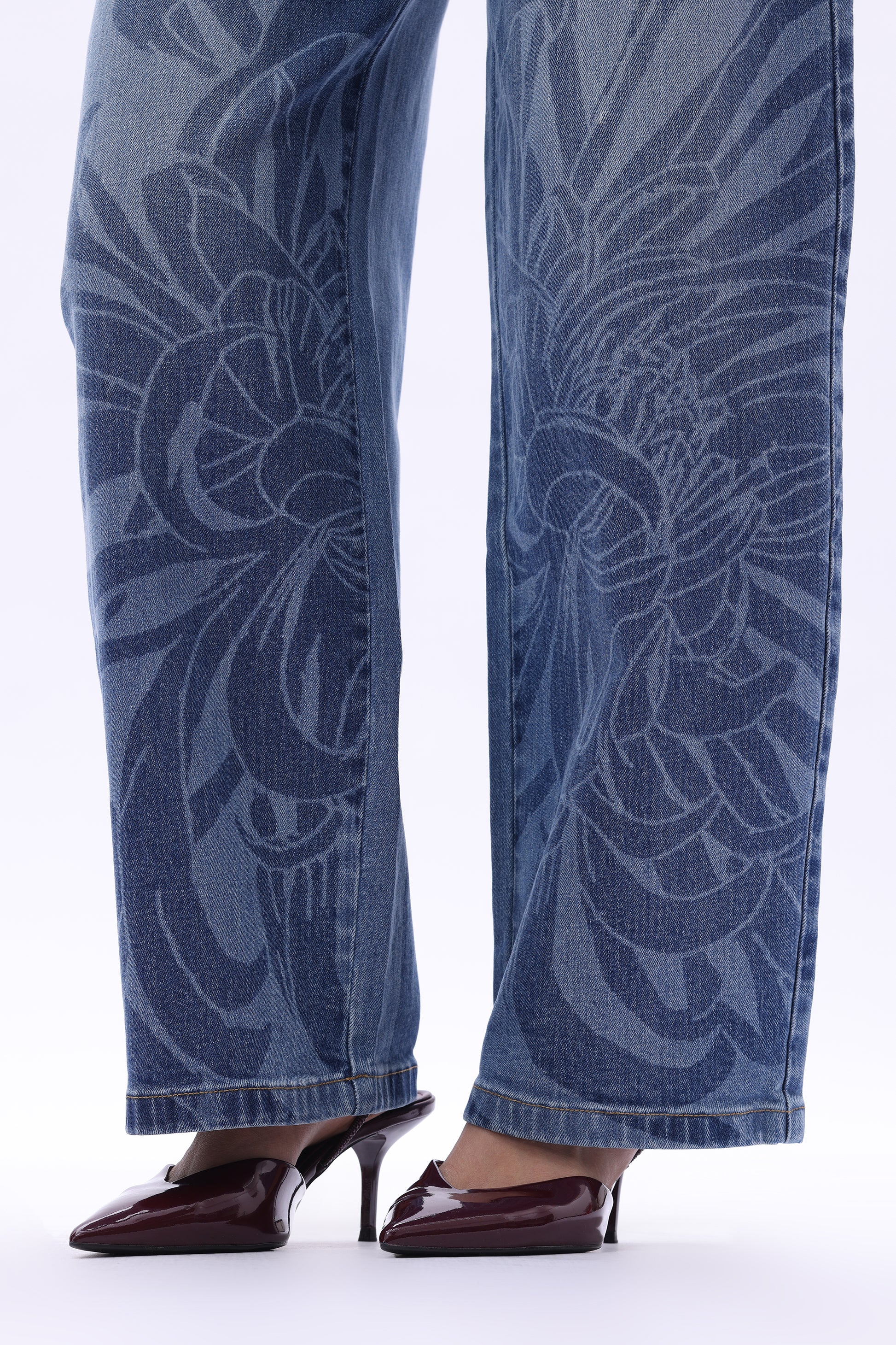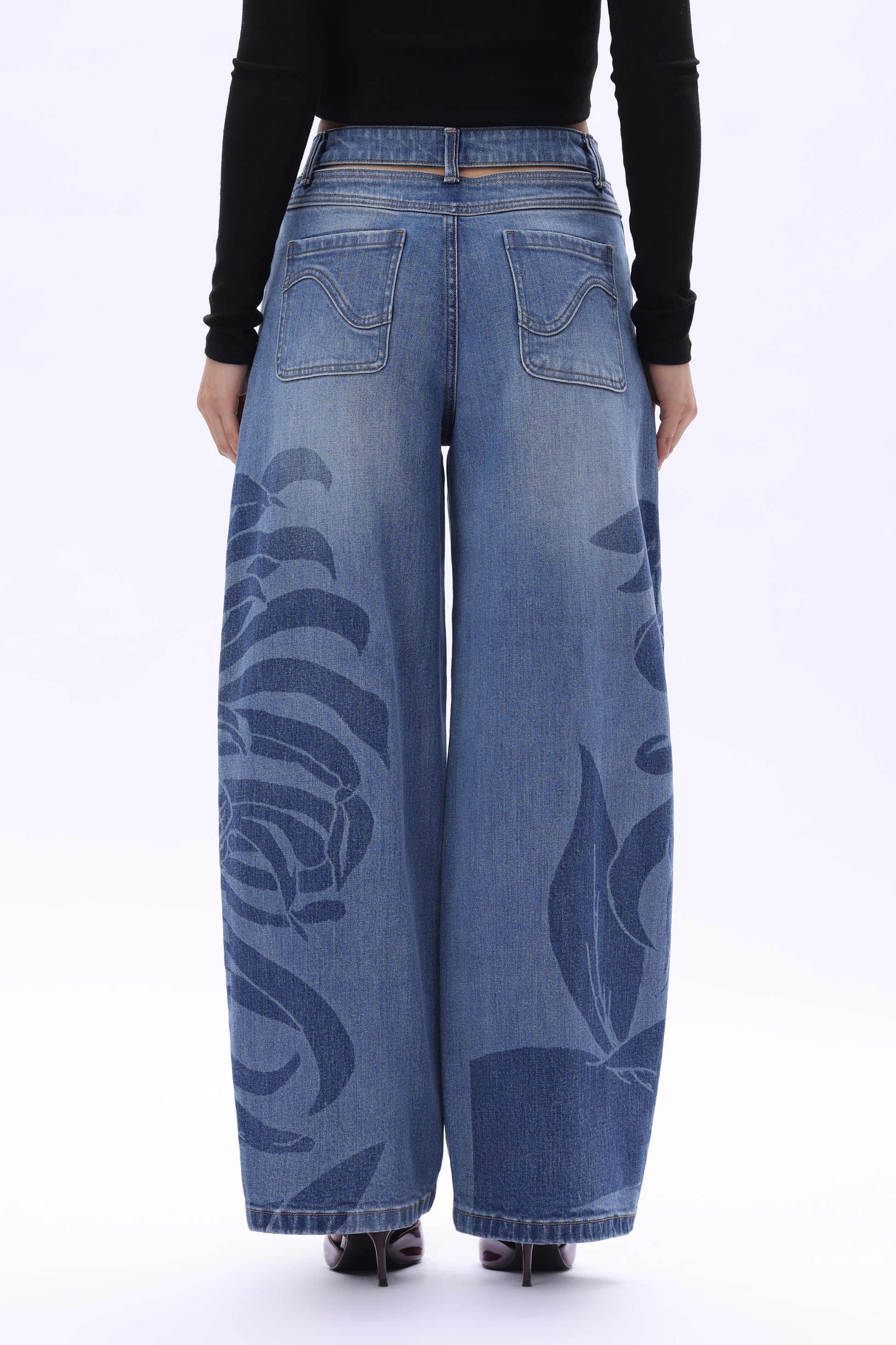 High rise barrel jeans in a mid-blue wash deliver a retro denim feel. The jeans feature floral laser printing across the body, a loose yet clean silhouette, a cut-out detail at the back waistband, and patchwork back pocket design.