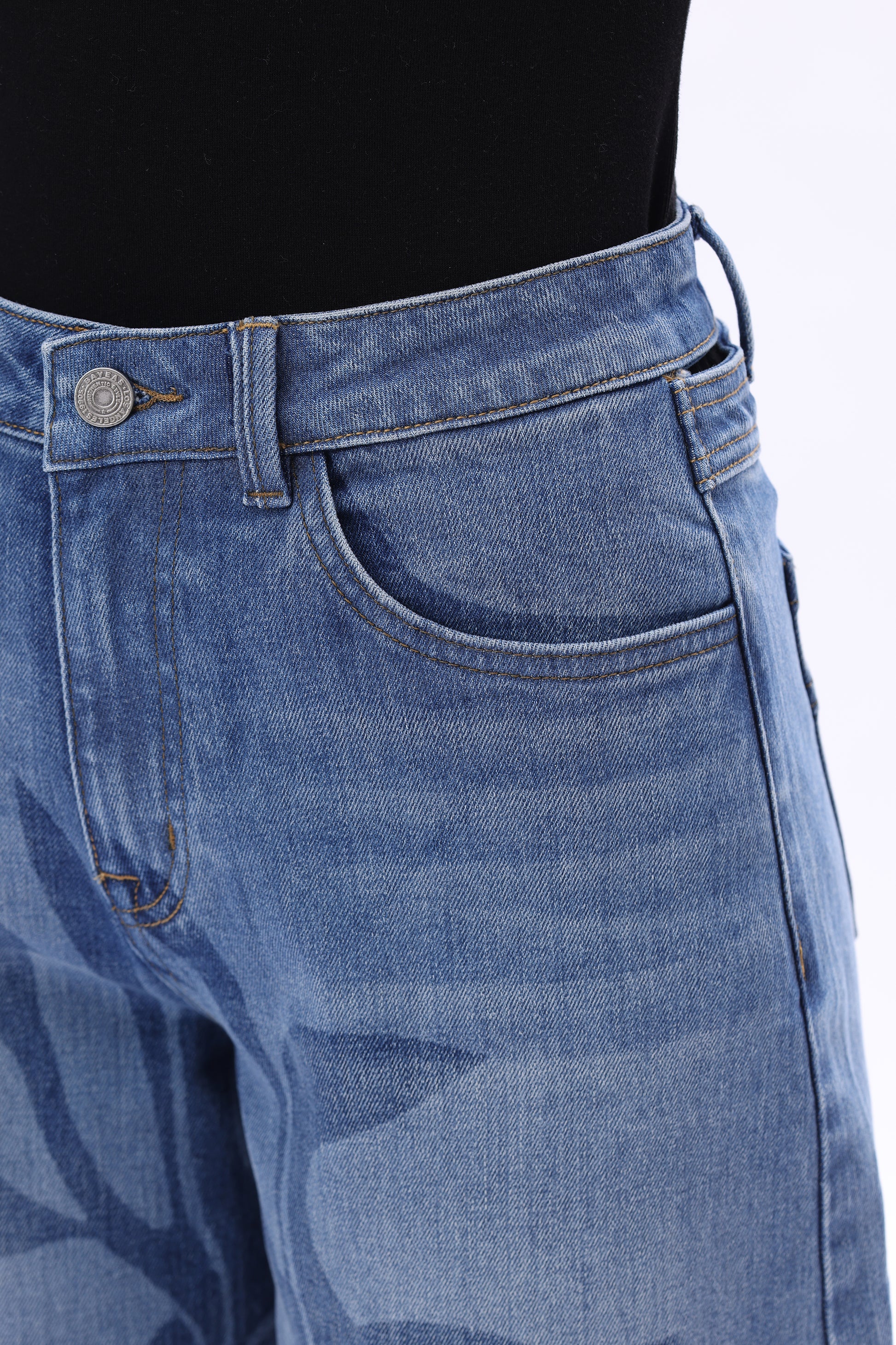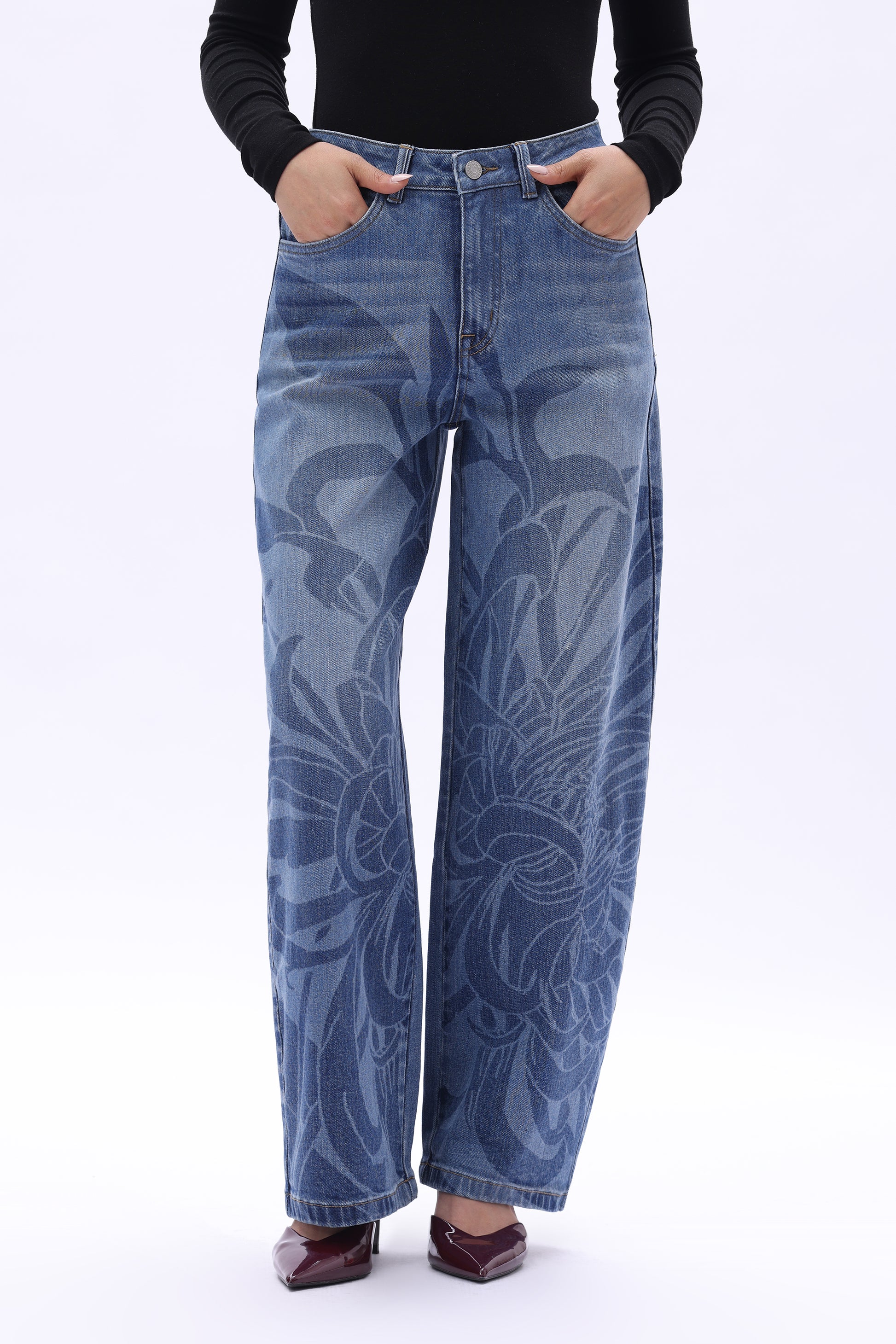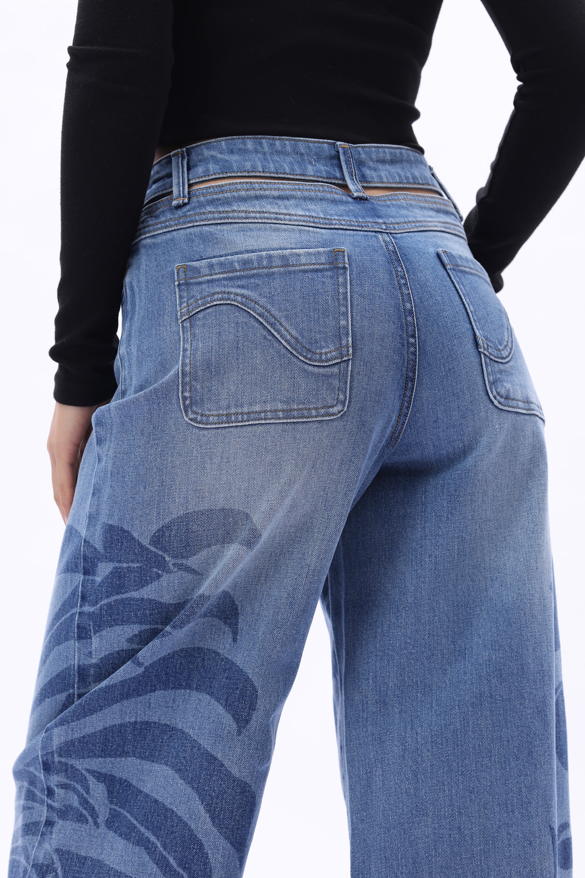 High rise barrel jeans in a mid-blue wash deliver a retro denim feel. The jeans feature floral laser printing across the body, a loose yet clean silhouette, a cut-out detail at the back waistband, and patchwork back pocket design.