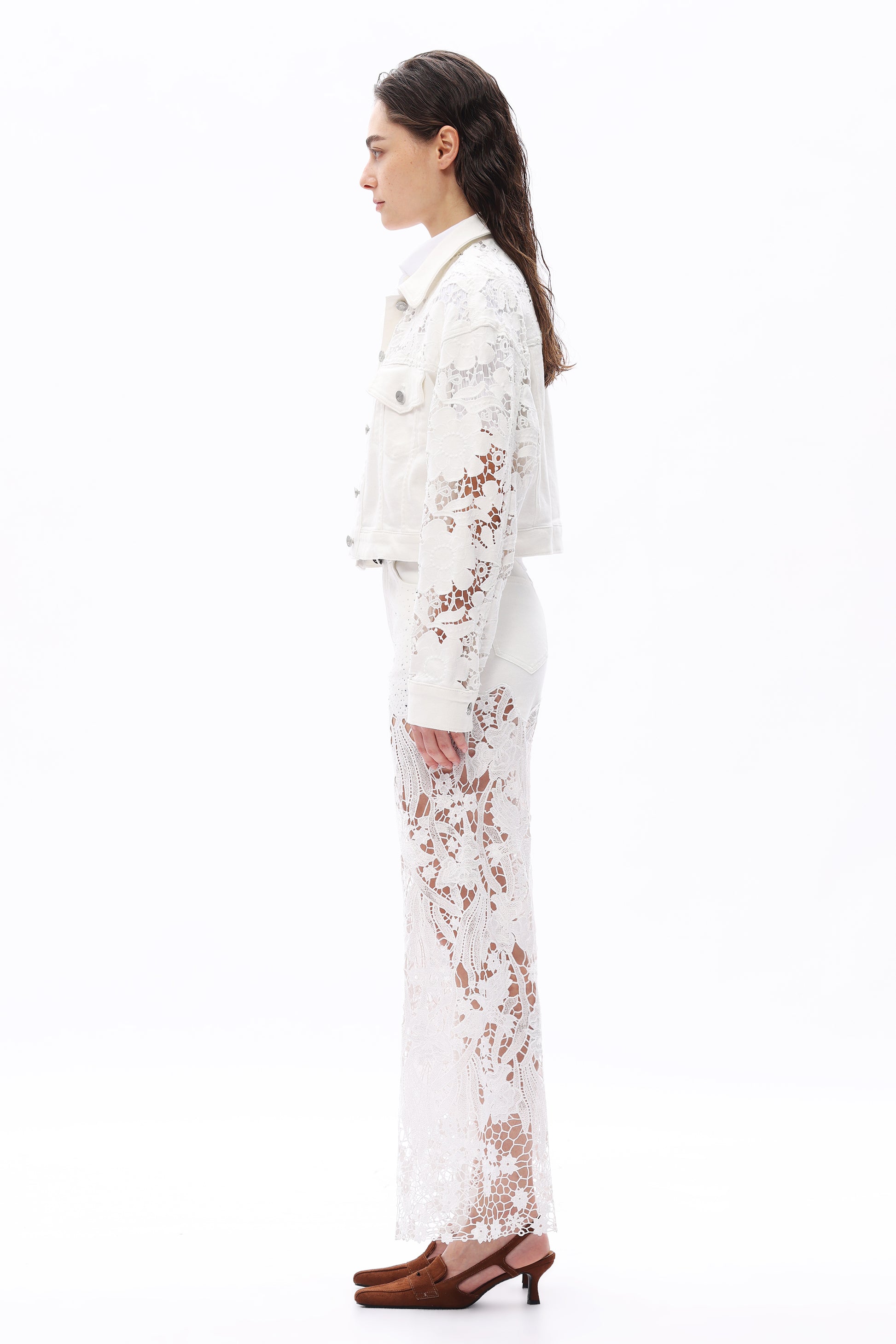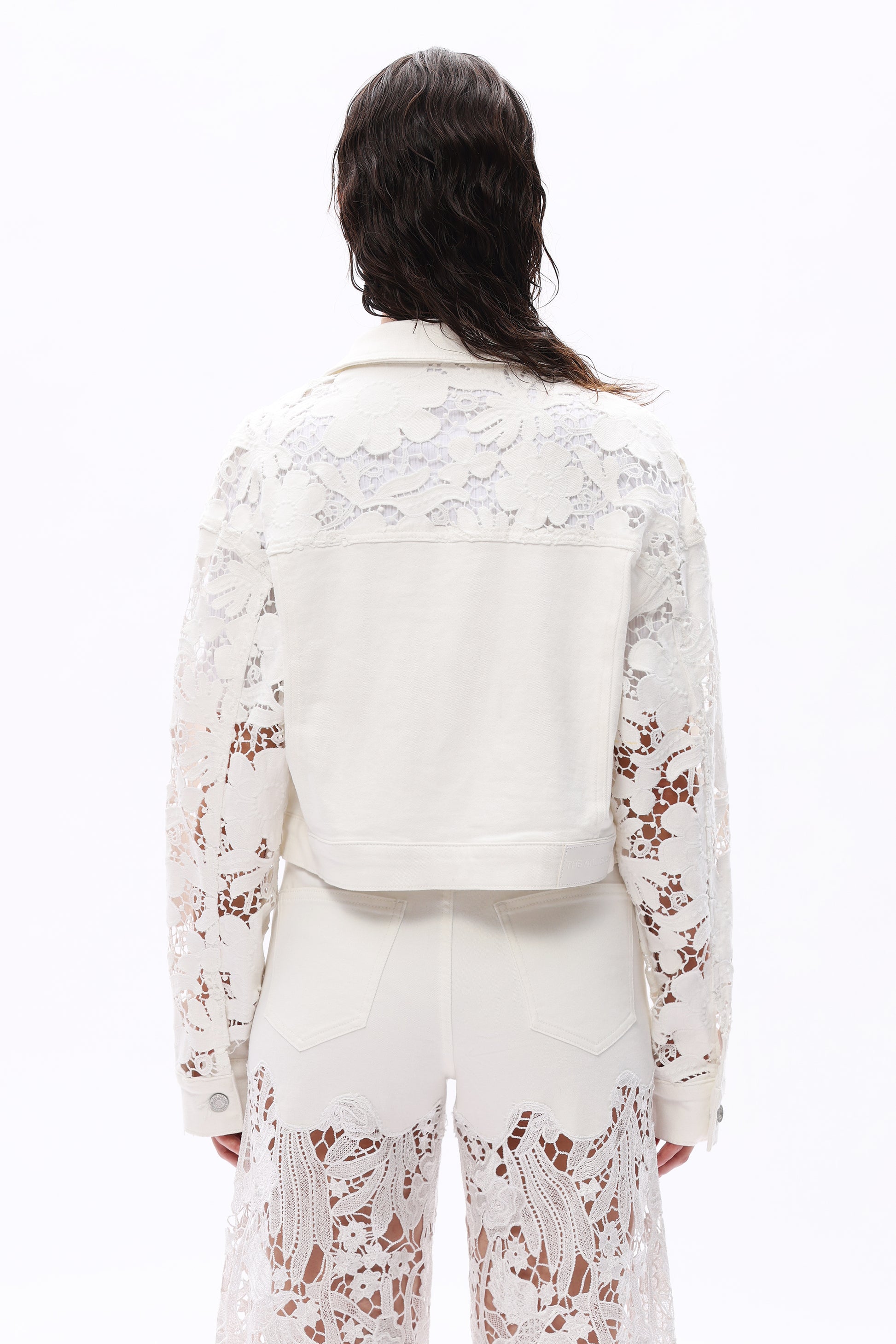 Brooklyn loose lace jacket featuring a classic jacket silhouette with clean lines that flatter the figure while ensuring a comfortable fit. Delicate lace panels are inset in key areas, infusing a touch of feminine elegance into the structured form. The contrast between softness and strength creates a visual balance of grace and poise, revealing a distinctive and refined sense of style.