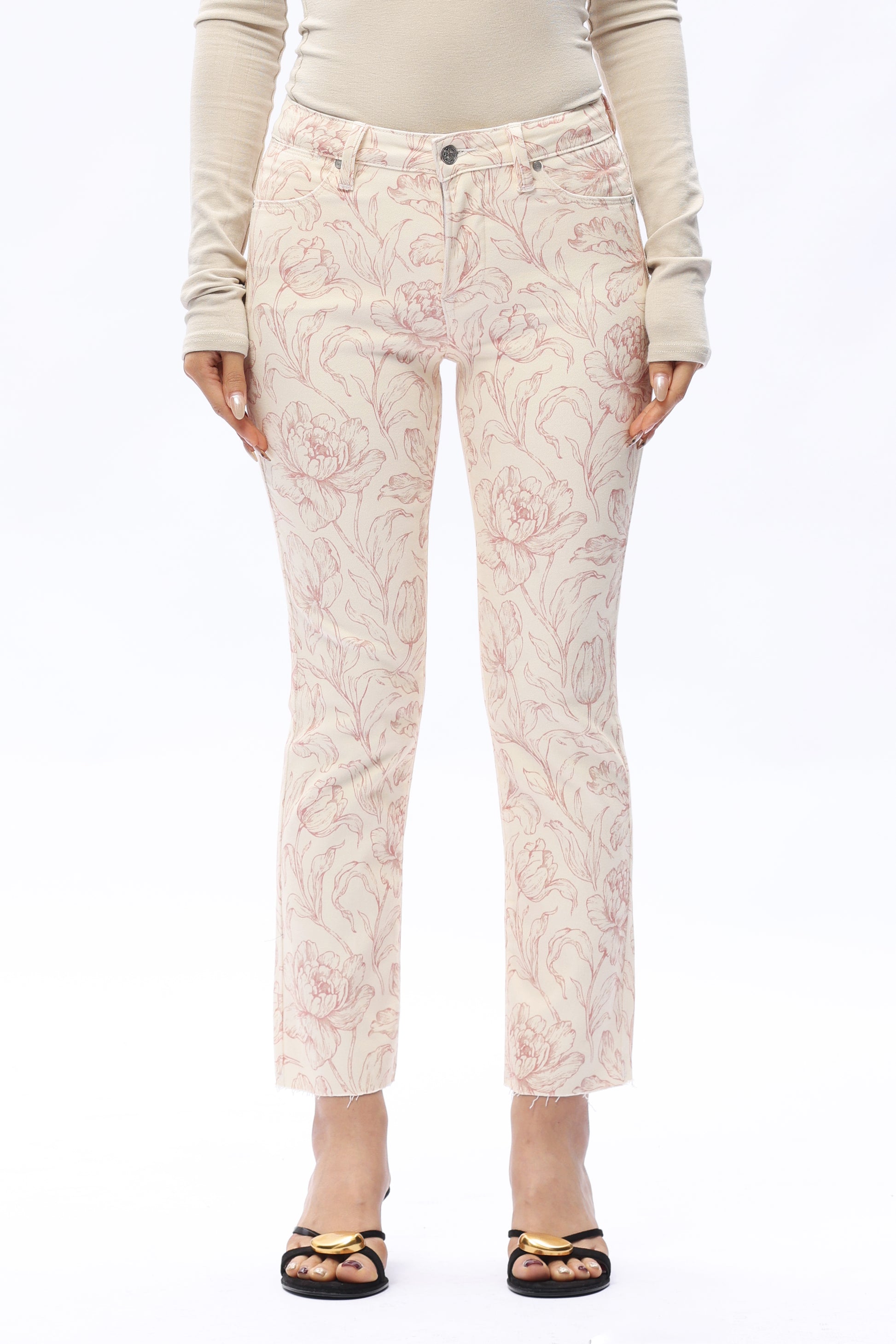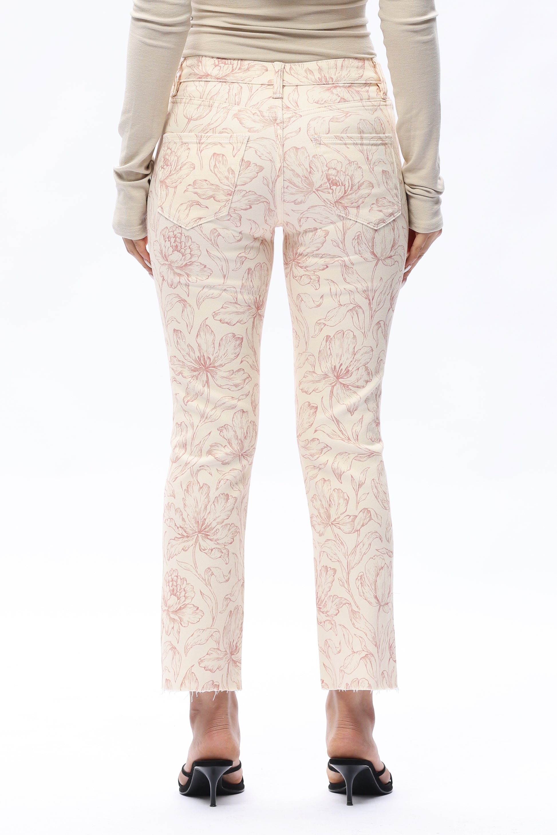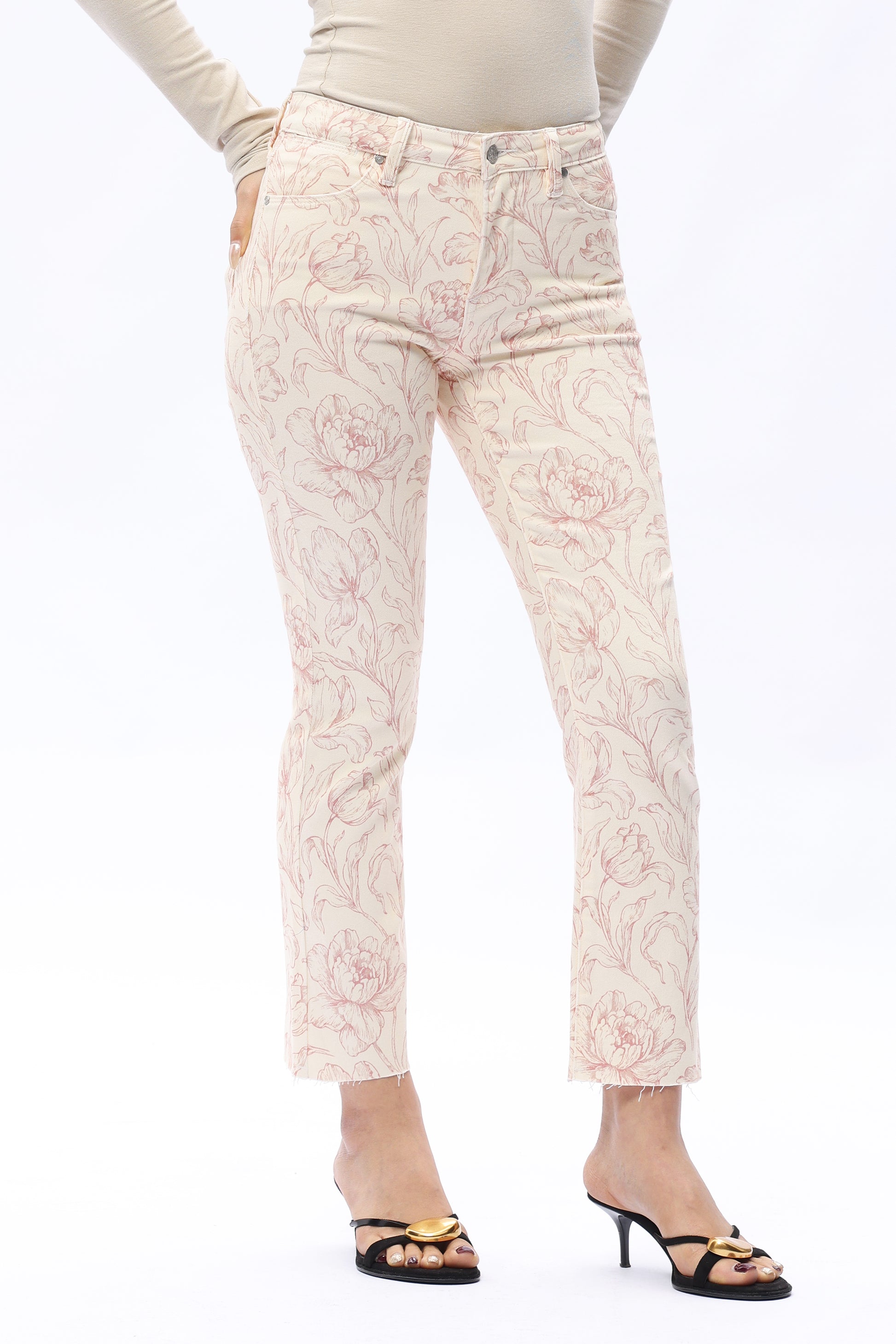 Dublin flora straight leg pants featuring floral prints on a coral-toned base, combining a classic silhouette with a distinctive pattern.