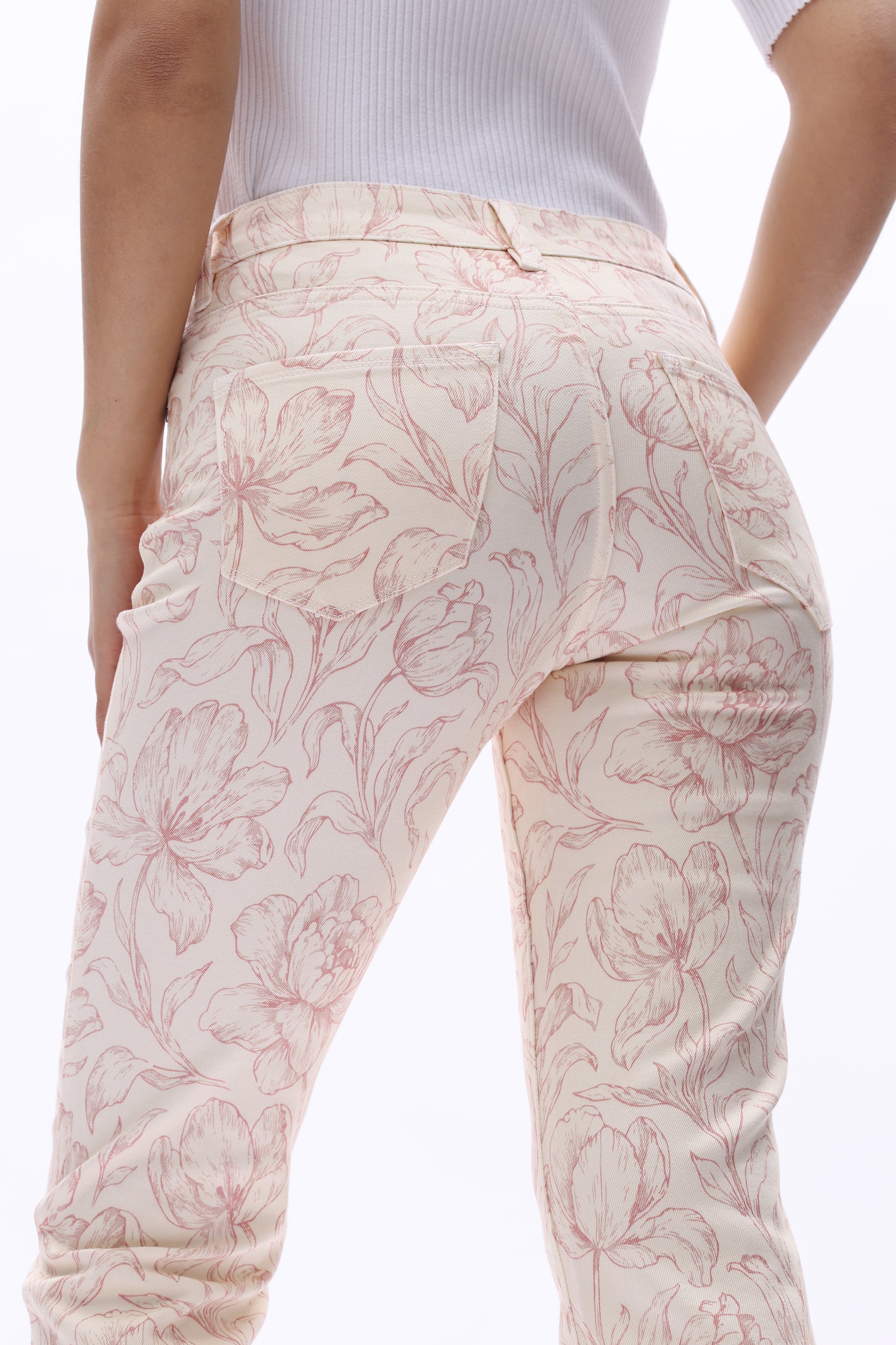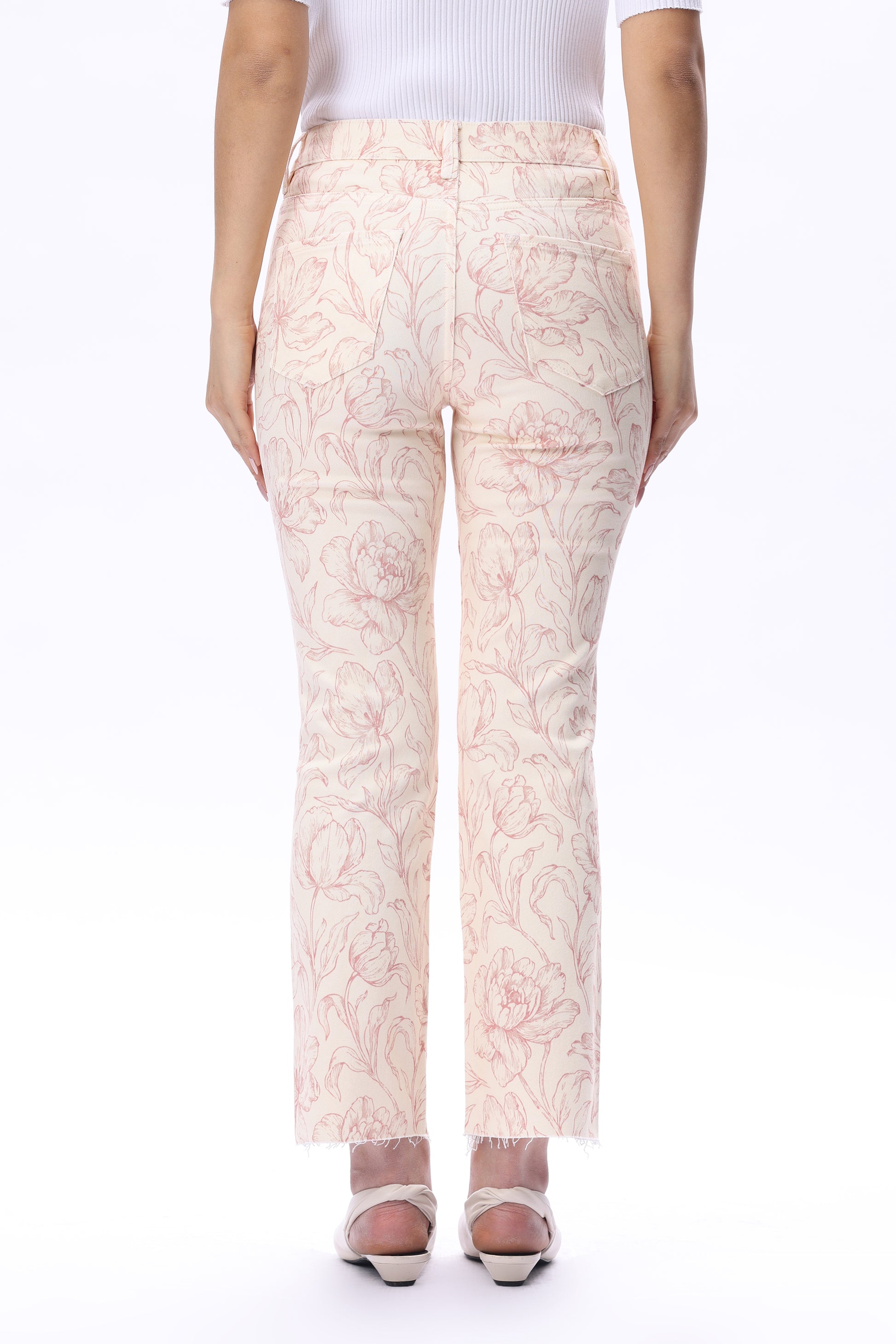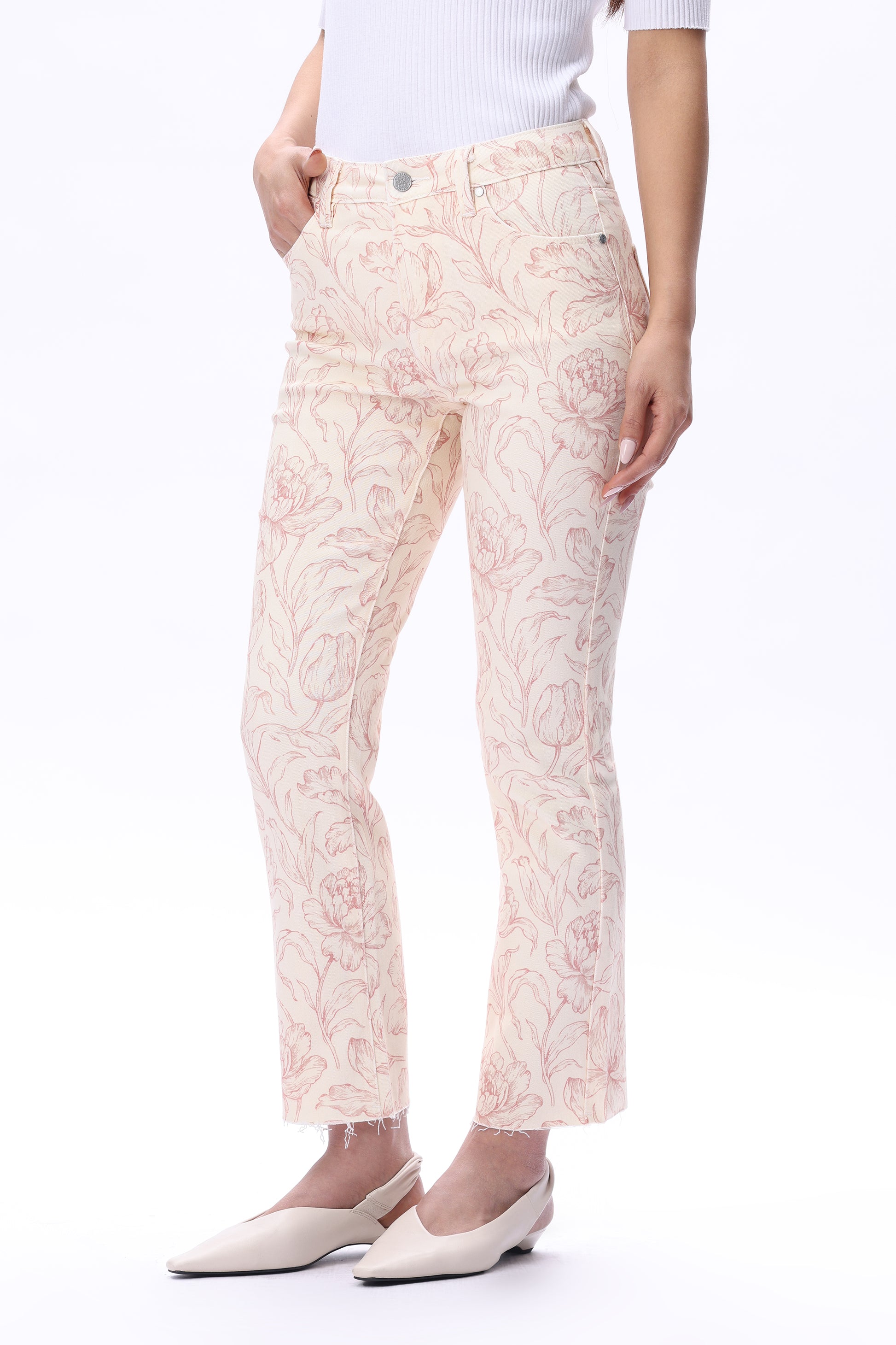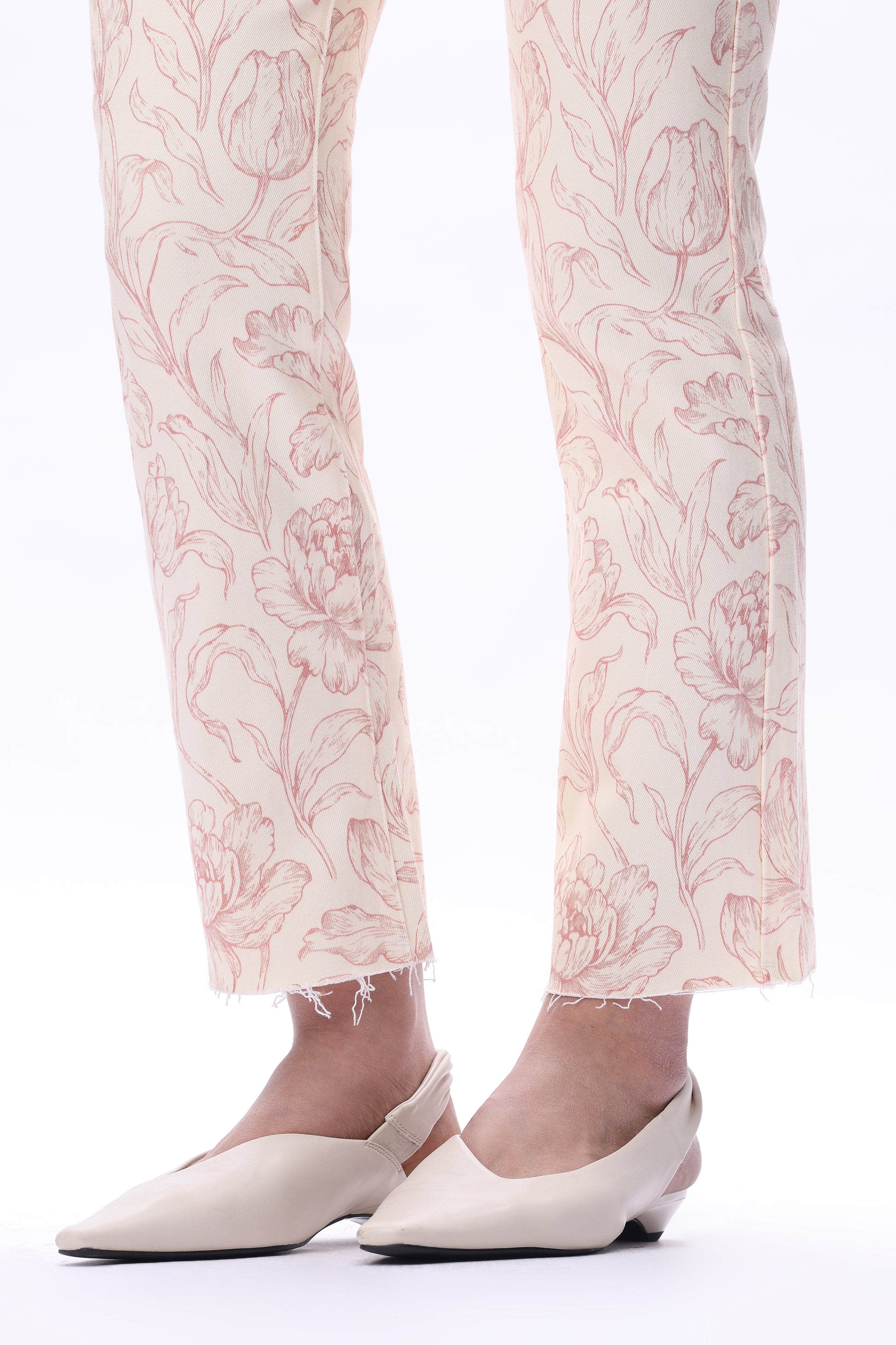 Dublin flora straight leg pants featuring floral prints on a coral-toned base, combining a classic silhouette with a distinctive pattern.