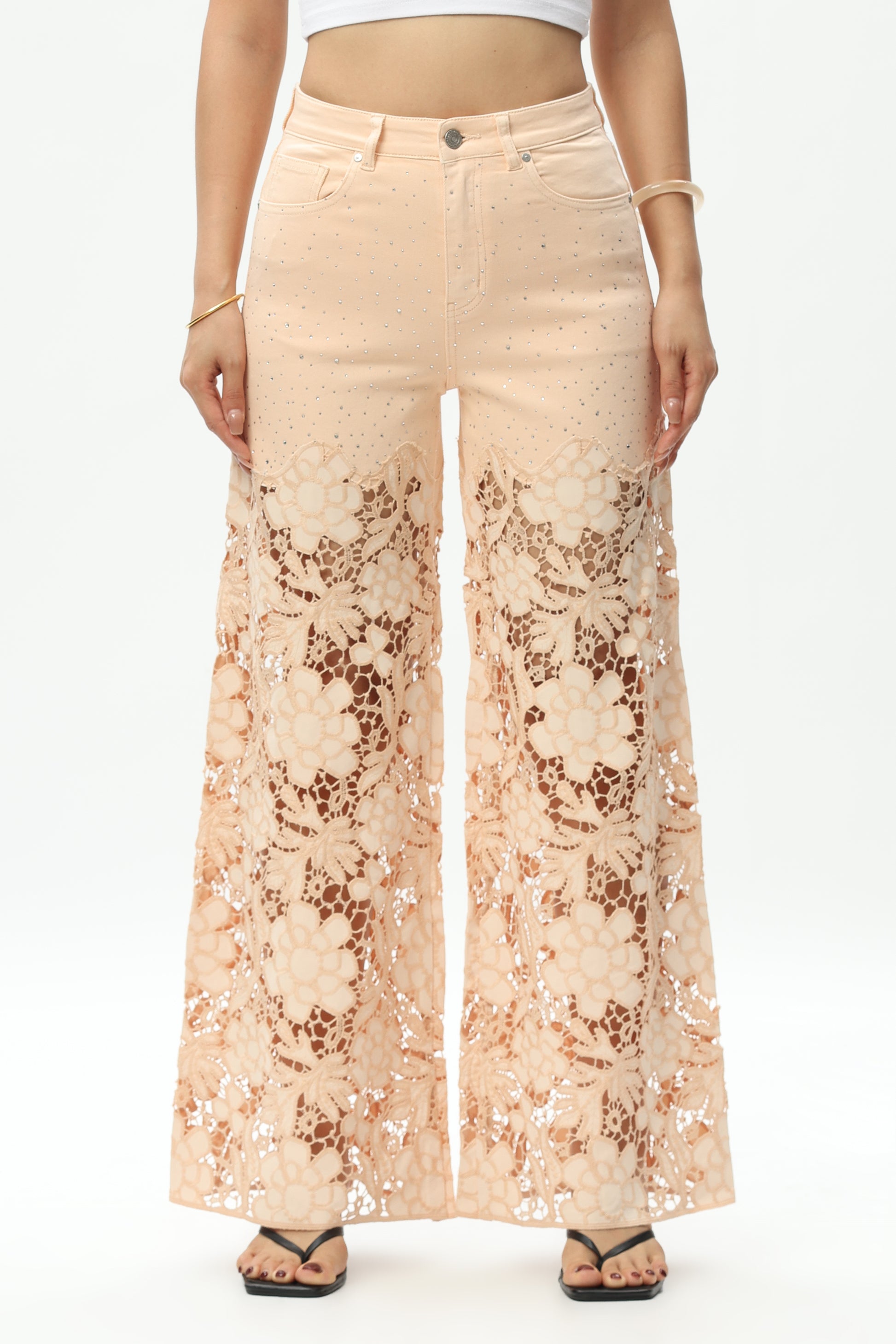Ultra High Rise Wide Legin A Classic Five-Pocket Style, Featuring Vibrant Colors, Cool Lace Paneling, Delicate And Fresh Embroidered Patterns, And Sparkling Hotfix Rhinestones.