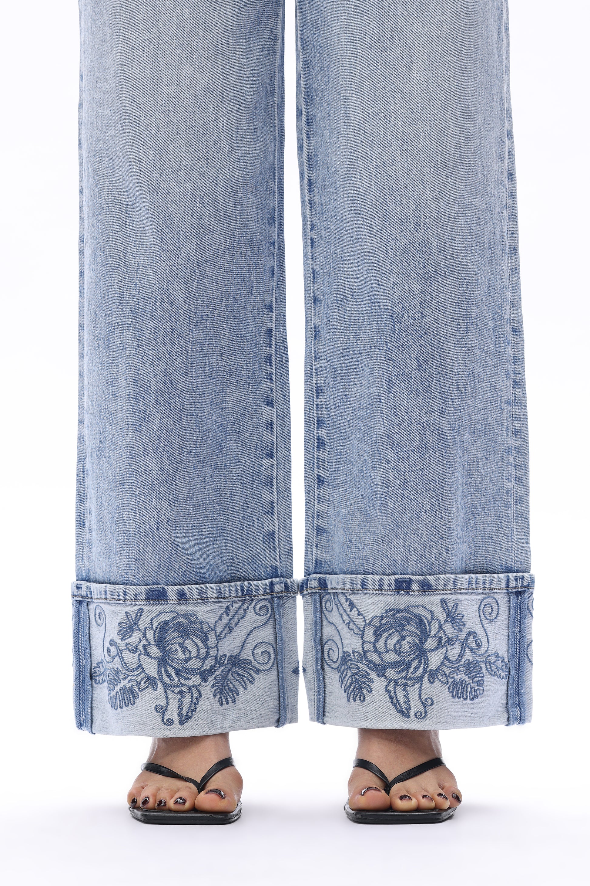 High rise wide leg denim jeans with a classic five-pocket design, fixed cuffed hems featuring embroidered details, and a clean light-blue wash.