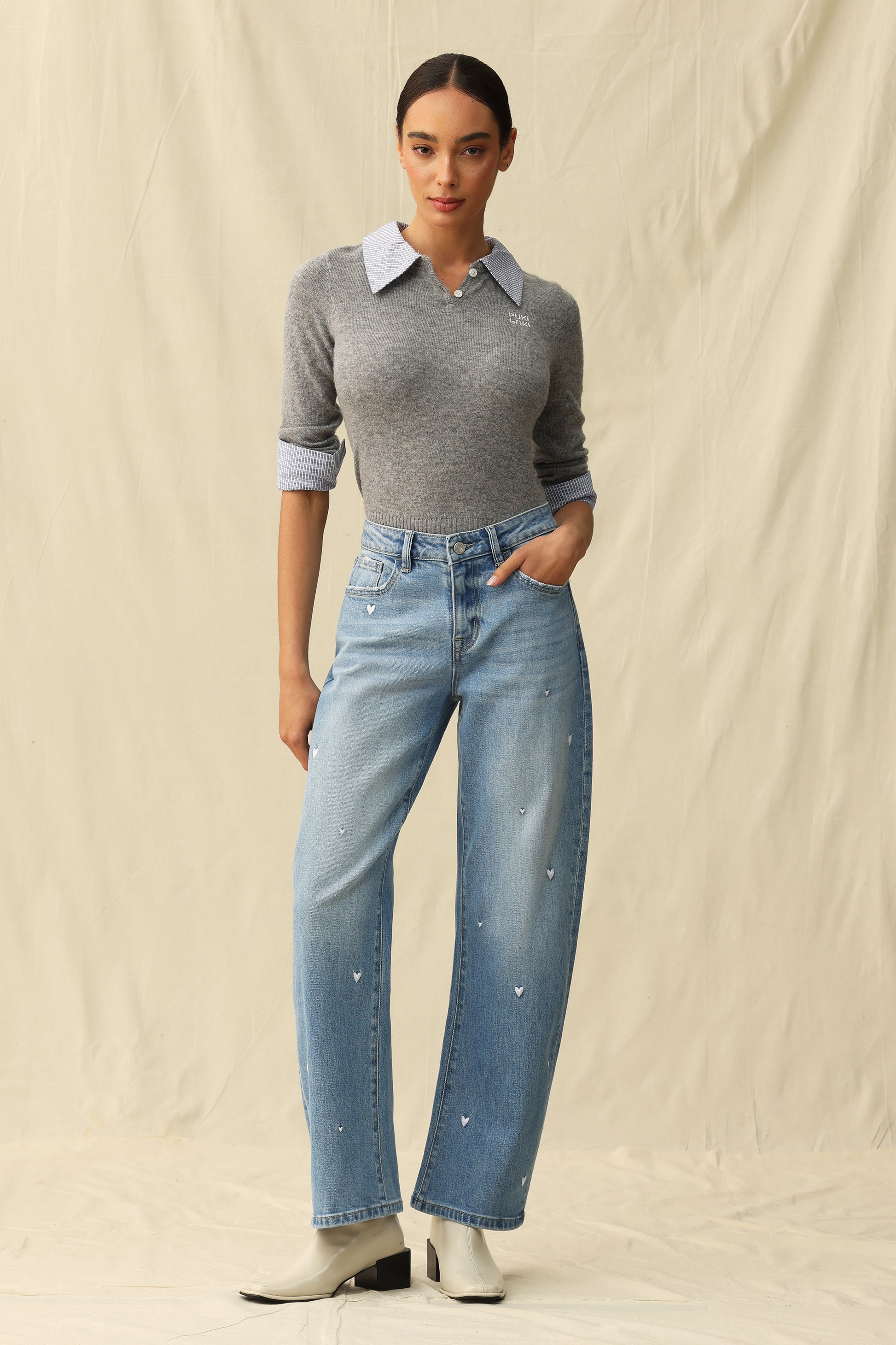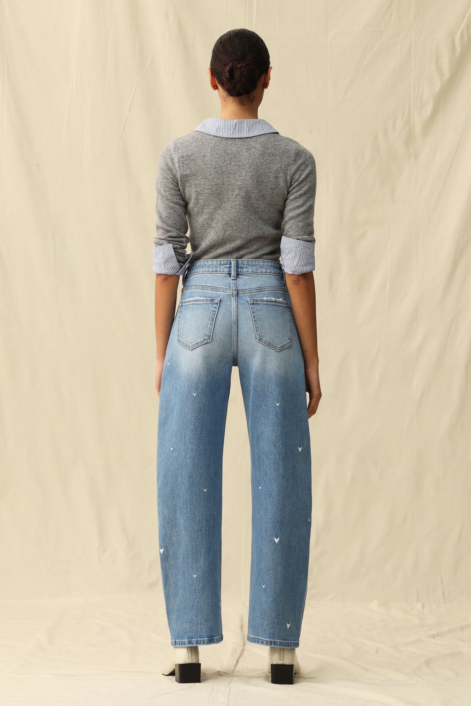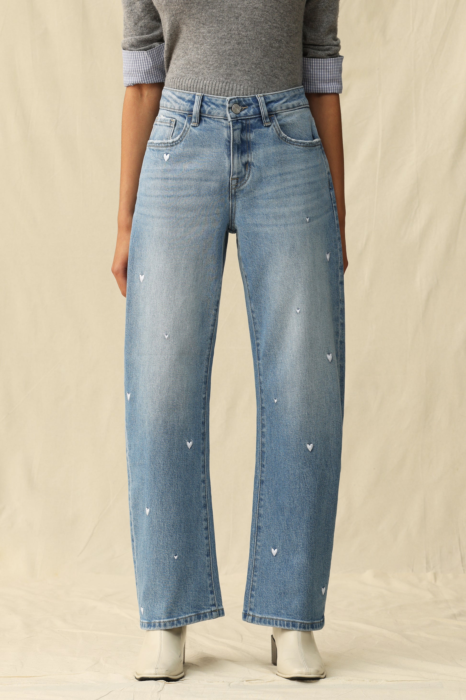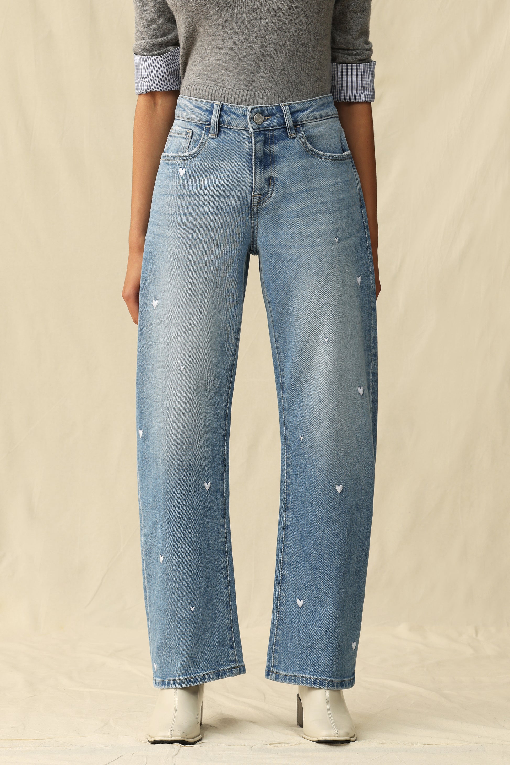 Mid rise barrel pants in a classic five pocket design, featuring heart-shaped embroidery details on both front and back panels.
