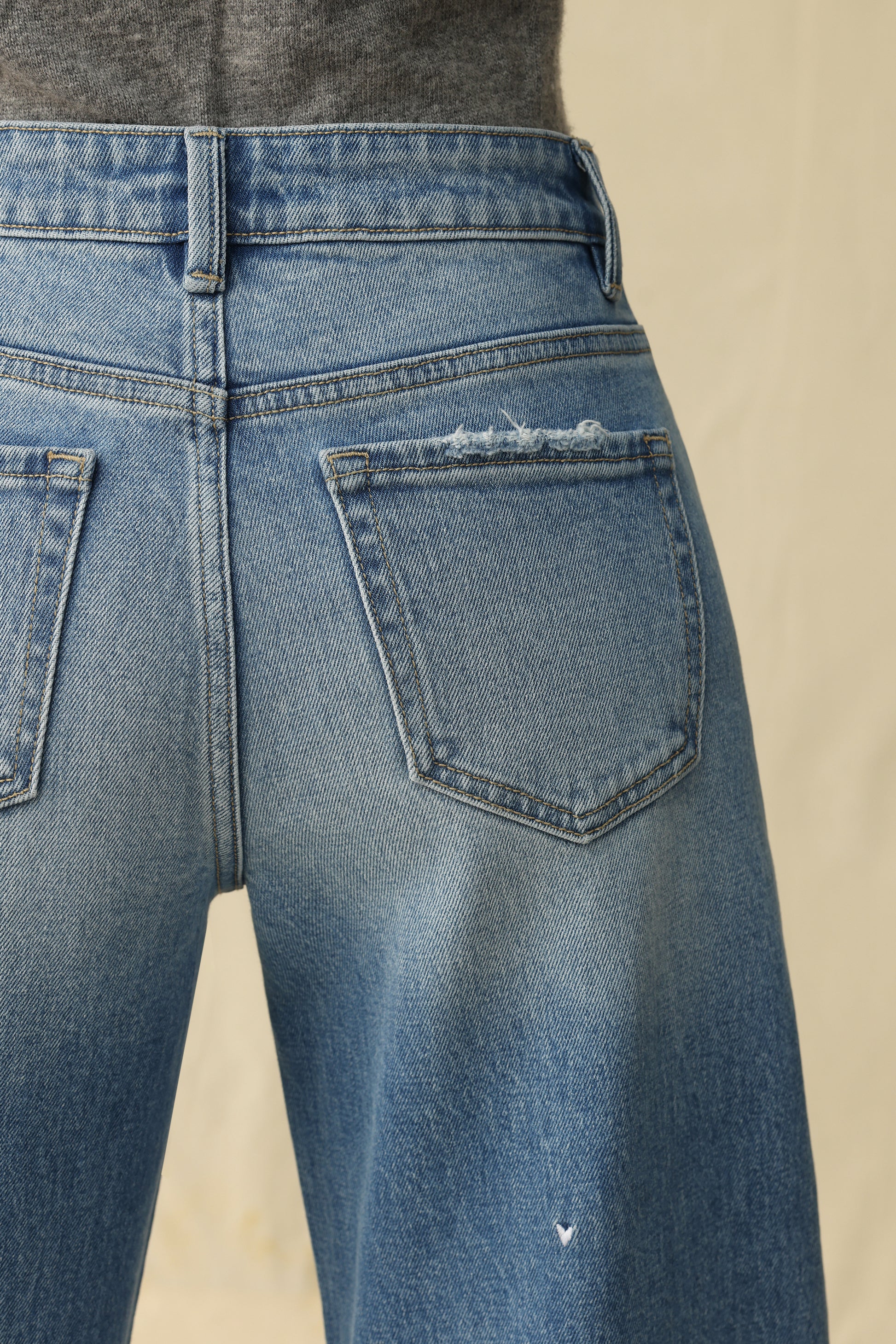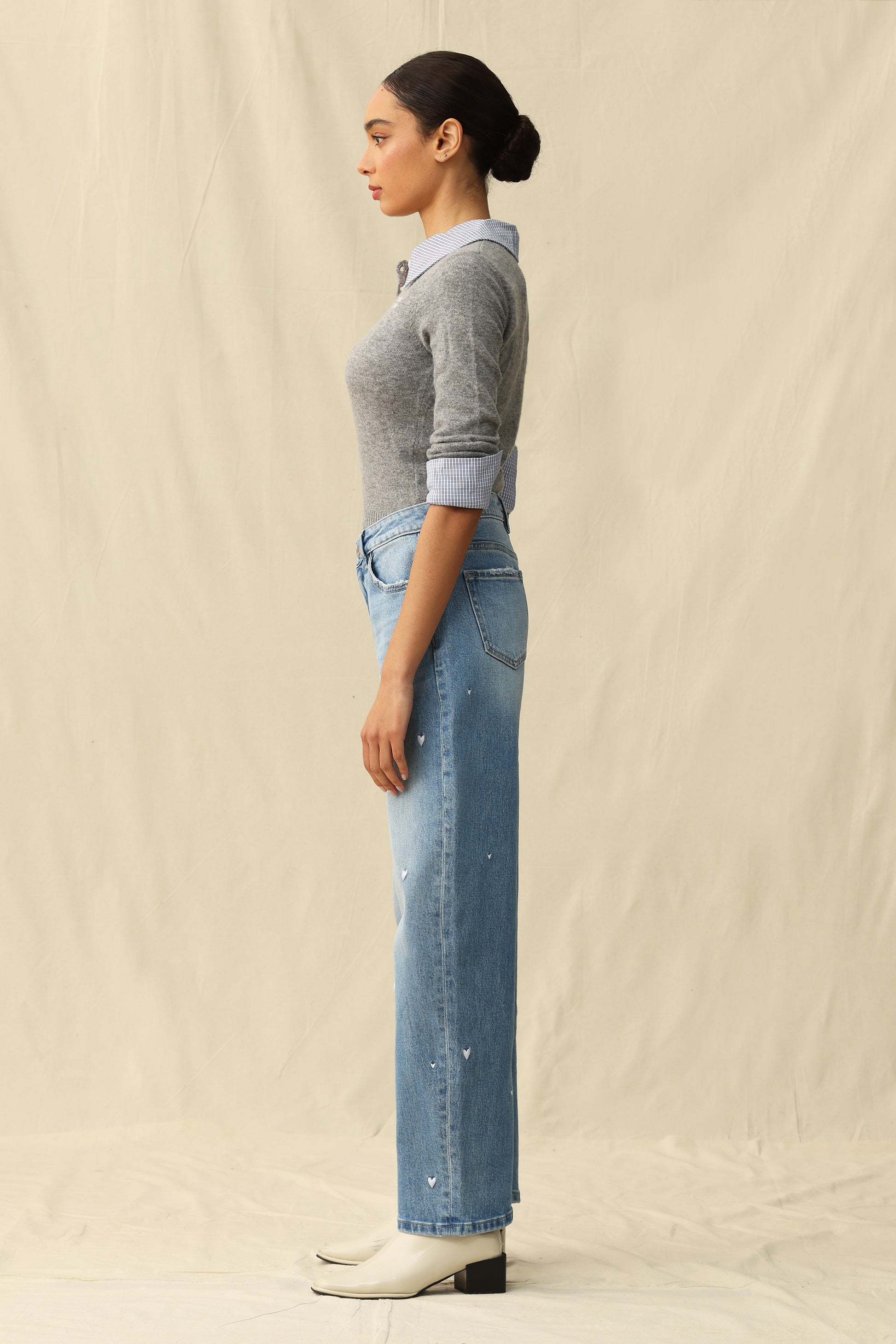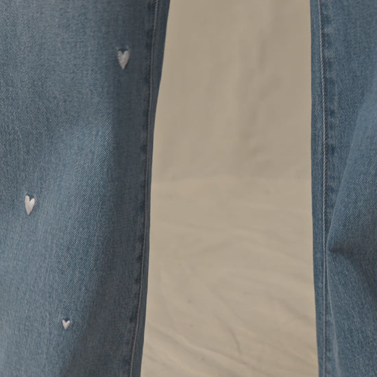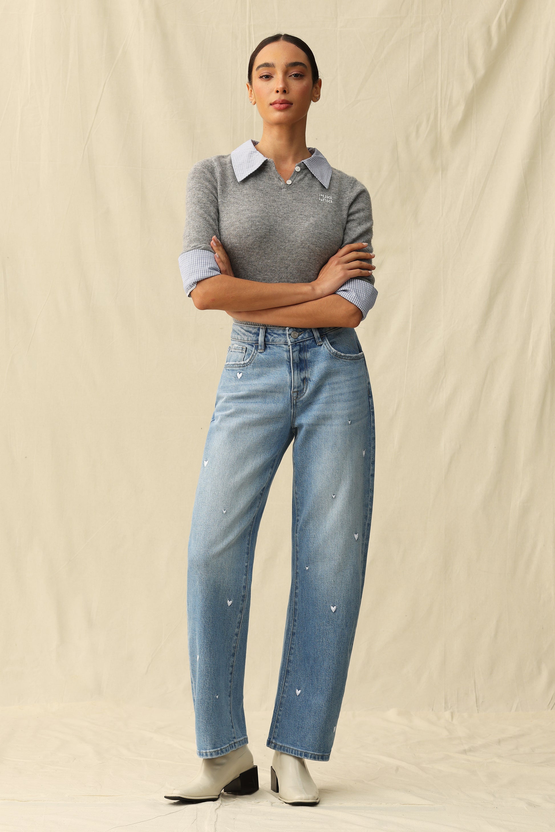 Mid rise barrel pants in a classic five pocket design, featuring heart-shaped embroidery details on both front and back panels.