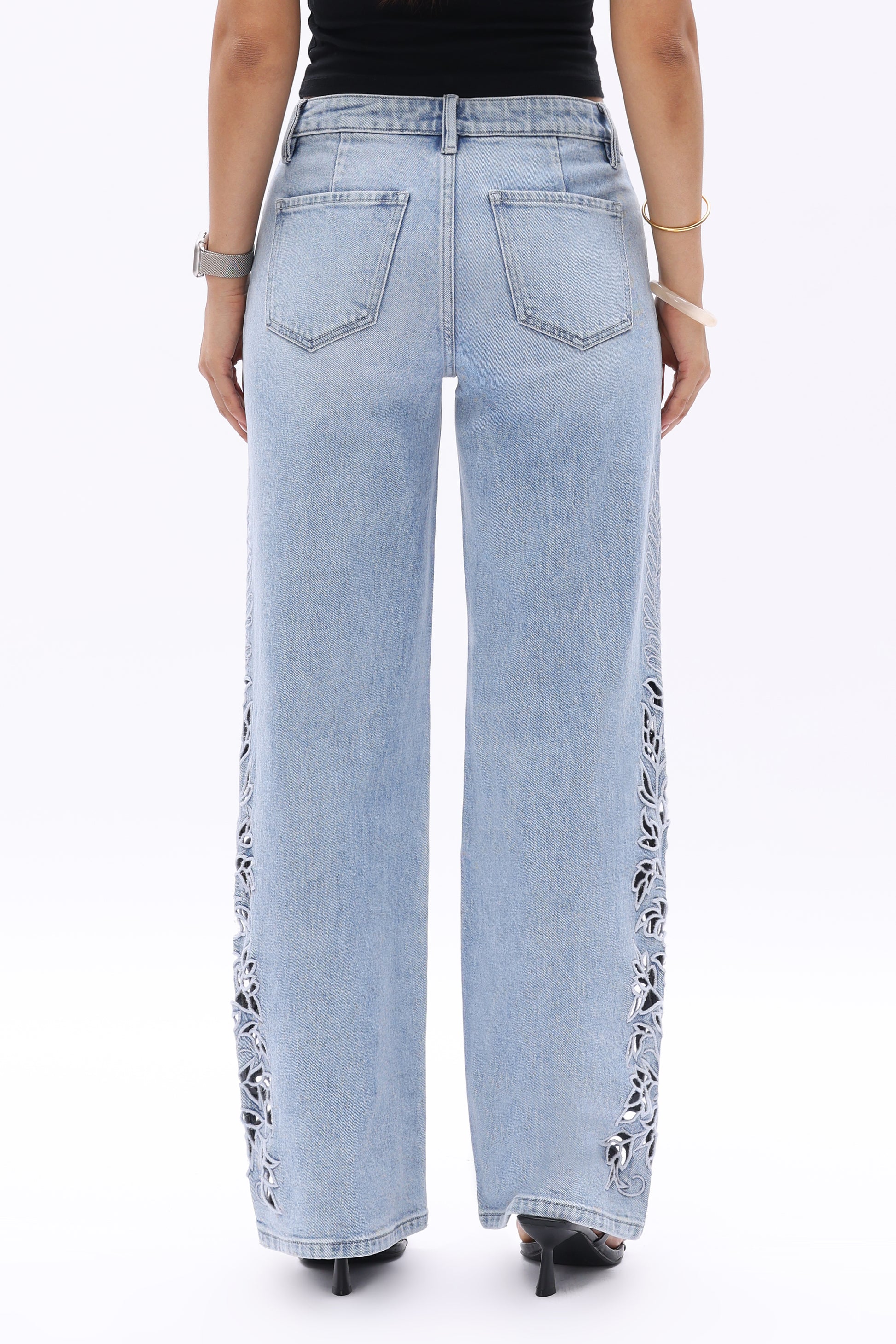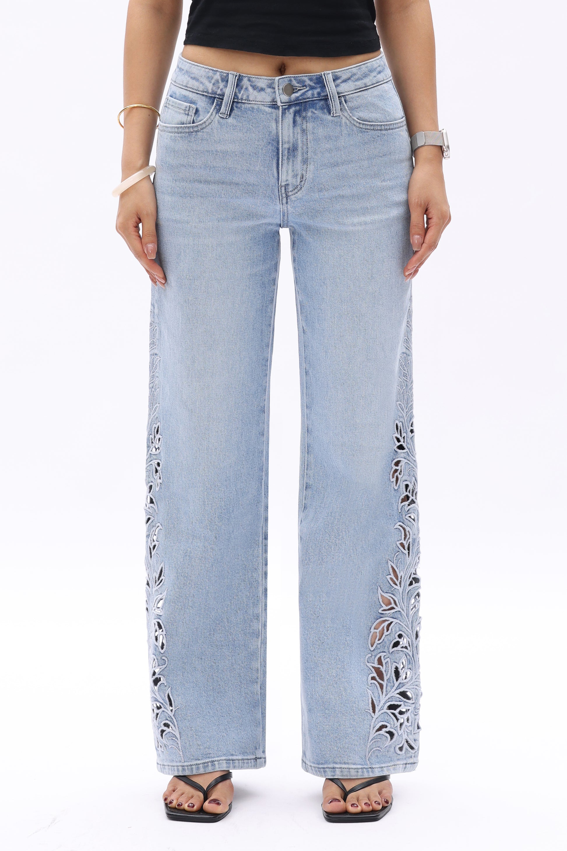 Flora mid rise straight leg jeans five pocket style lace cutout embroidery on legs suitable for holiday casual wear