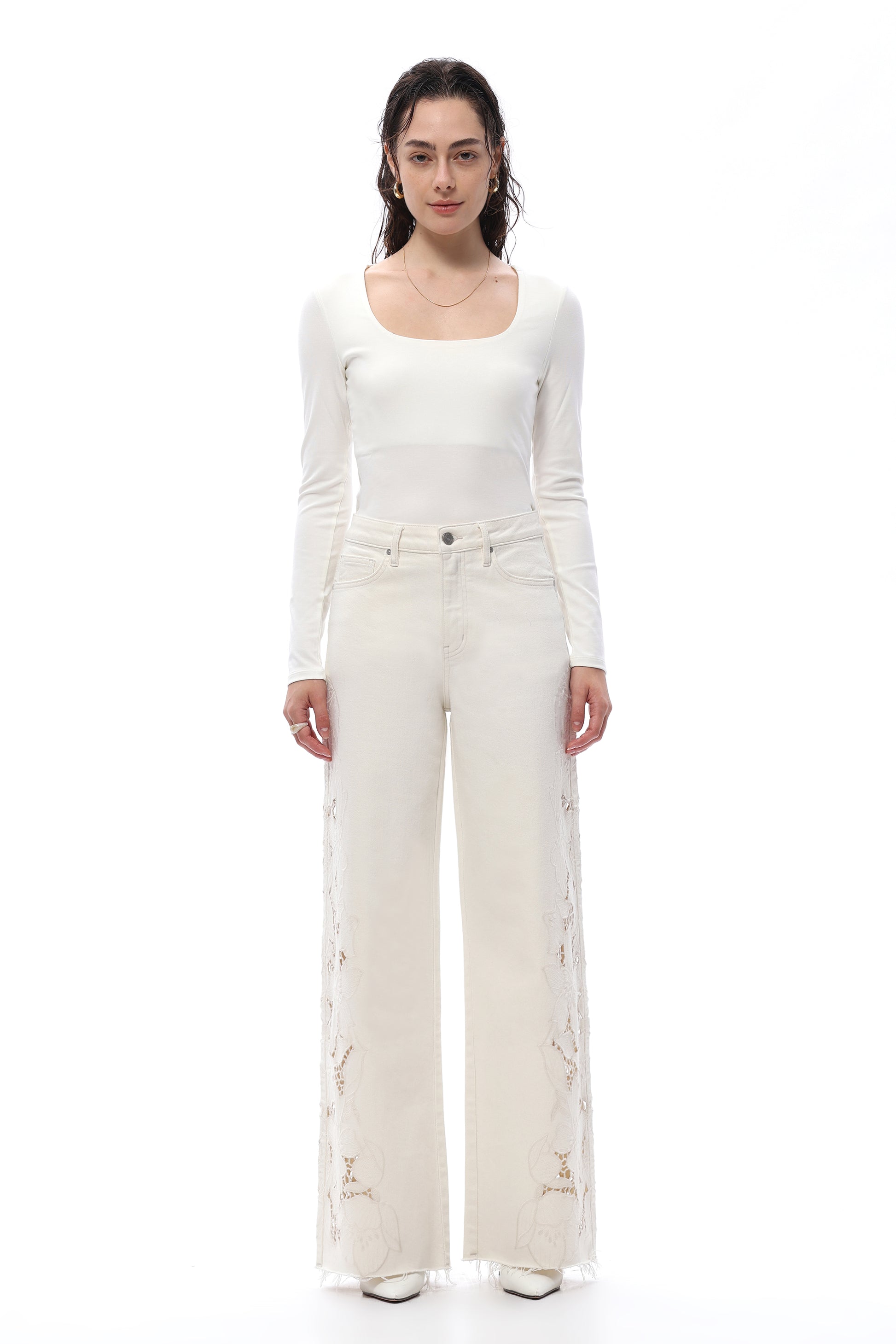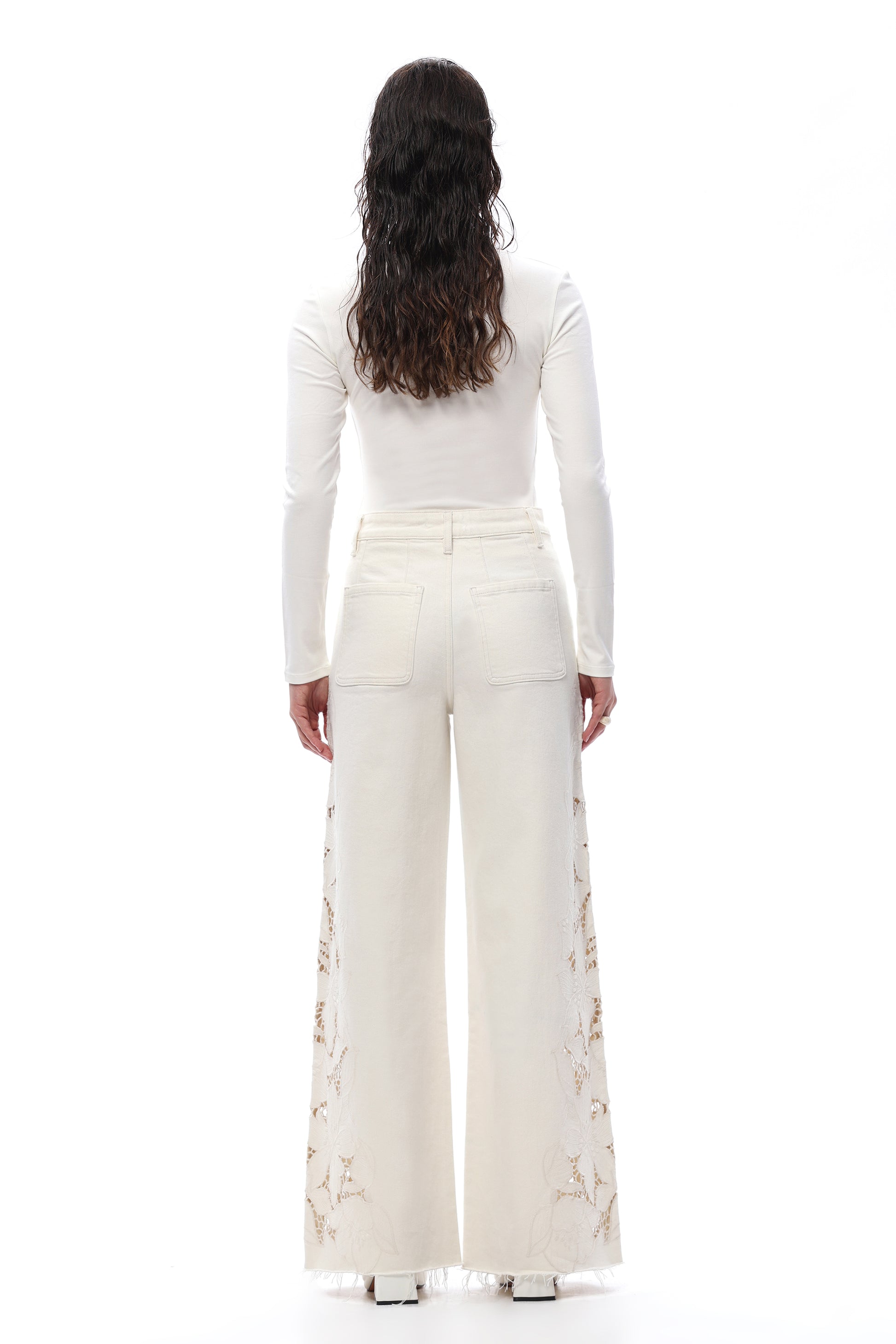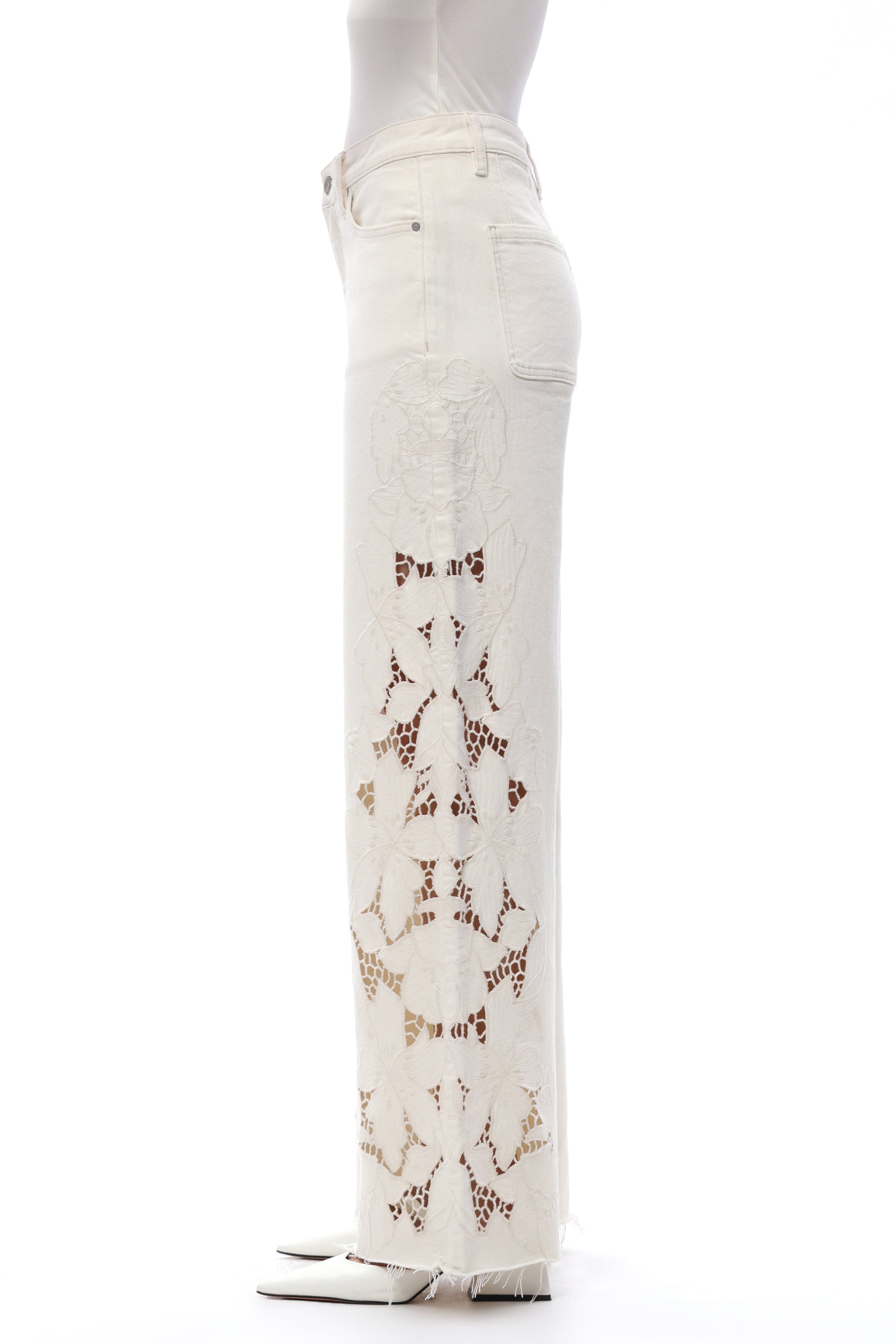 High rise wide leg jeans featuring curved square back pockets and back pleats in place of a yoke. The off-white base is accented with cutout embroidery along the side seams and hem, crafted from high-stretch fabric for a comfortable, body-contouring fit.