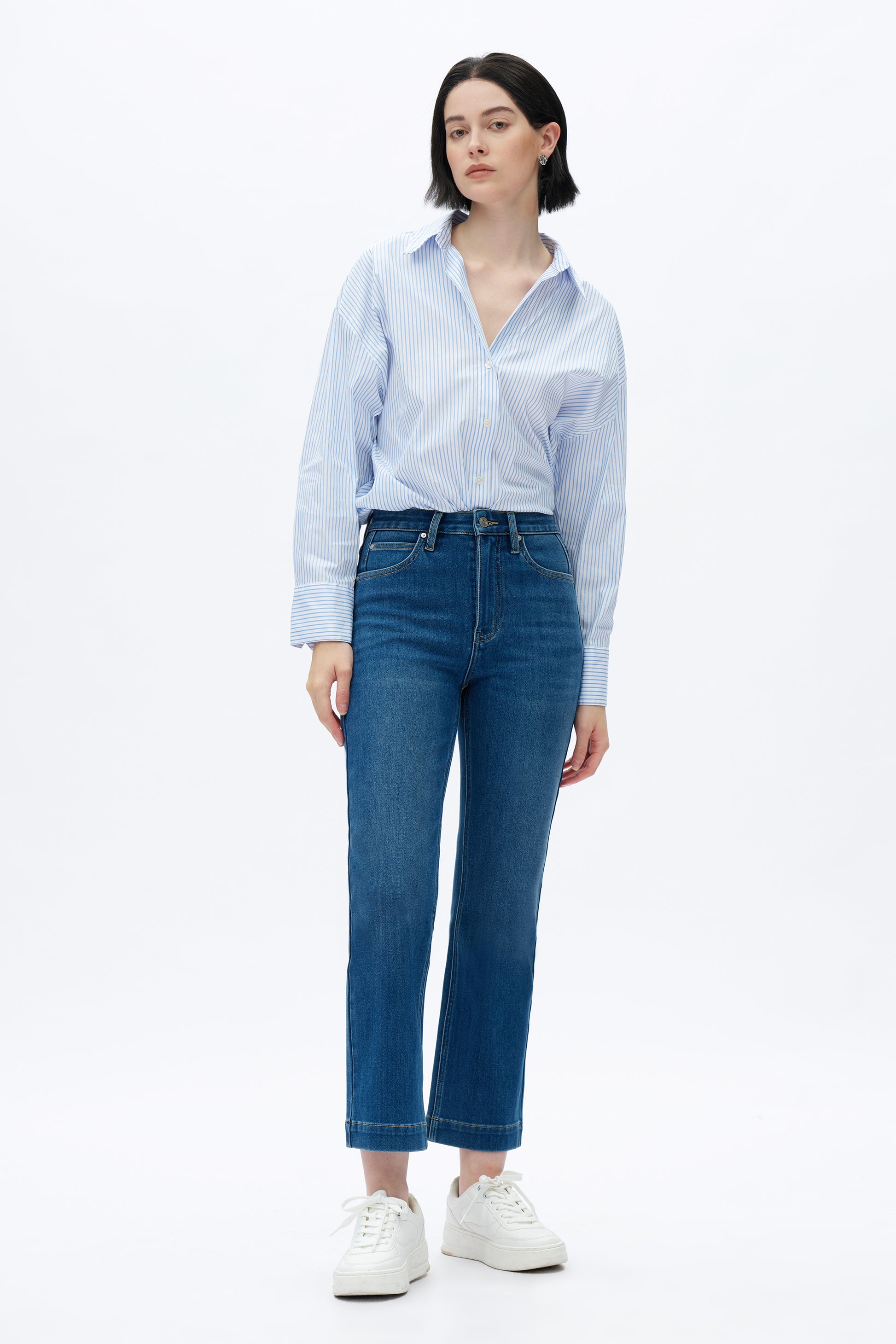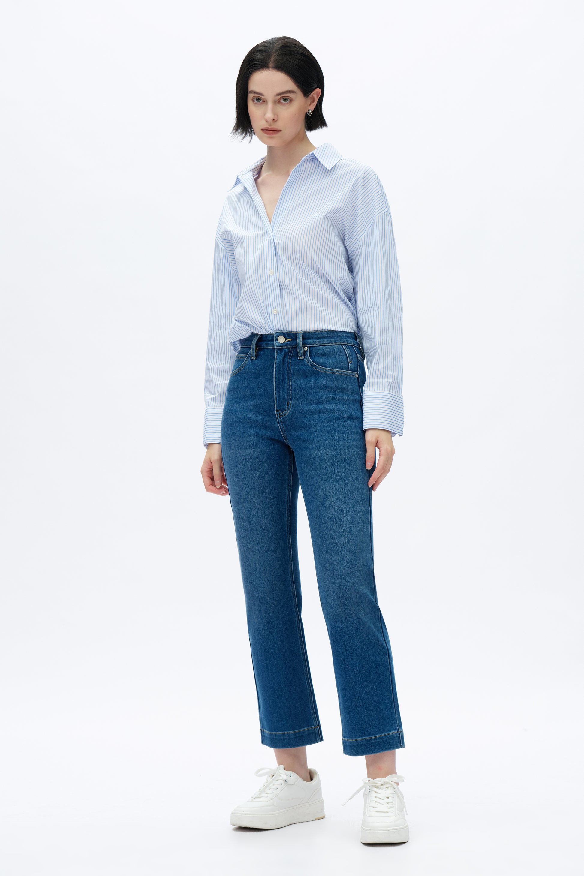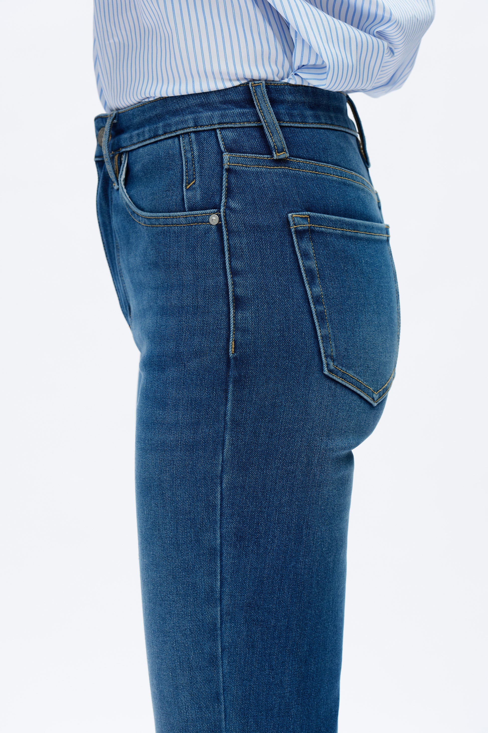 high rise slim straight pants, five-pocket style, zipper closure, front with whisker and hand-faded finish, good stretch for comfortable wear