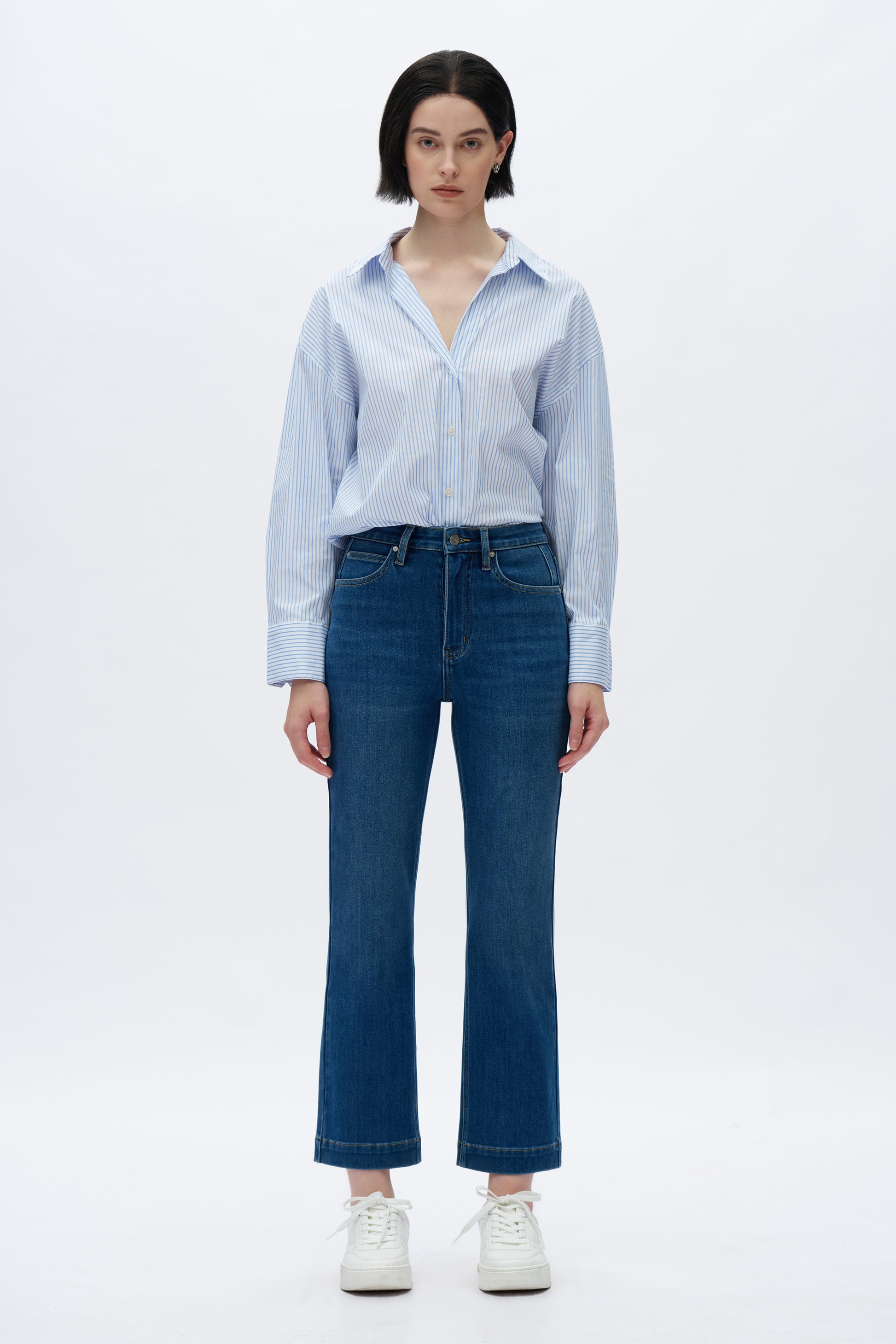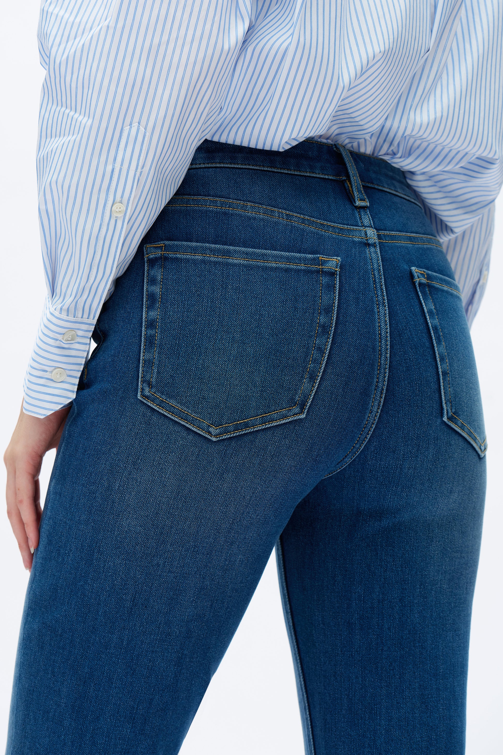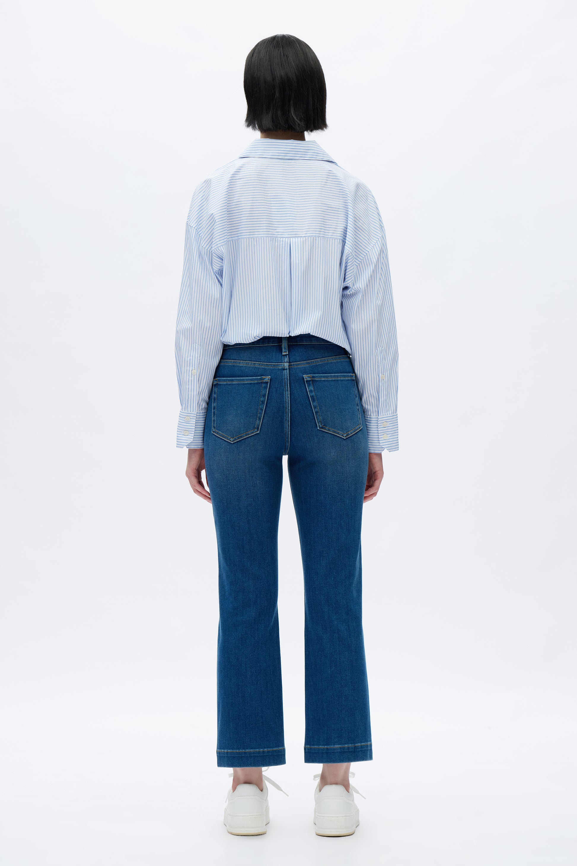 high rise slim straight pants, five-pocket style, zipper closure, front with whisker and hand-faded finish, good stretch for comfortable wear