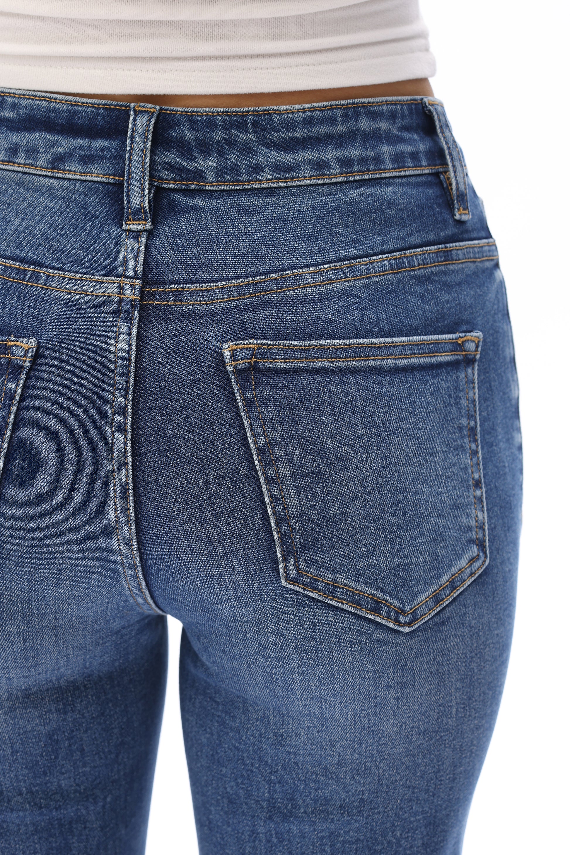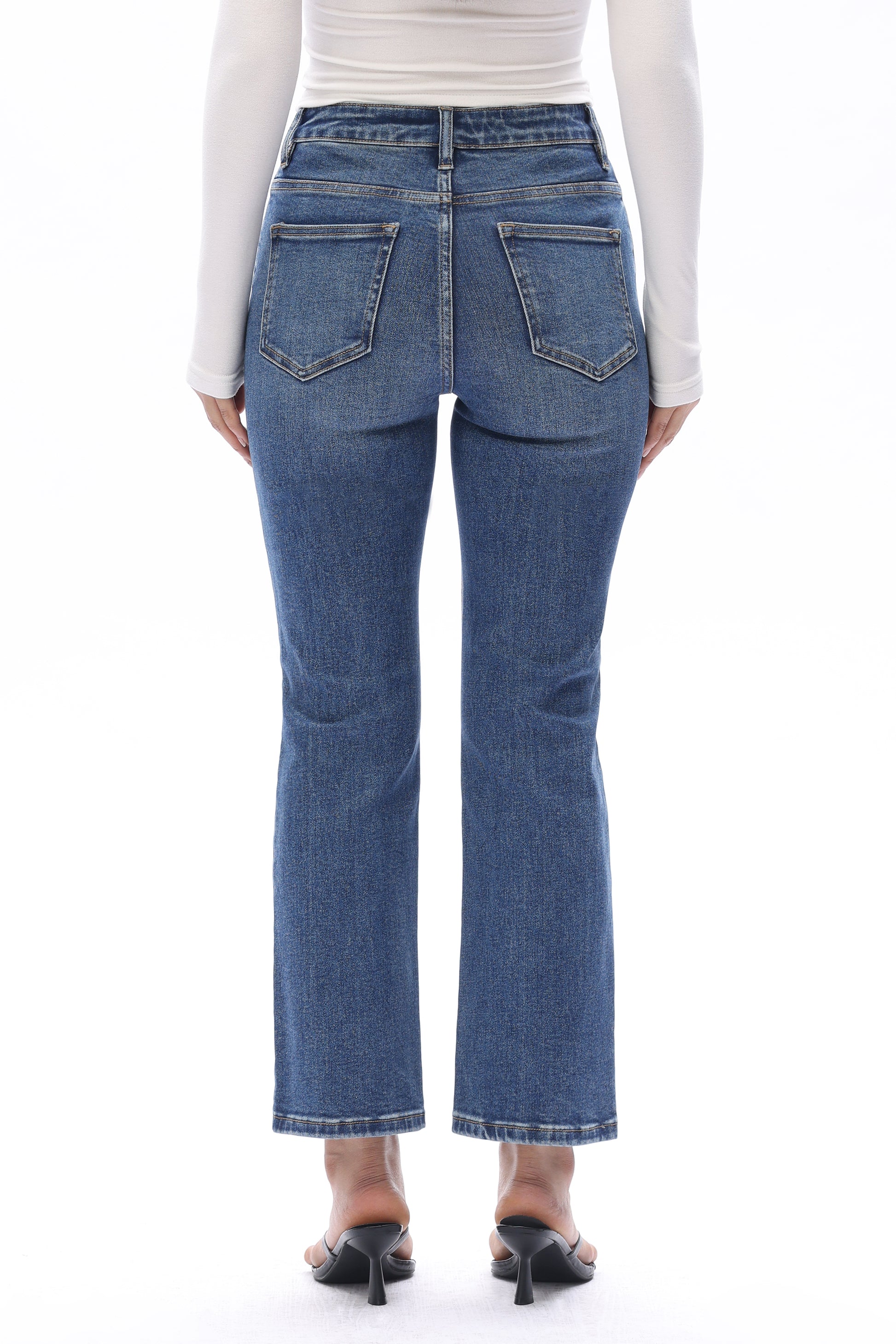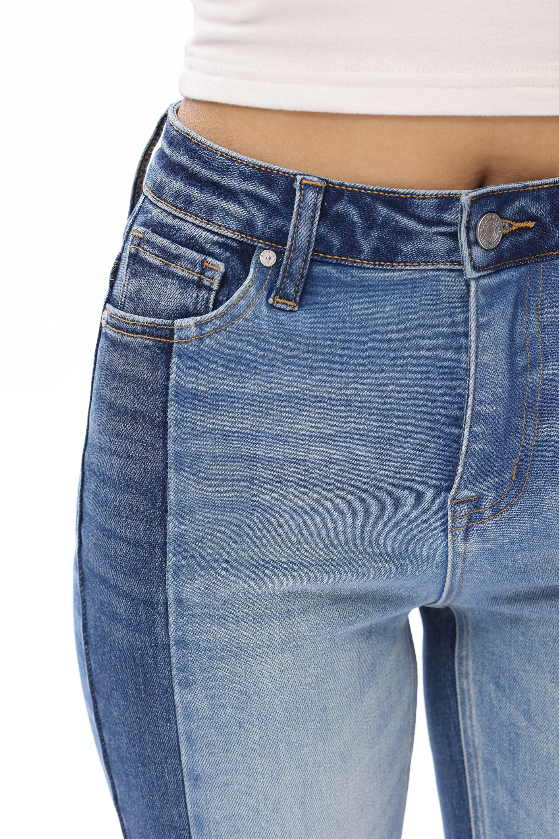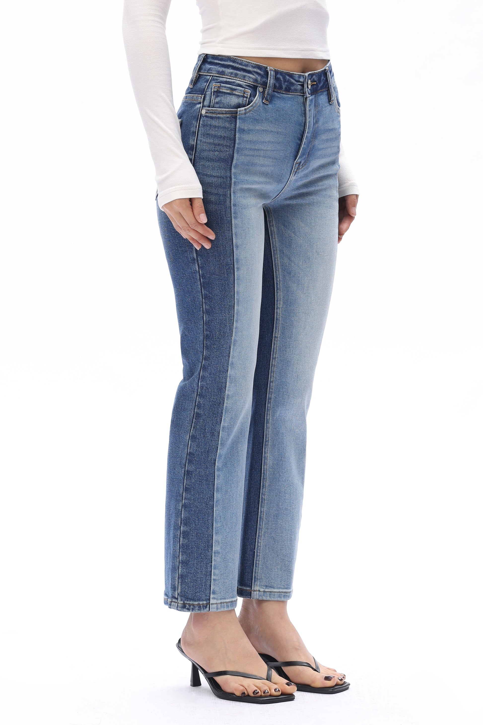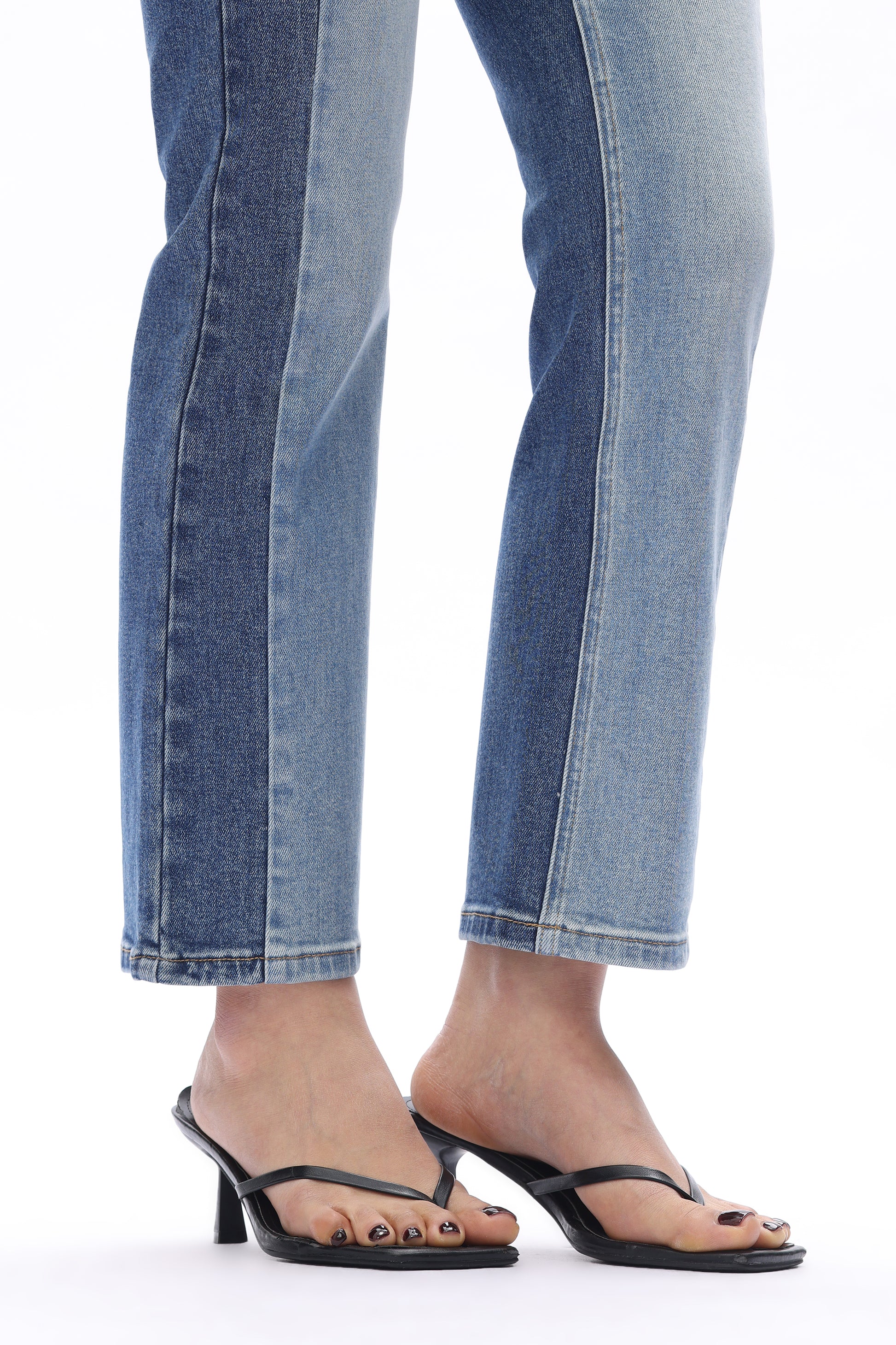 High rise straight jeans with a classic five-pocket design, featuring a distinctive two-tone paneling that creates a striking colorblock effect, delivering bold visual contrast within a clean, minimal silhouette.