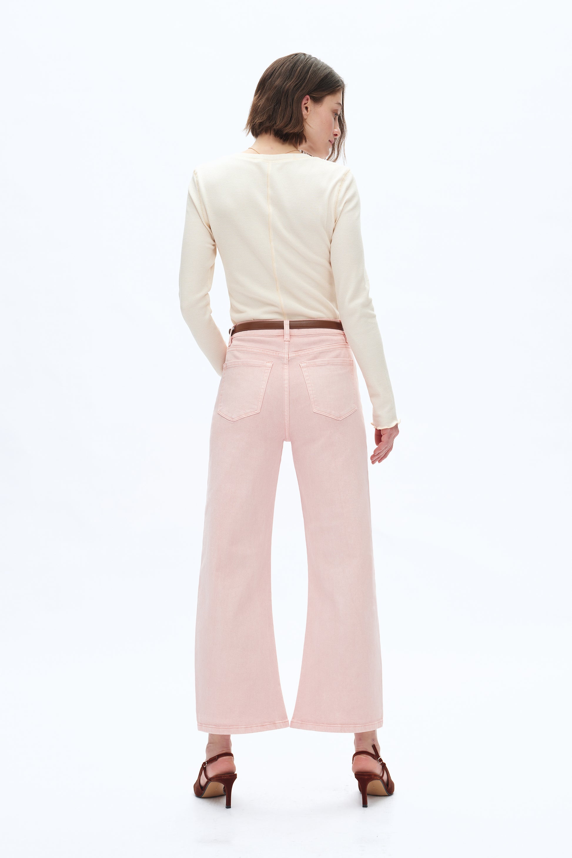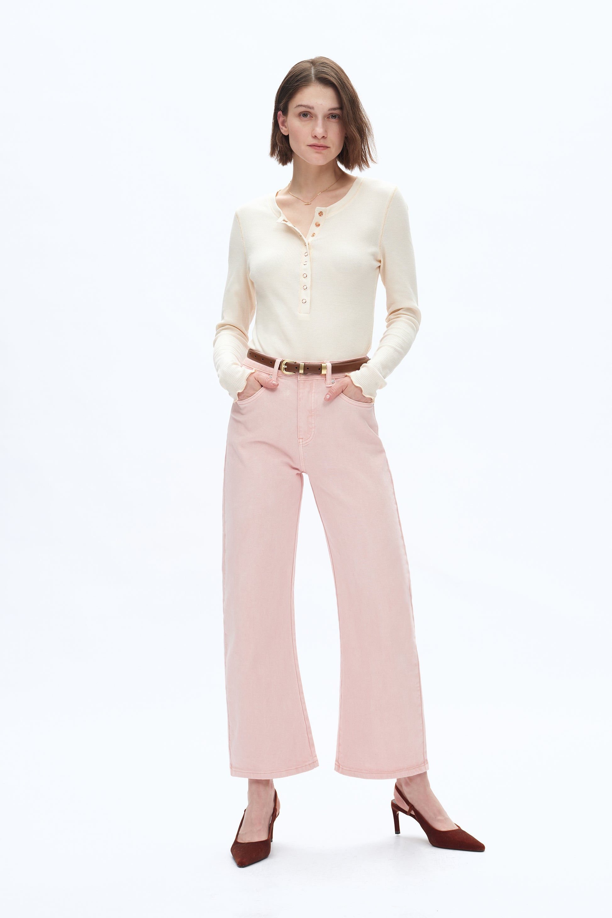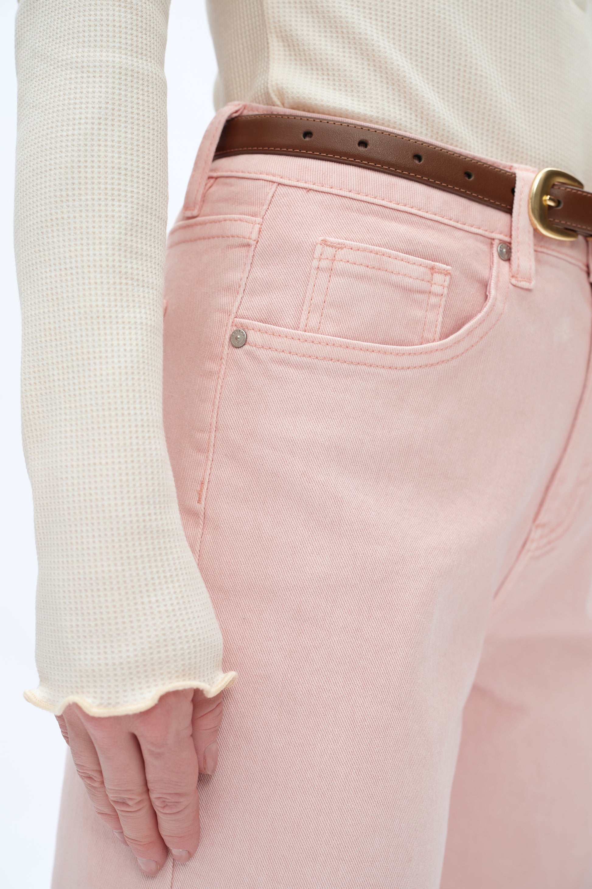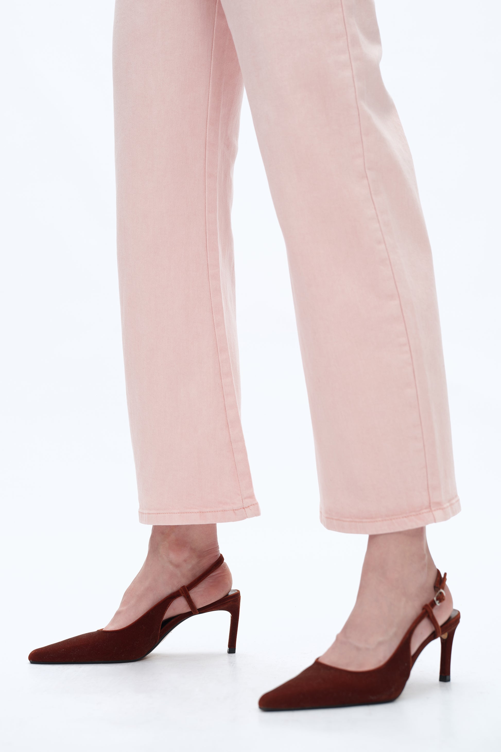 Essential item made from stretch fabric, featuring a practical mid-rise fit, in pearl pink. It has a button closure, five pockets, and tapered legs.