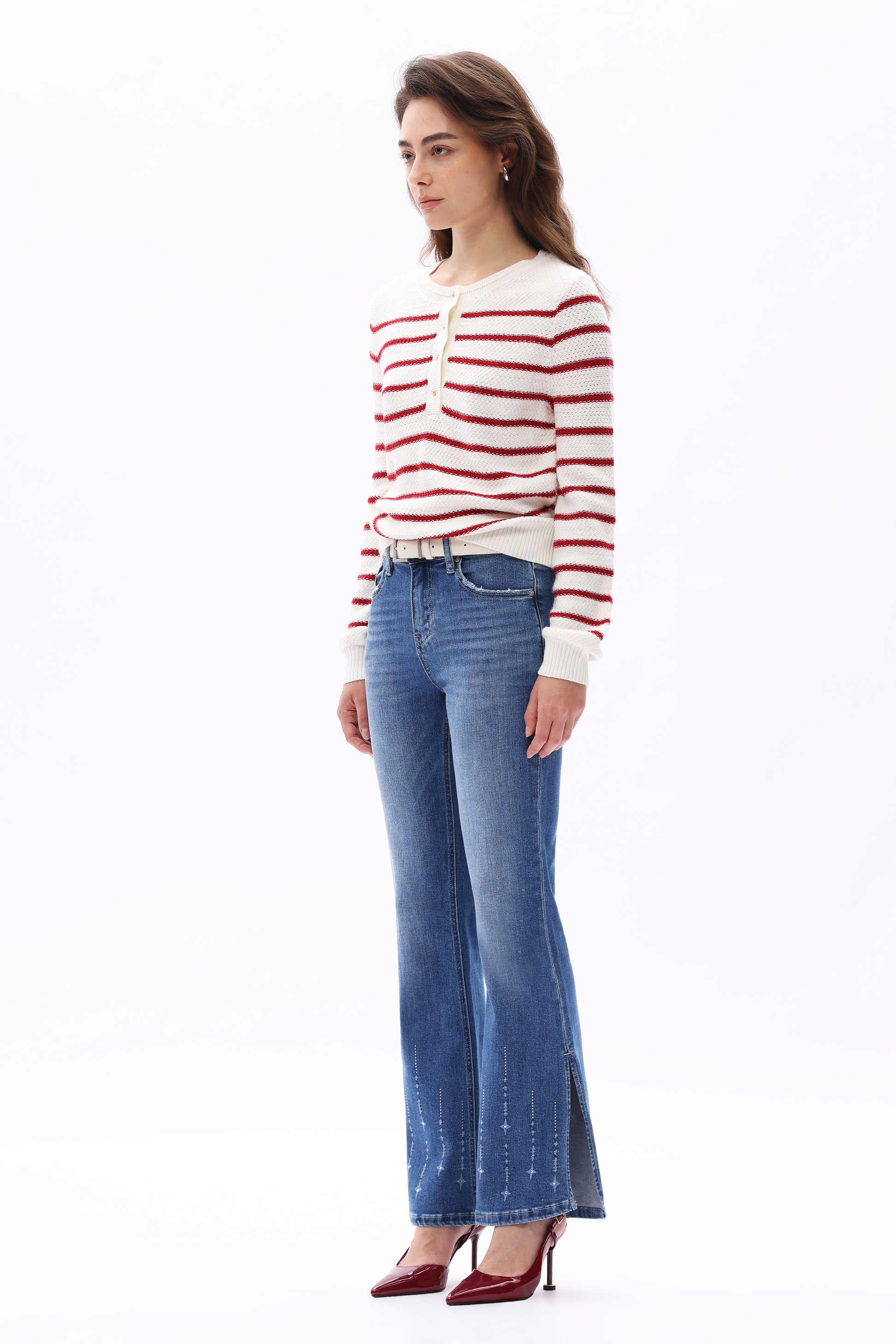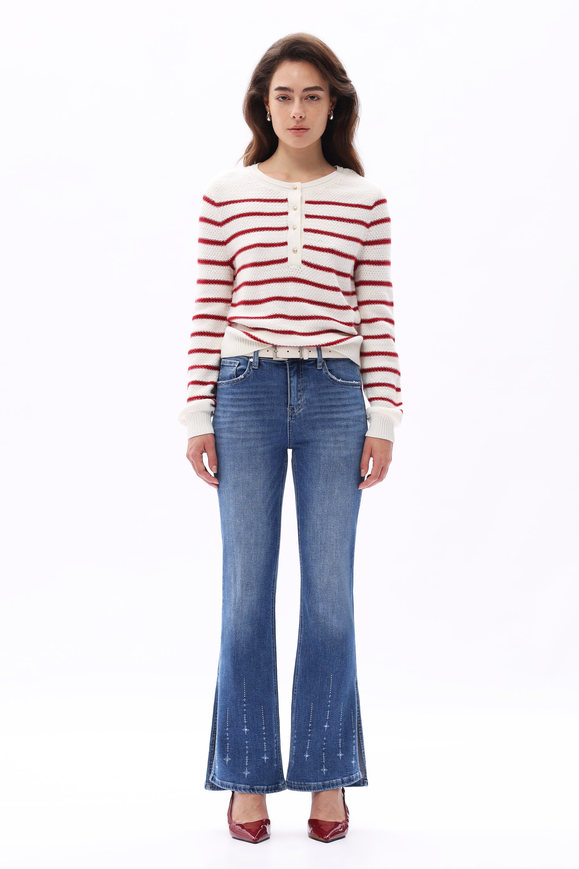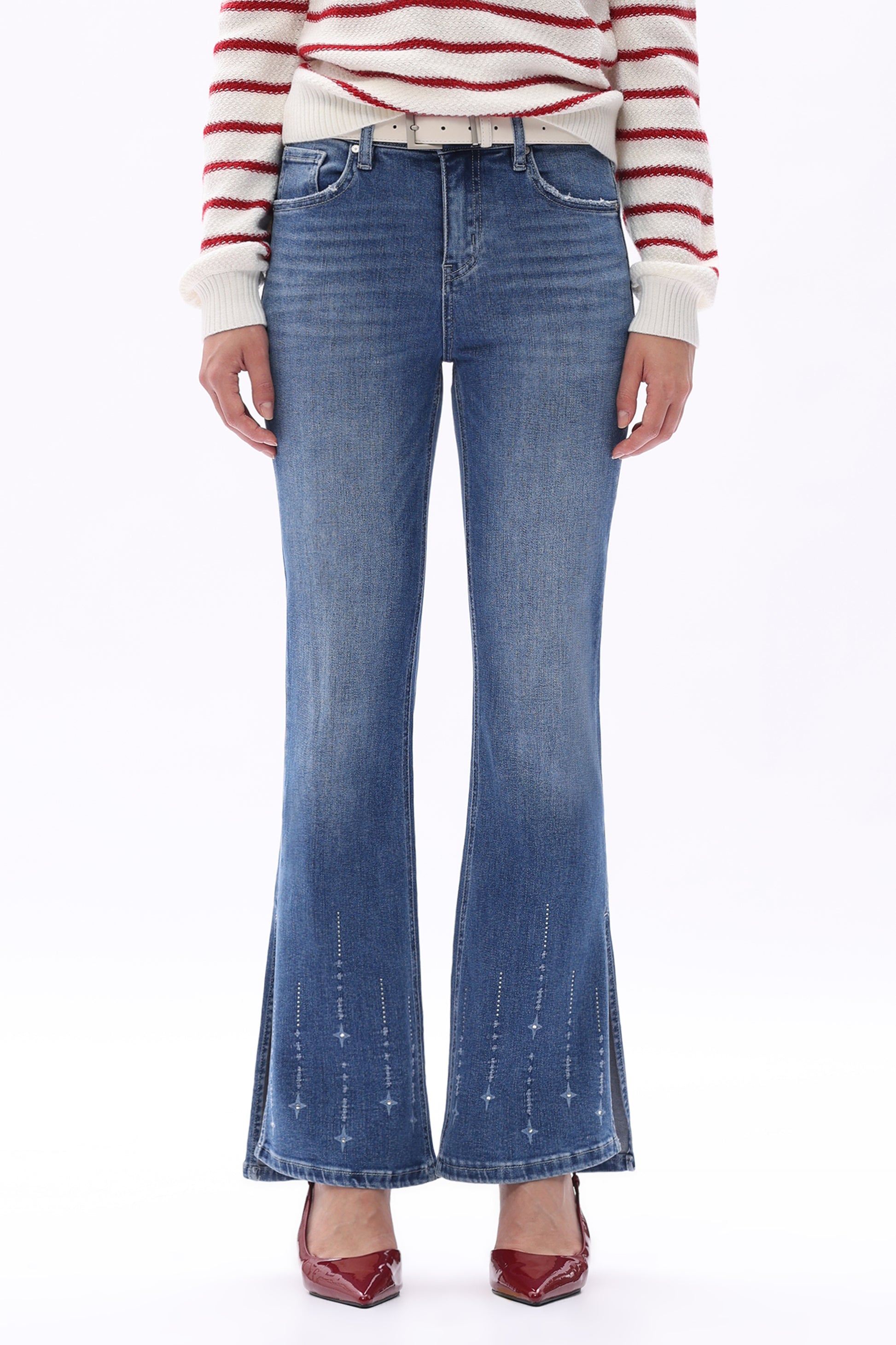 Mid Rise Flare Denim Jeans with Slit Hem,Laser bleached star motifs cascade from the flared leg opening, finished with crystal-accented slit detailing for edgy retro glamour.
