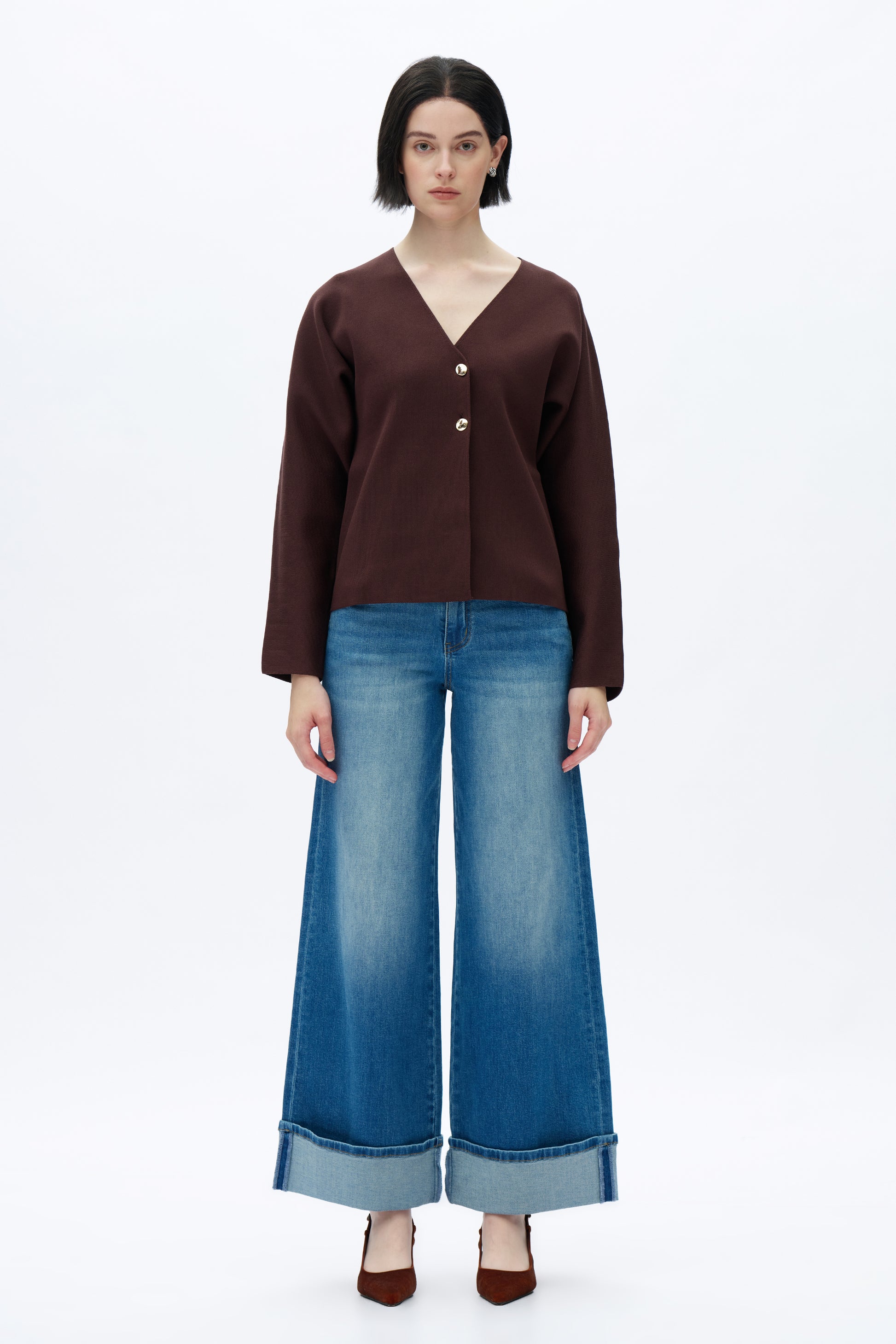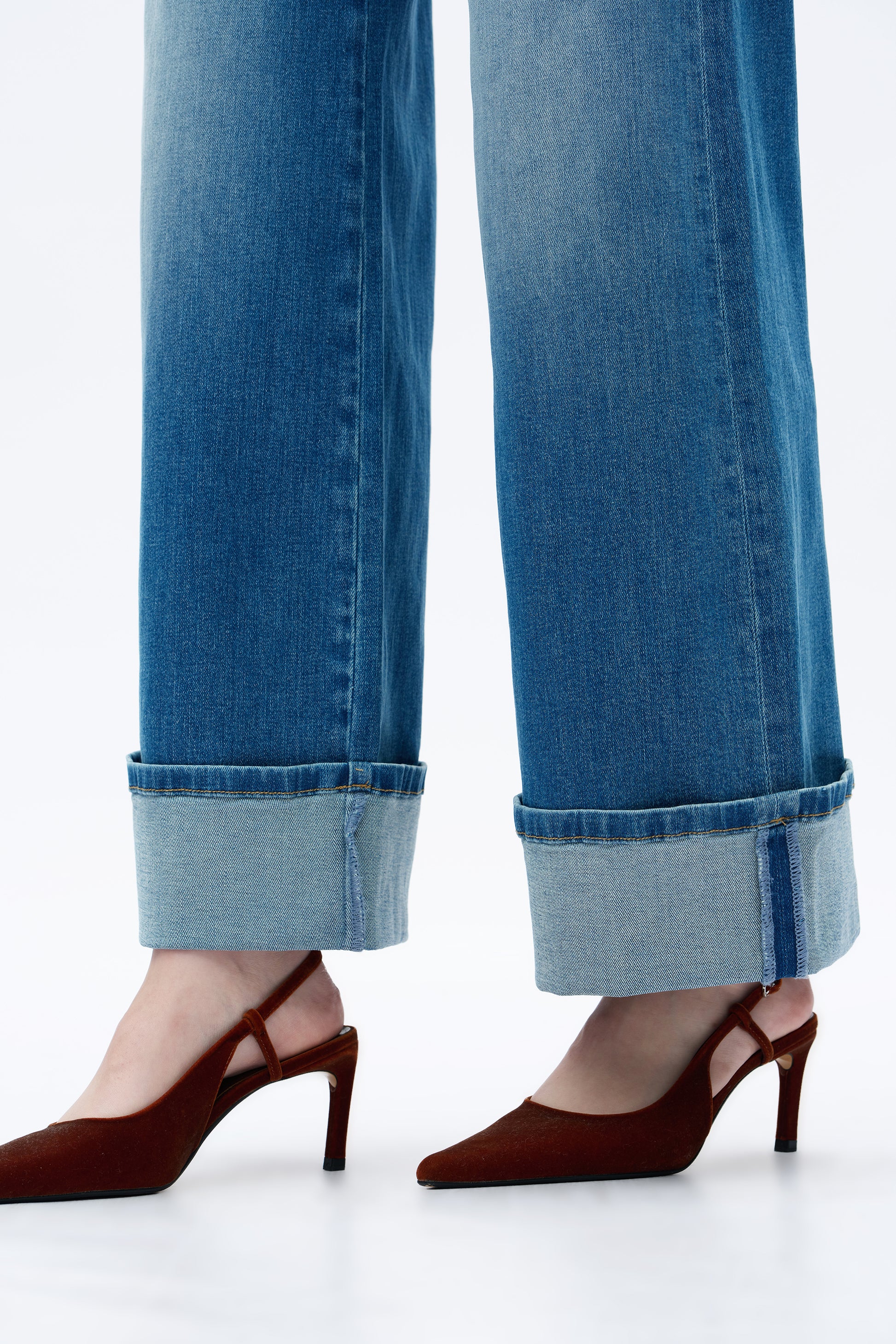 Mid-rise, floor-length wide-leg trousers, featuring a loose silhouette and deep blue color, paired with a Bayeas paper tag.