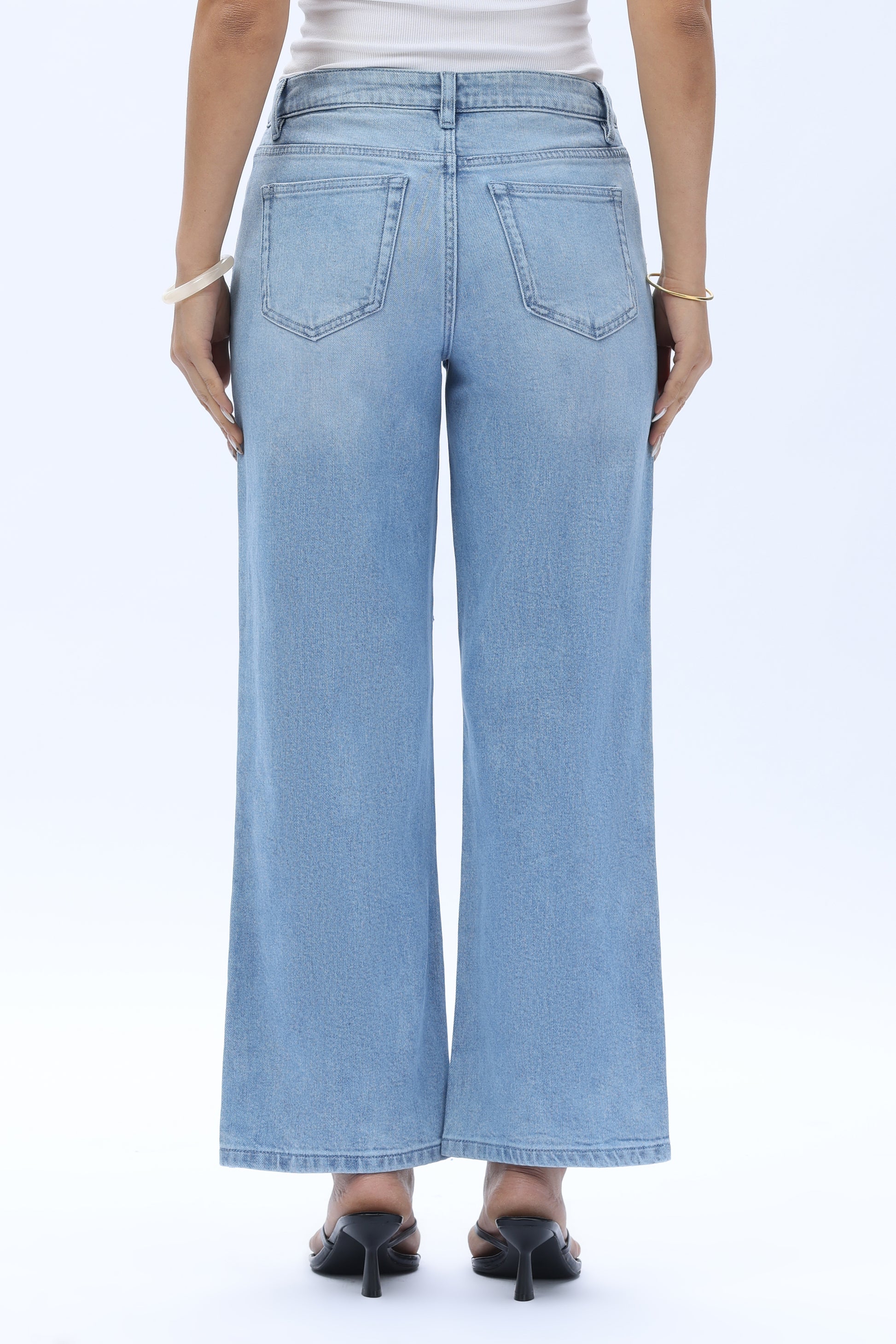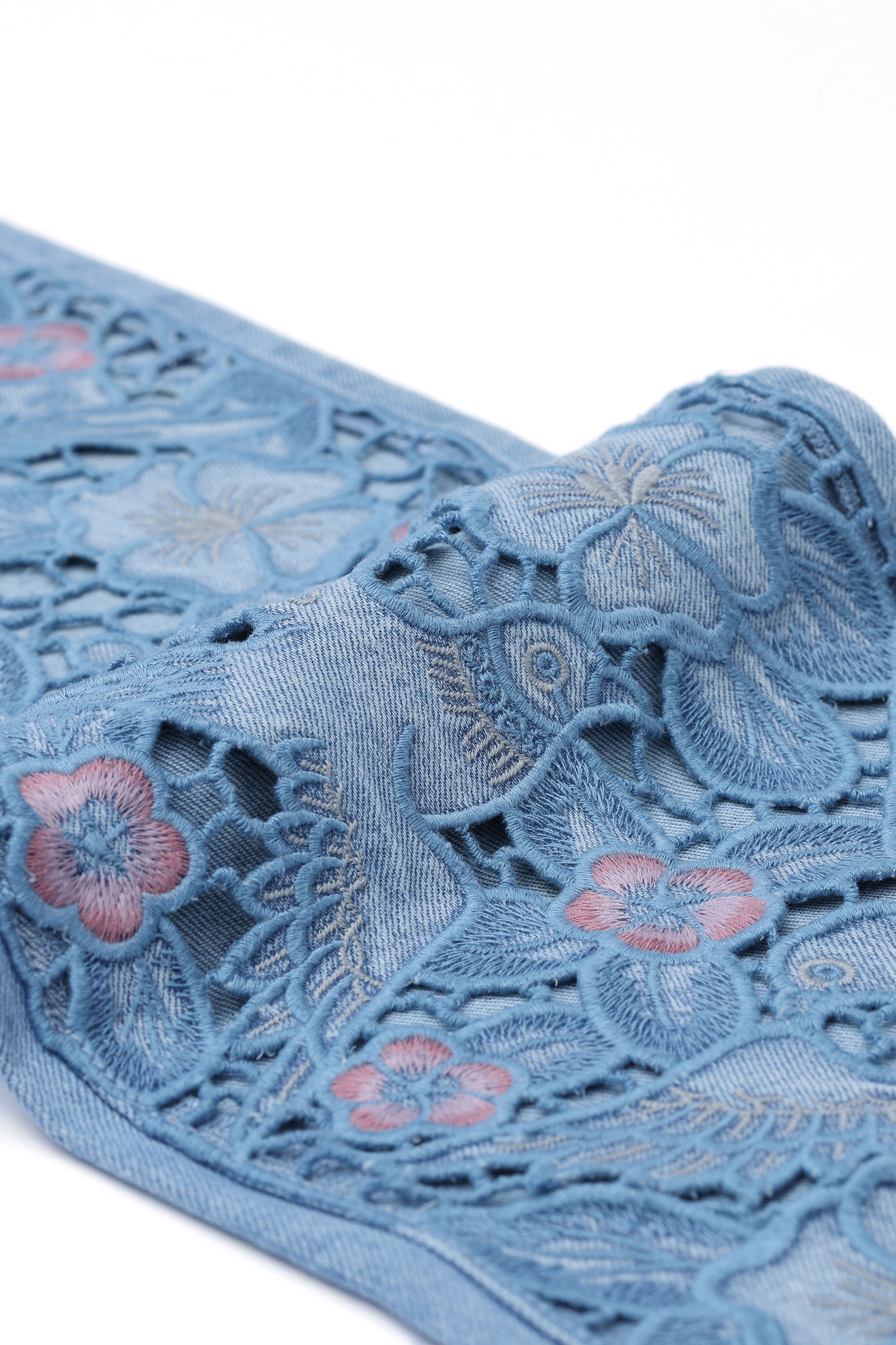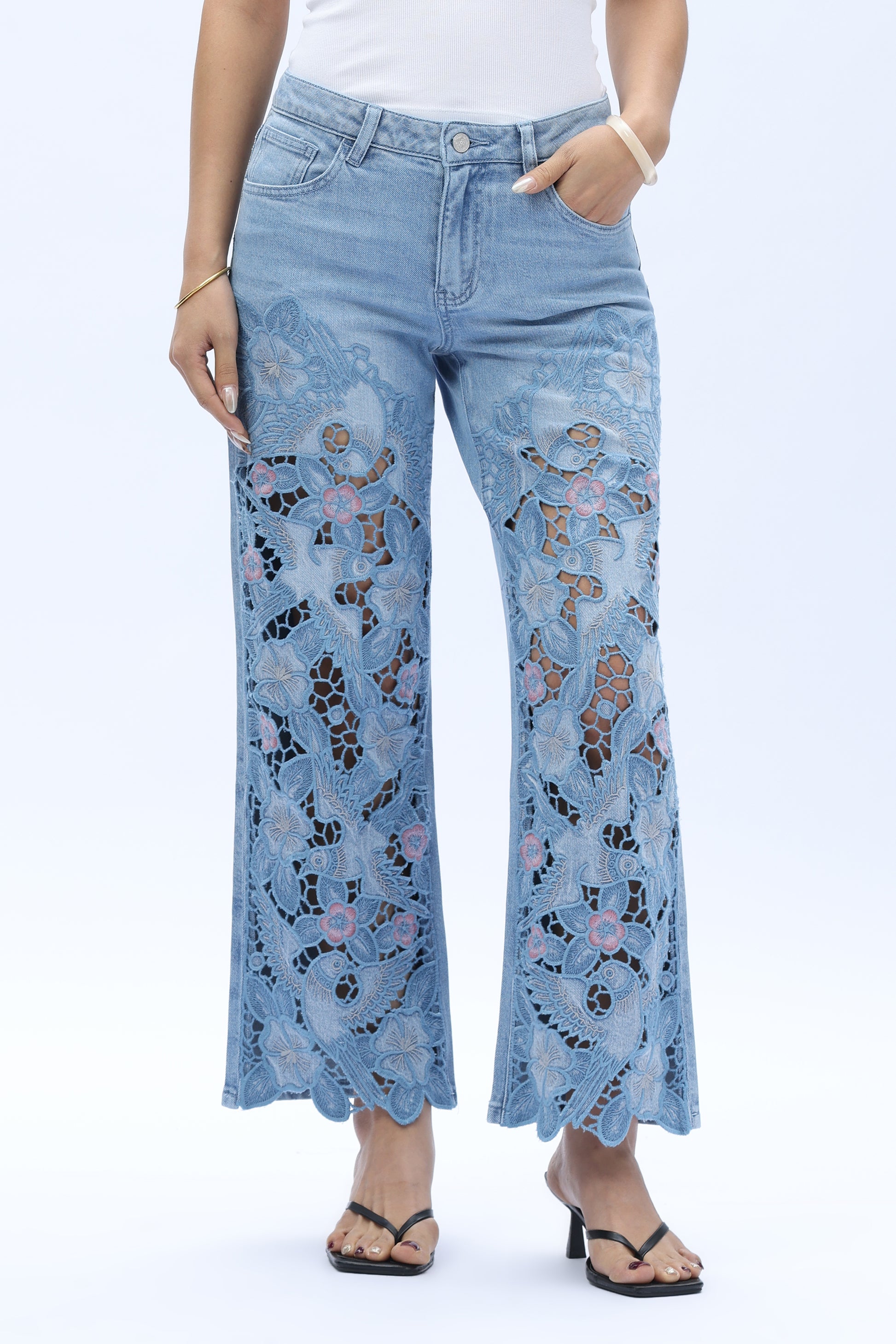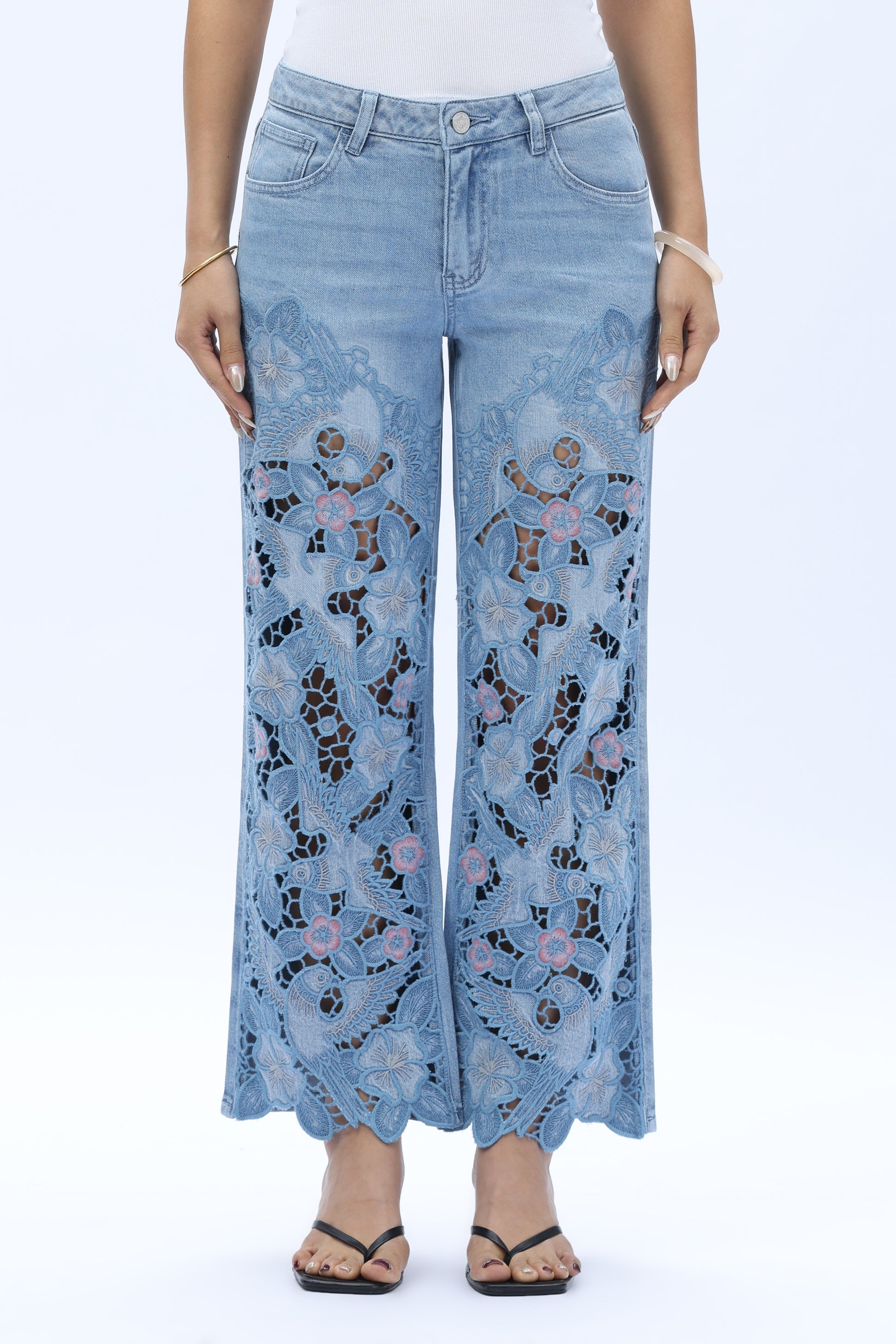 Mid rise straight,classic five-pocket style, light blue wash, featuring intricate vintage-inspired floral and bird embroidery for a fresh and elegant look.