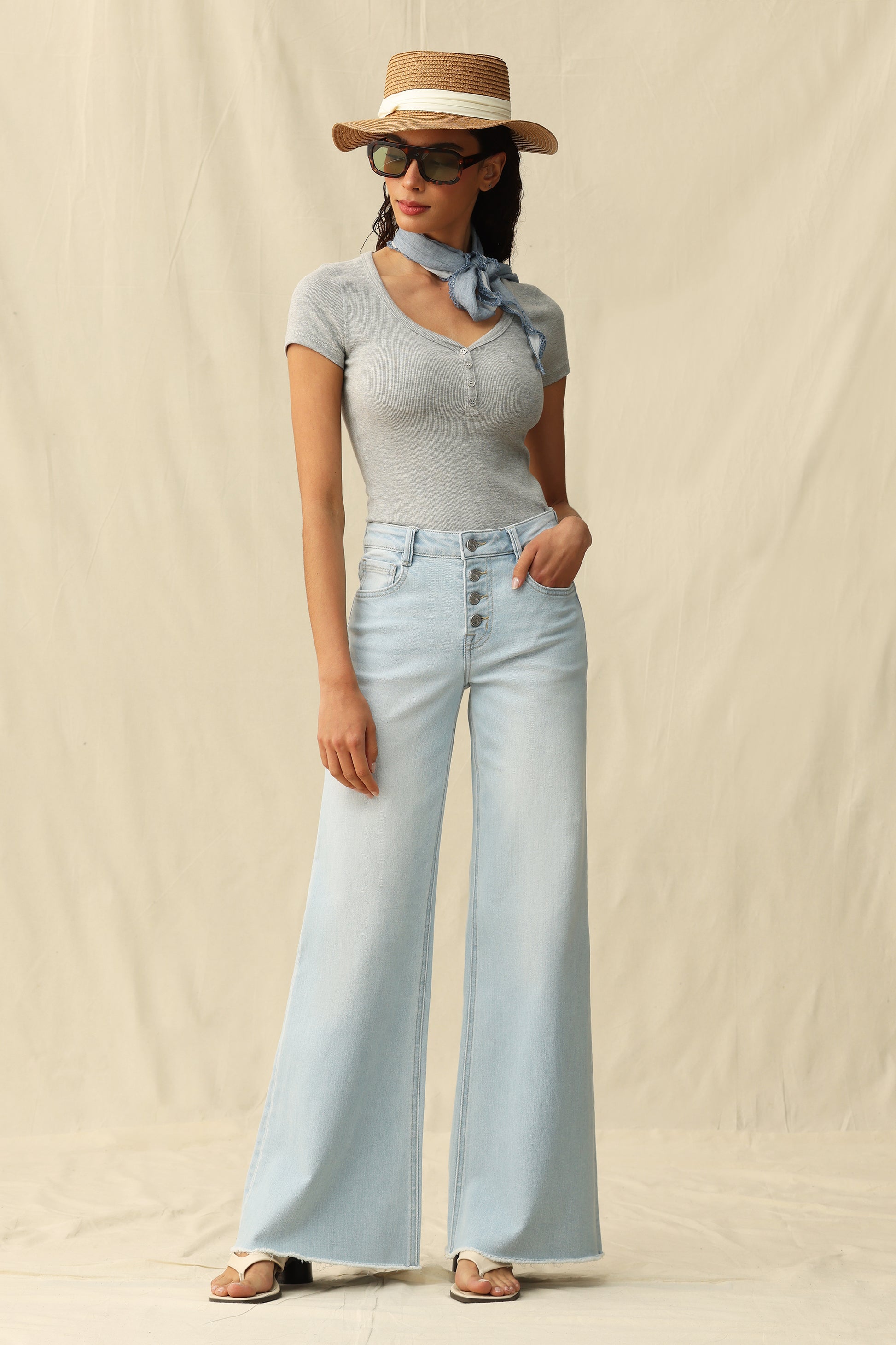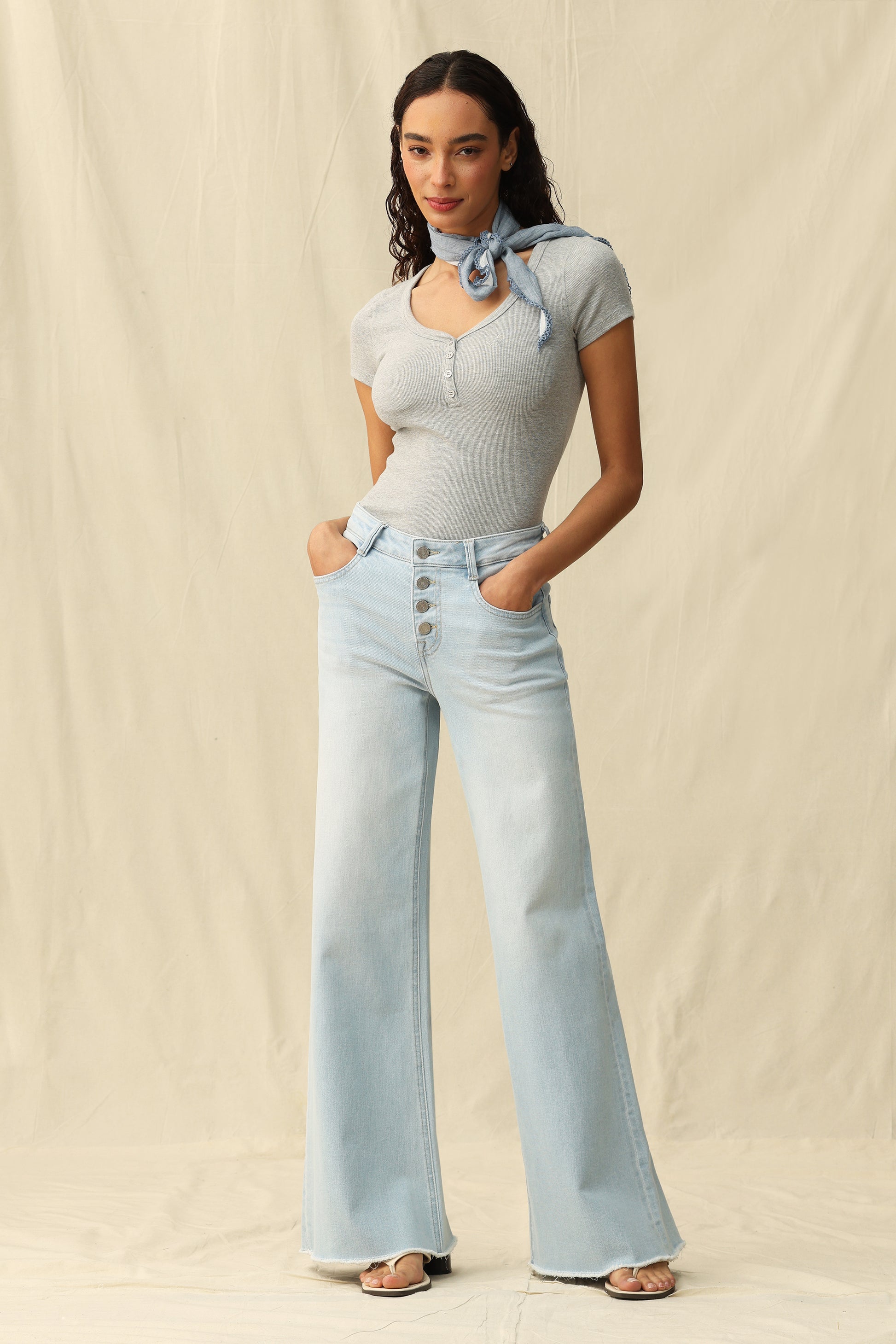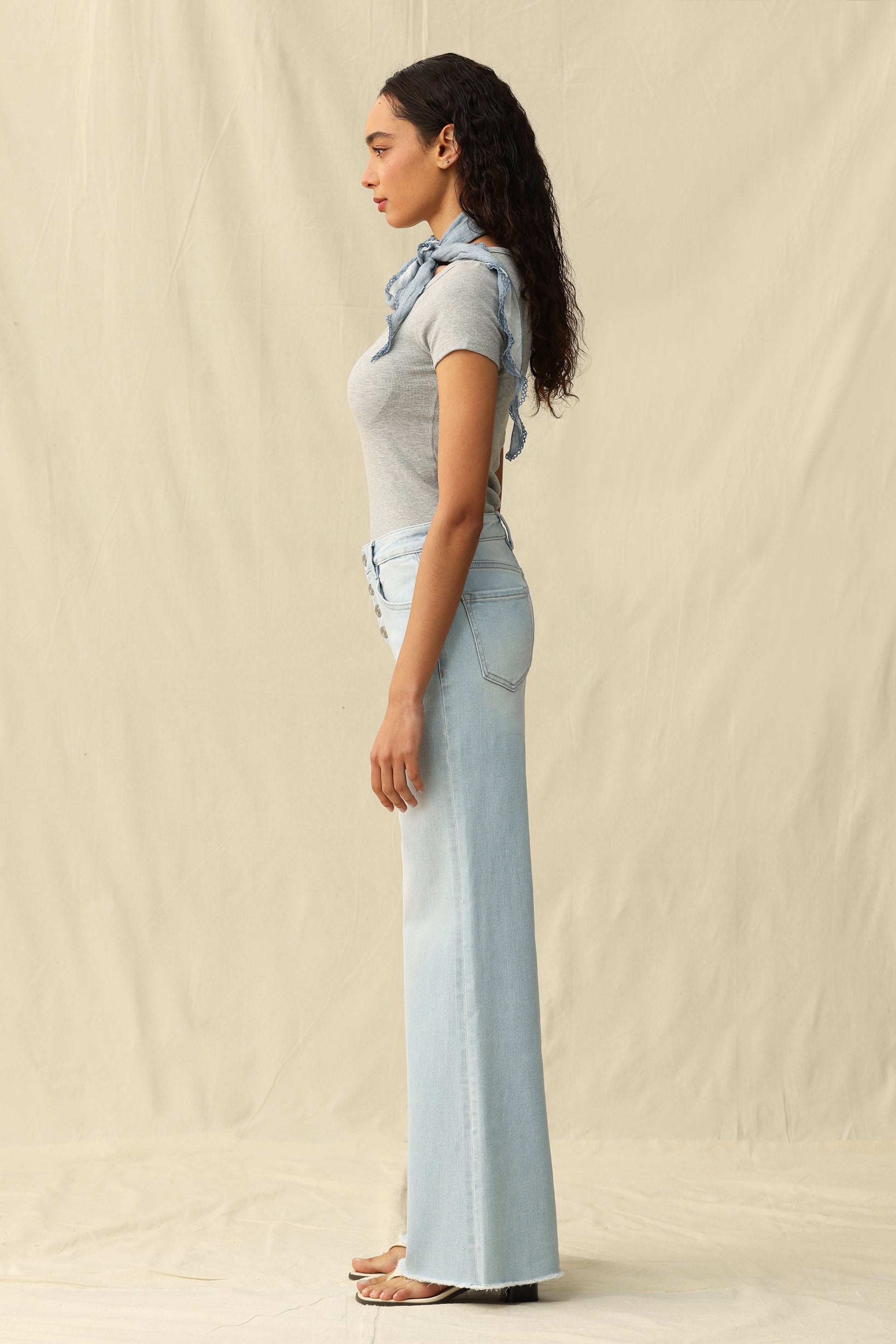 Mid rise wide leg denim jeans, light blue basic wash, classic five-pocket design, raw cut hem.