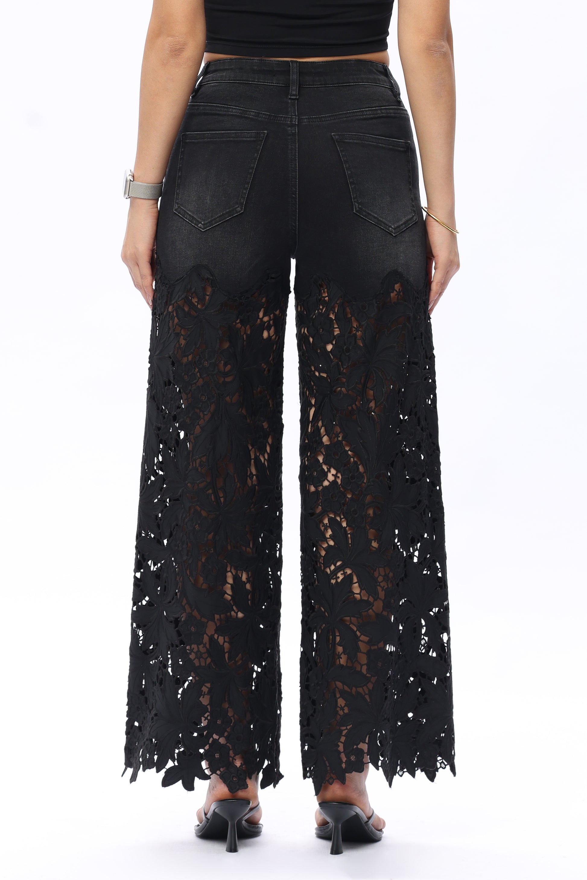 High rise wide leg jeans with unique lace paneling, deep hue style accents, and pearl embellishments that catch light at different angles.
