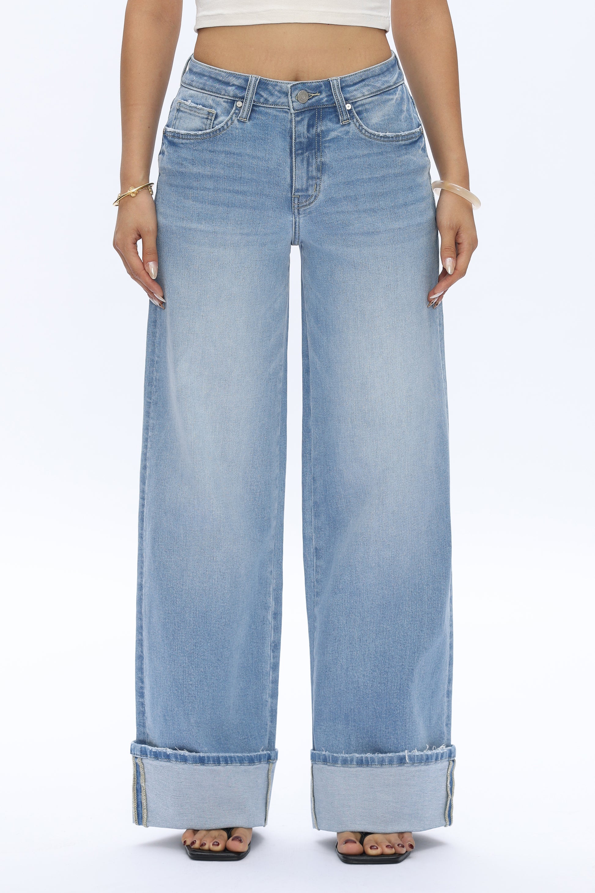 Mid rise wide leg jeans with classic five pocket construction, multiple wash and distress treatments throughout, cuffed hem, and comfortable fabric.