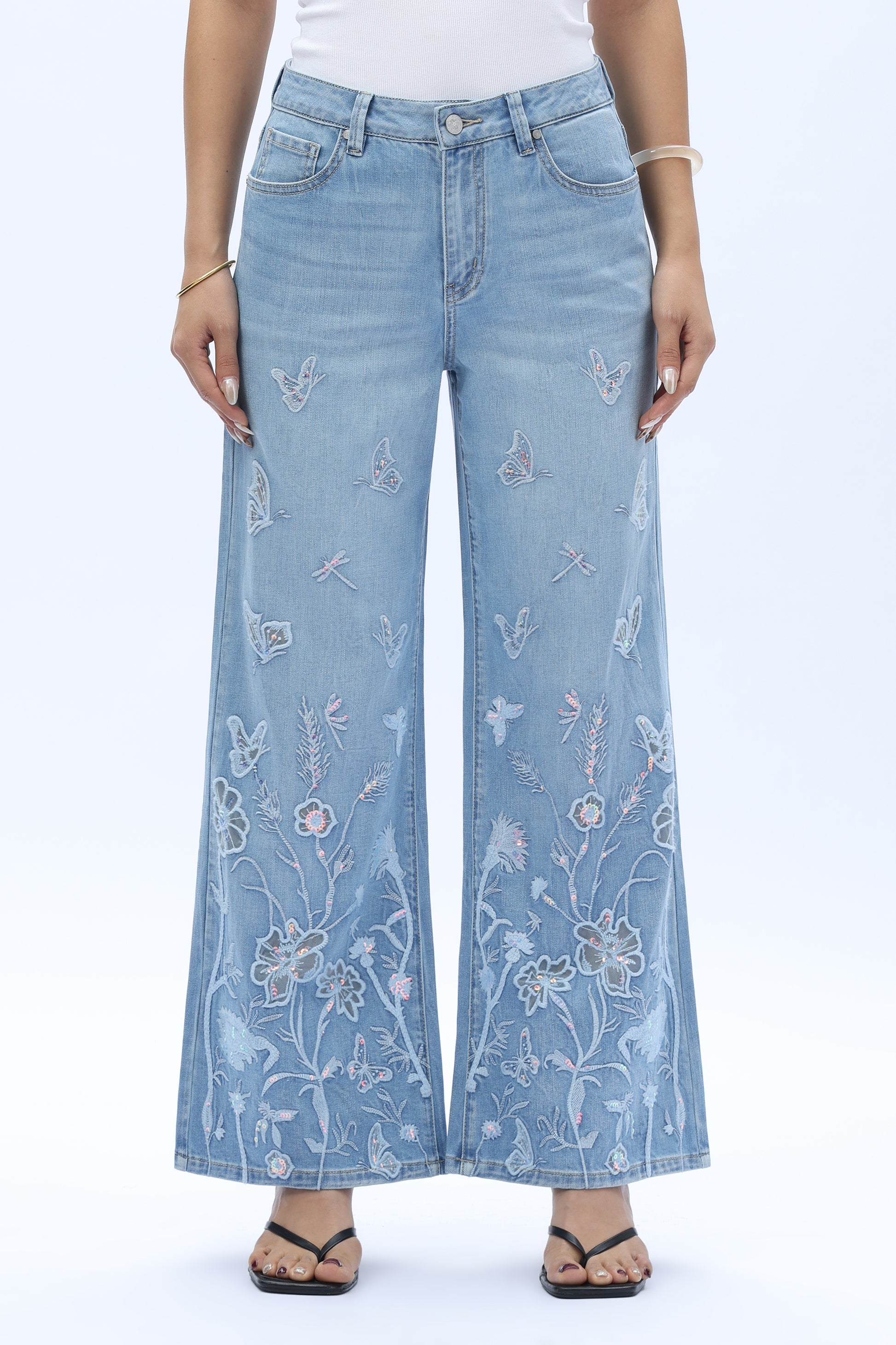High rise wide leg jeans featuring unique embroidery detailing for a distinctive style and one of a kind aesthetic.