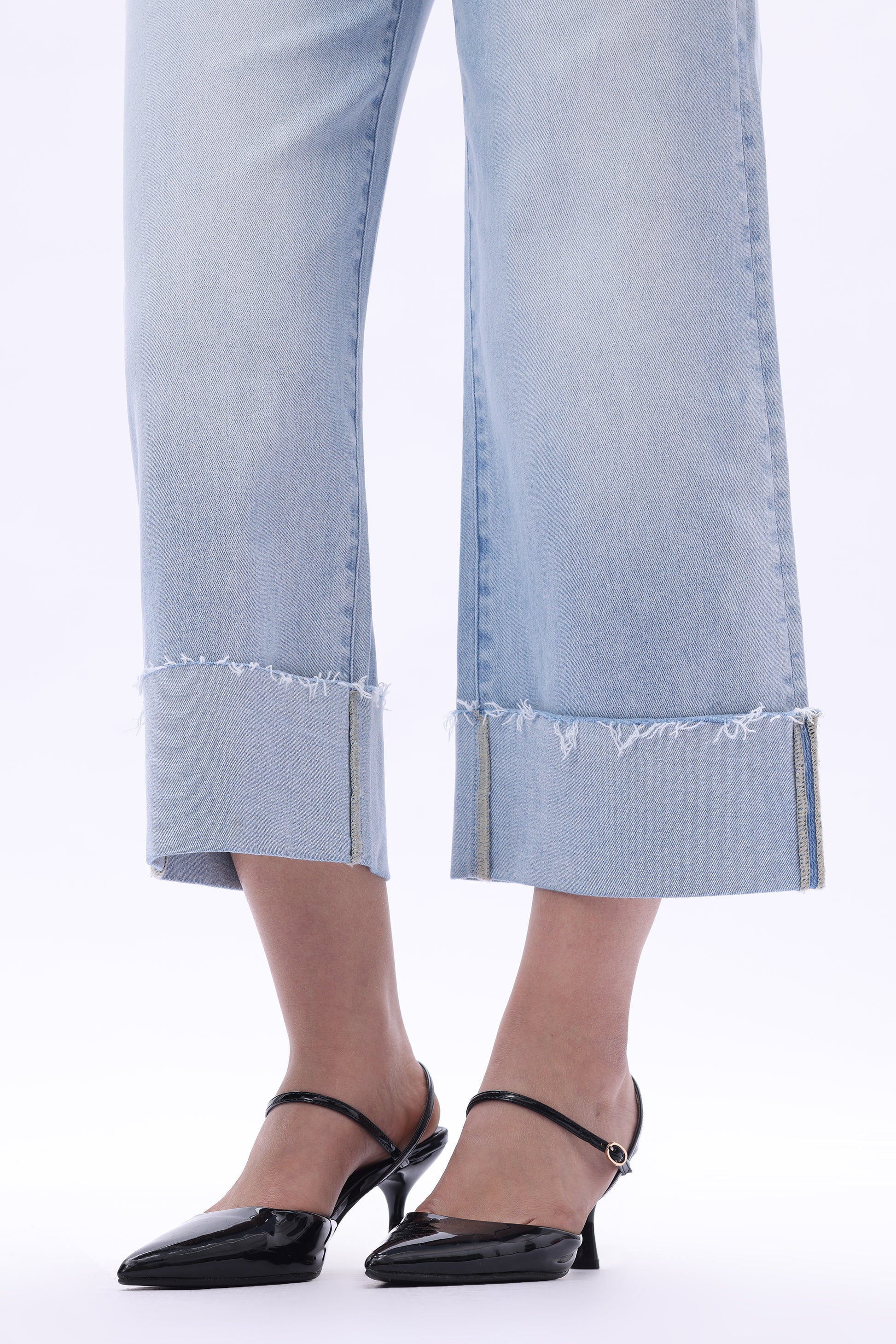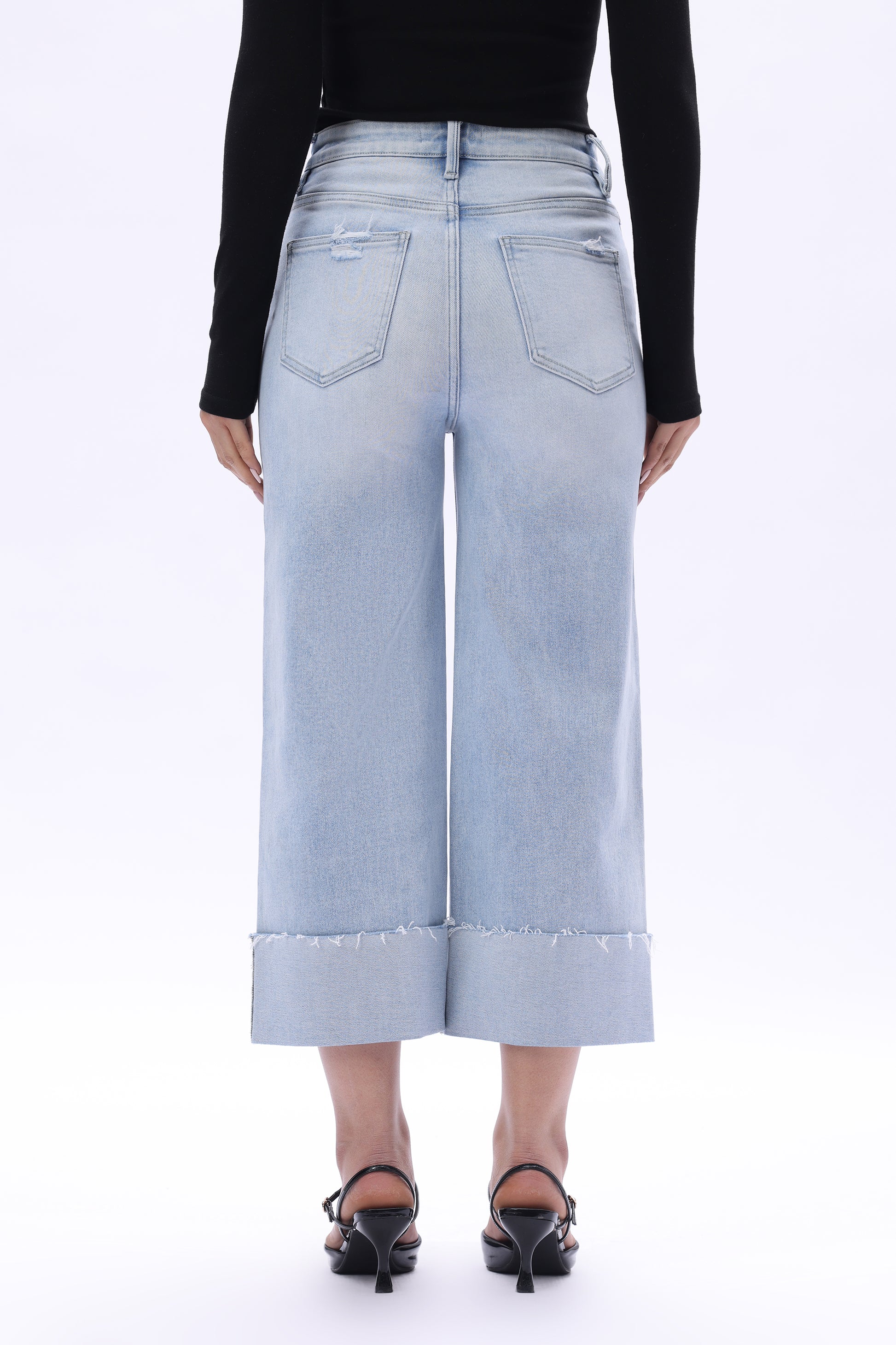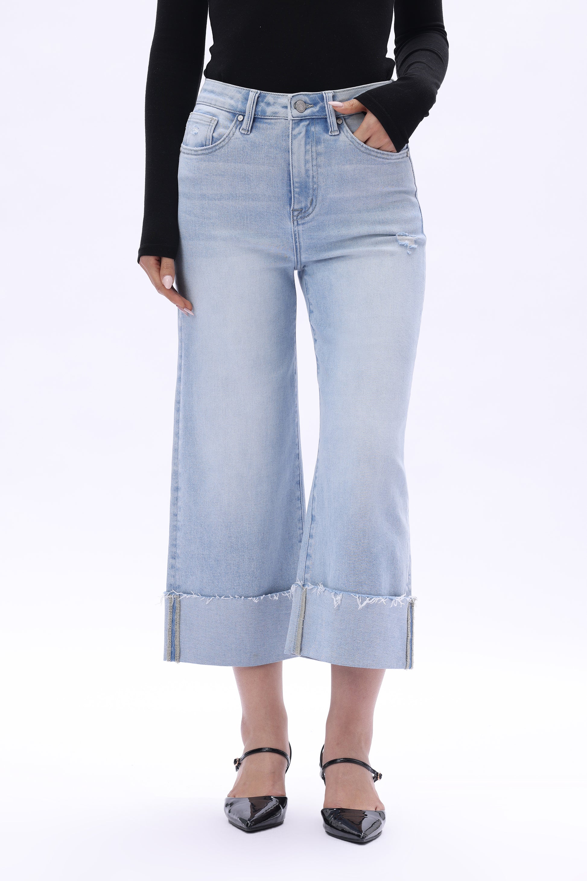 High rise cropped wide-leg jeans cuffed hems five pocket style mid-blue wash relaxed fit with good stretch.
