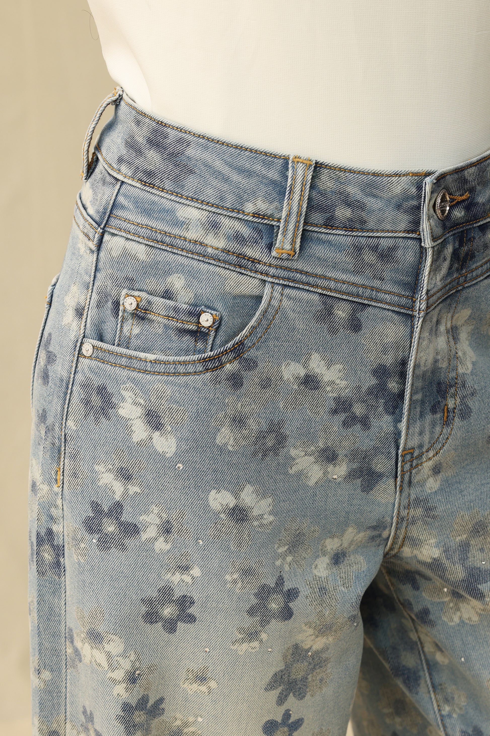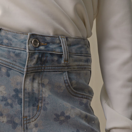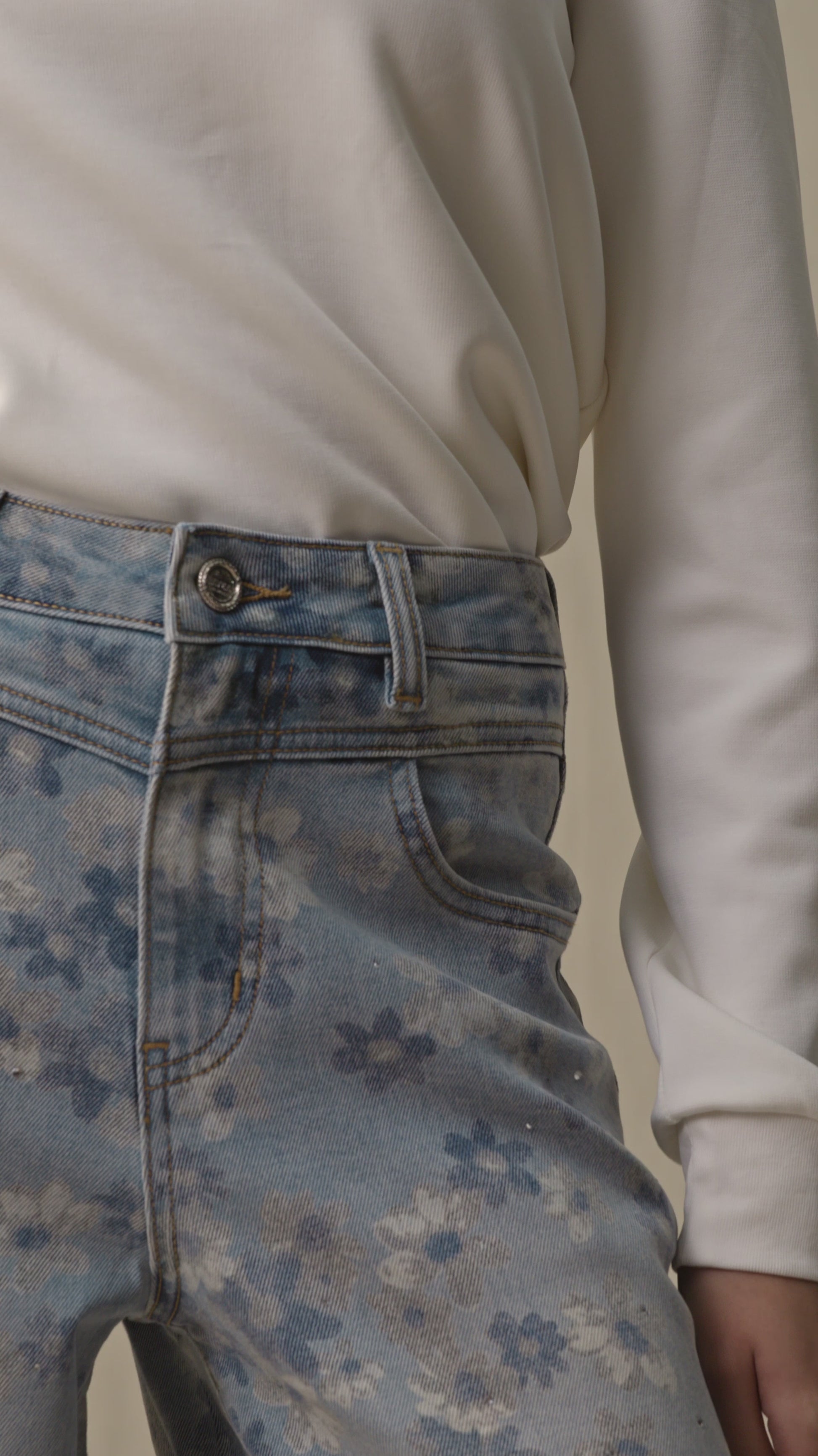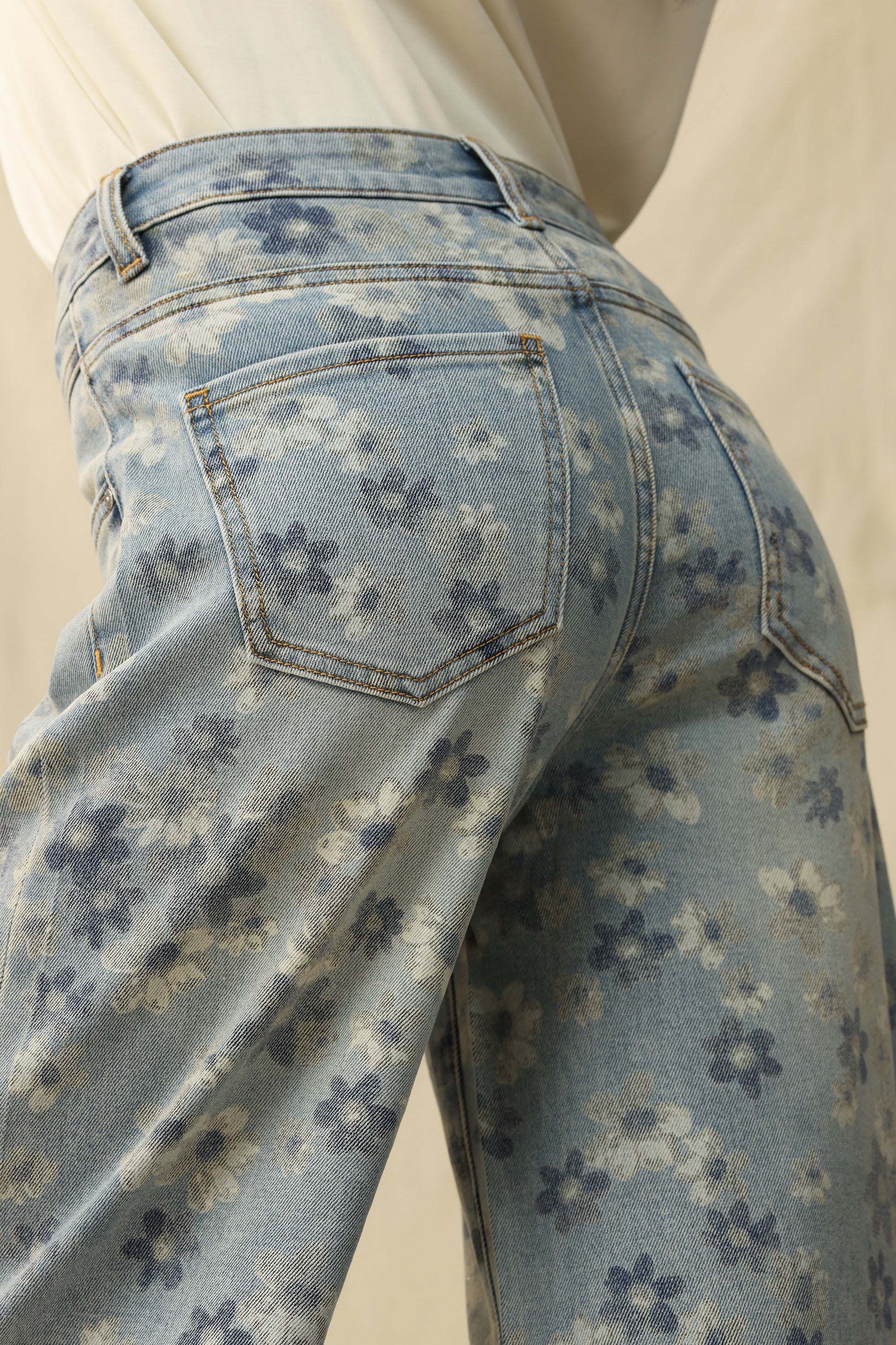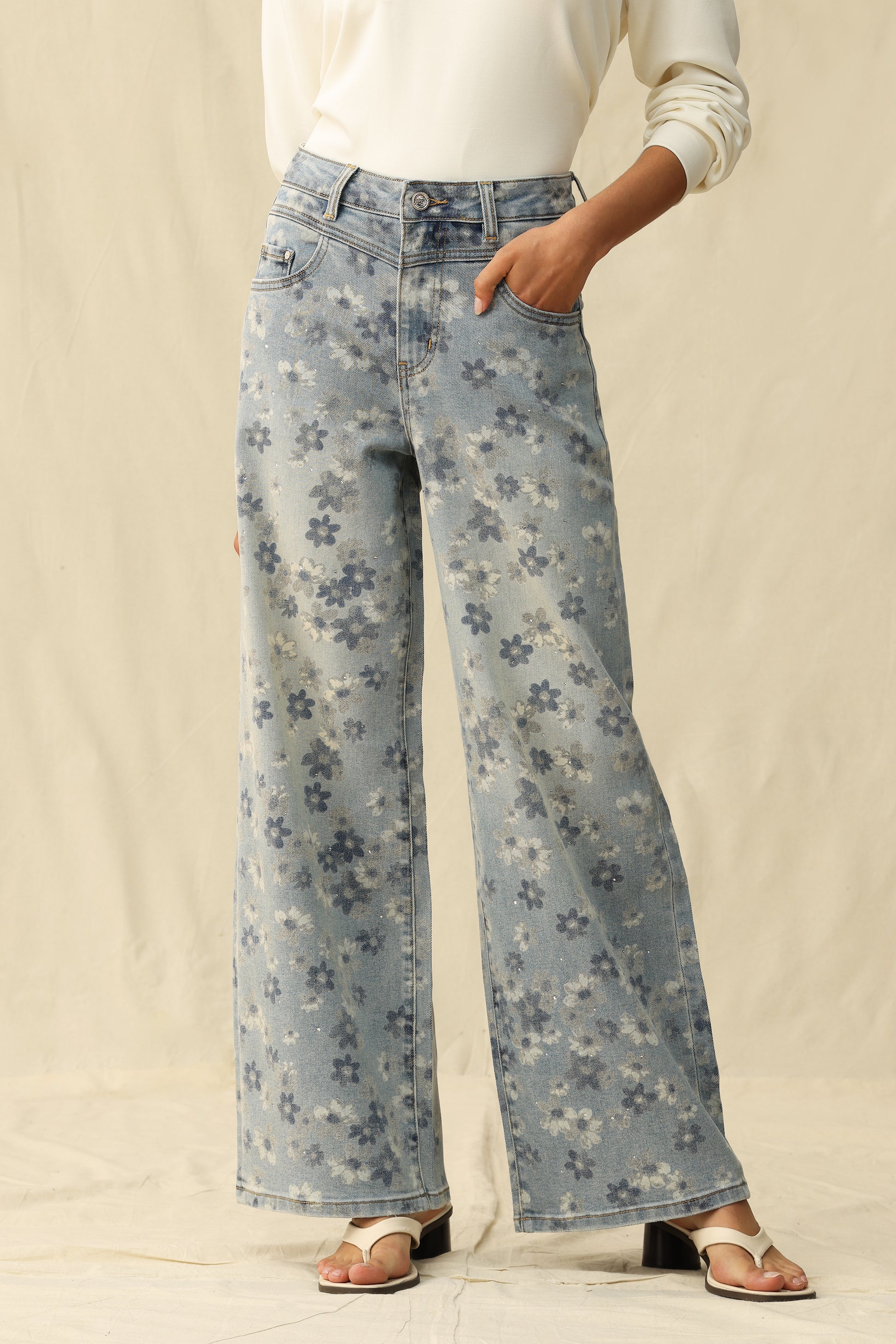 High rise wide leg jeans in a subtle colorway with overlapping daisy motif design and decorative paneling details.