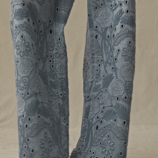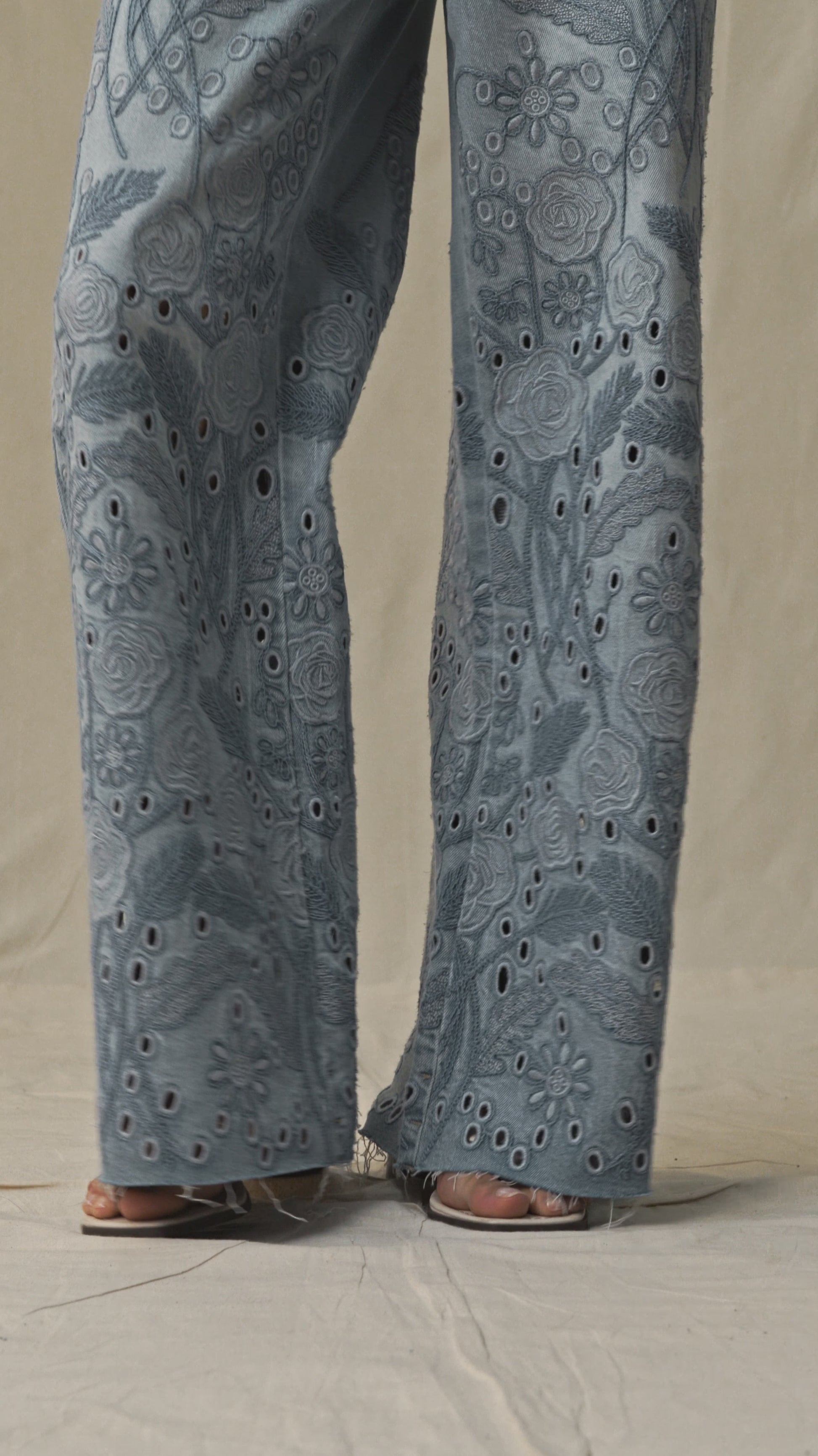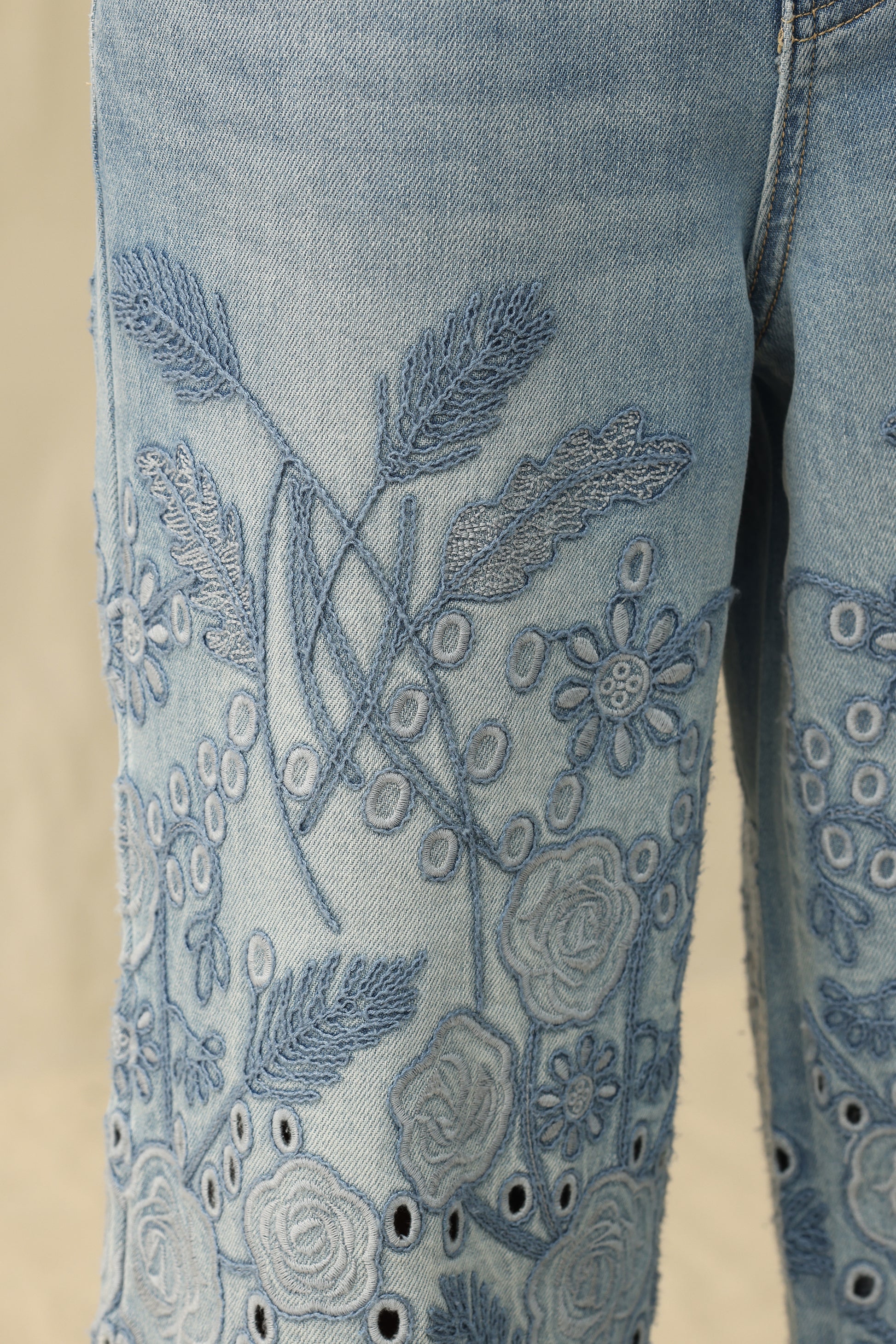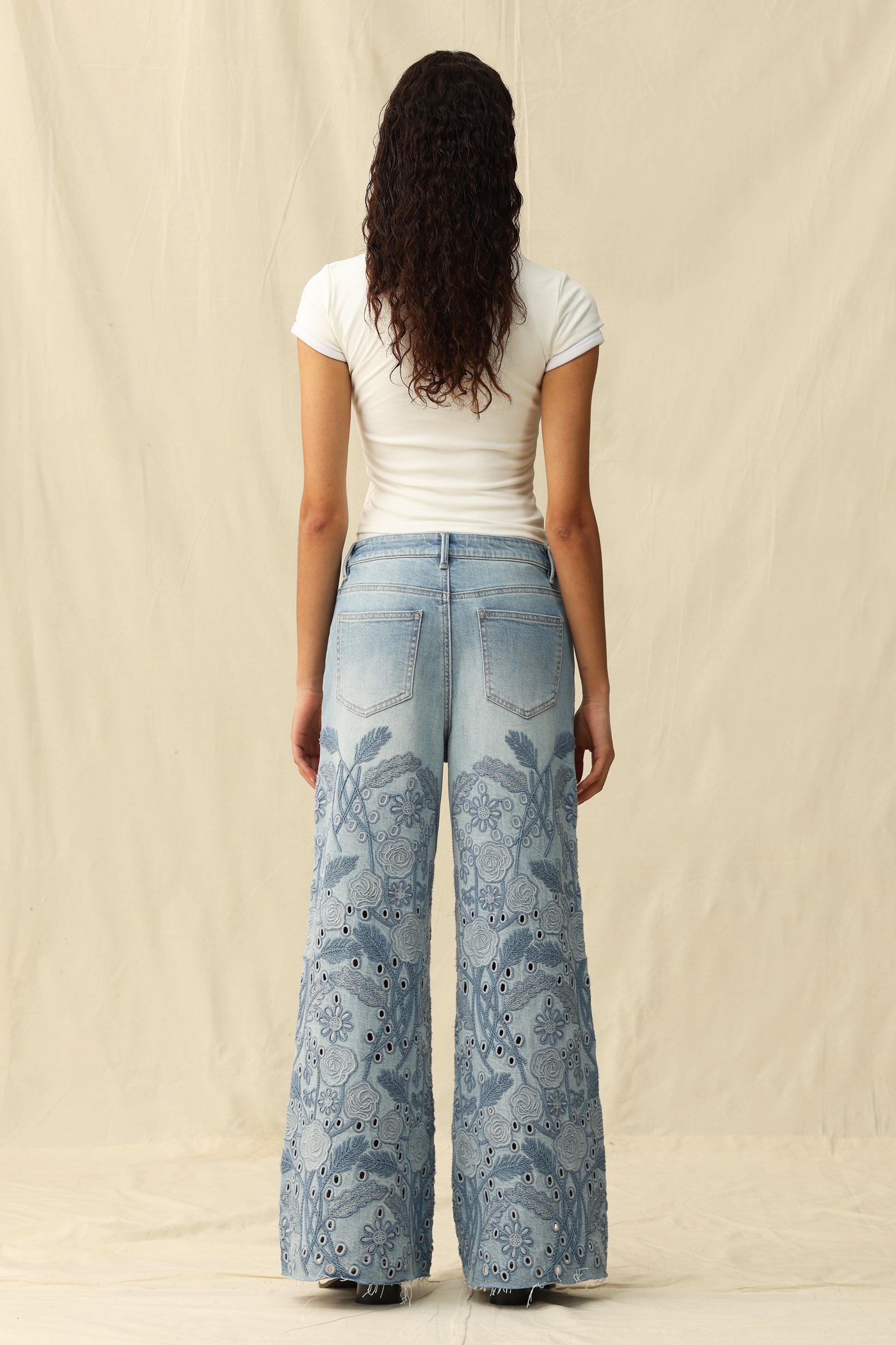 High rise wide leg jeans featuring unique embroidery detailing for a distinctive style and one of a kind aesthetic.