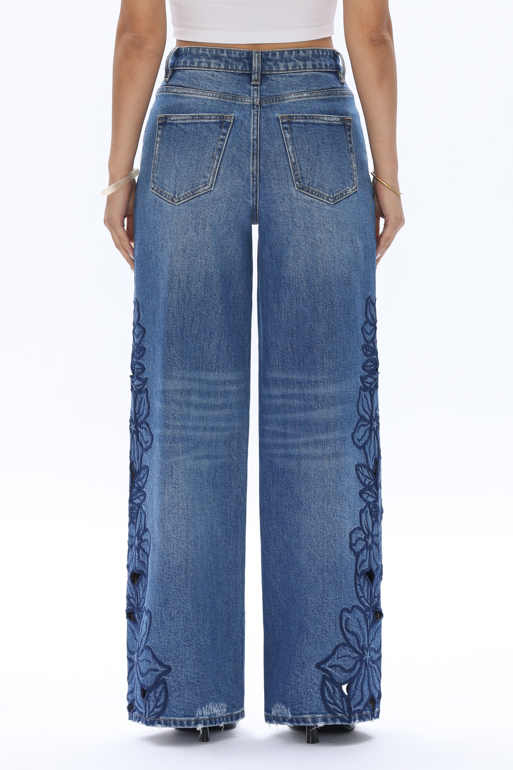 High rise wide leg,The classic five-pocket style features exquisite washing effects, with elegant and dynamic embroidery patterns and cutout designs on the pant legs.
