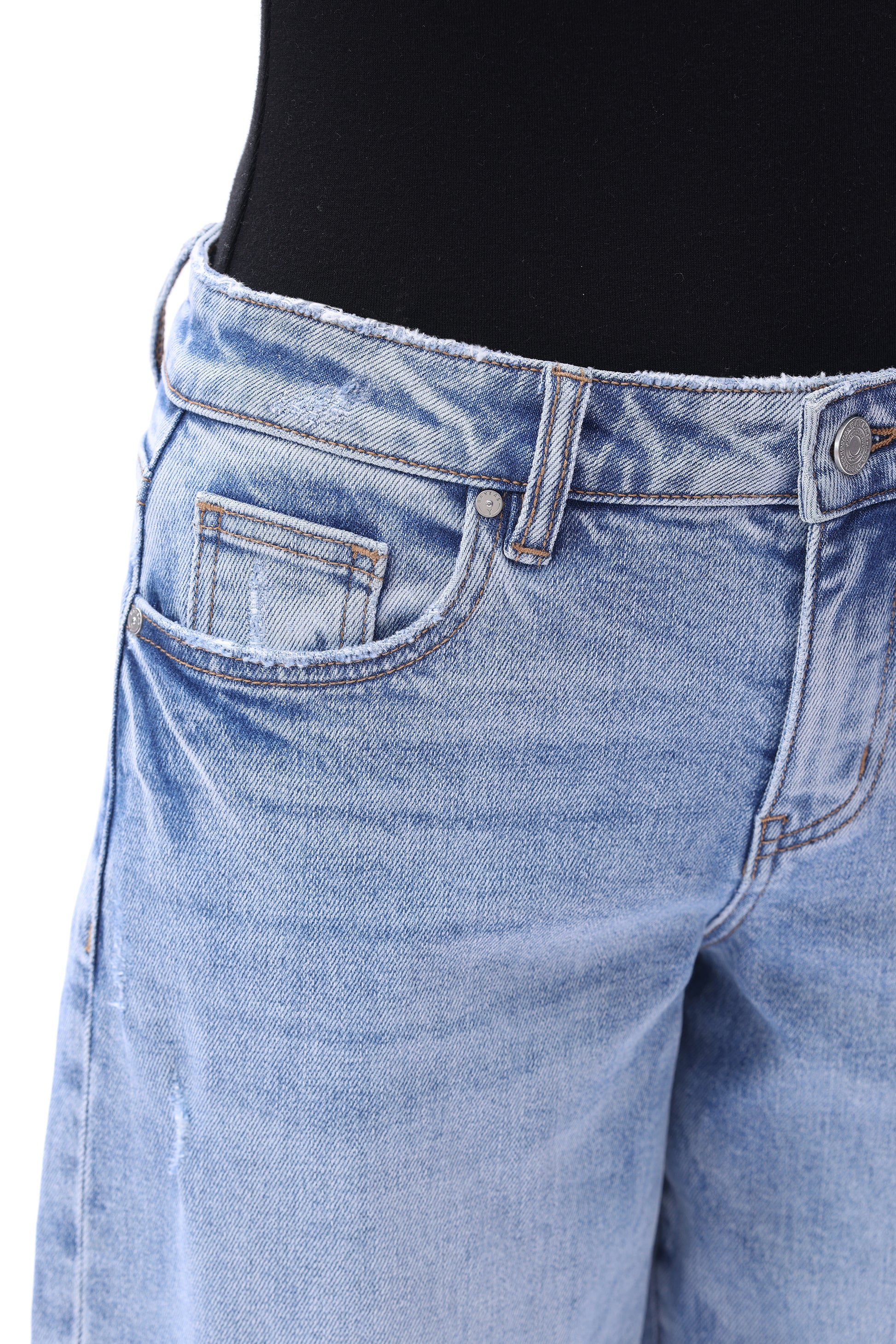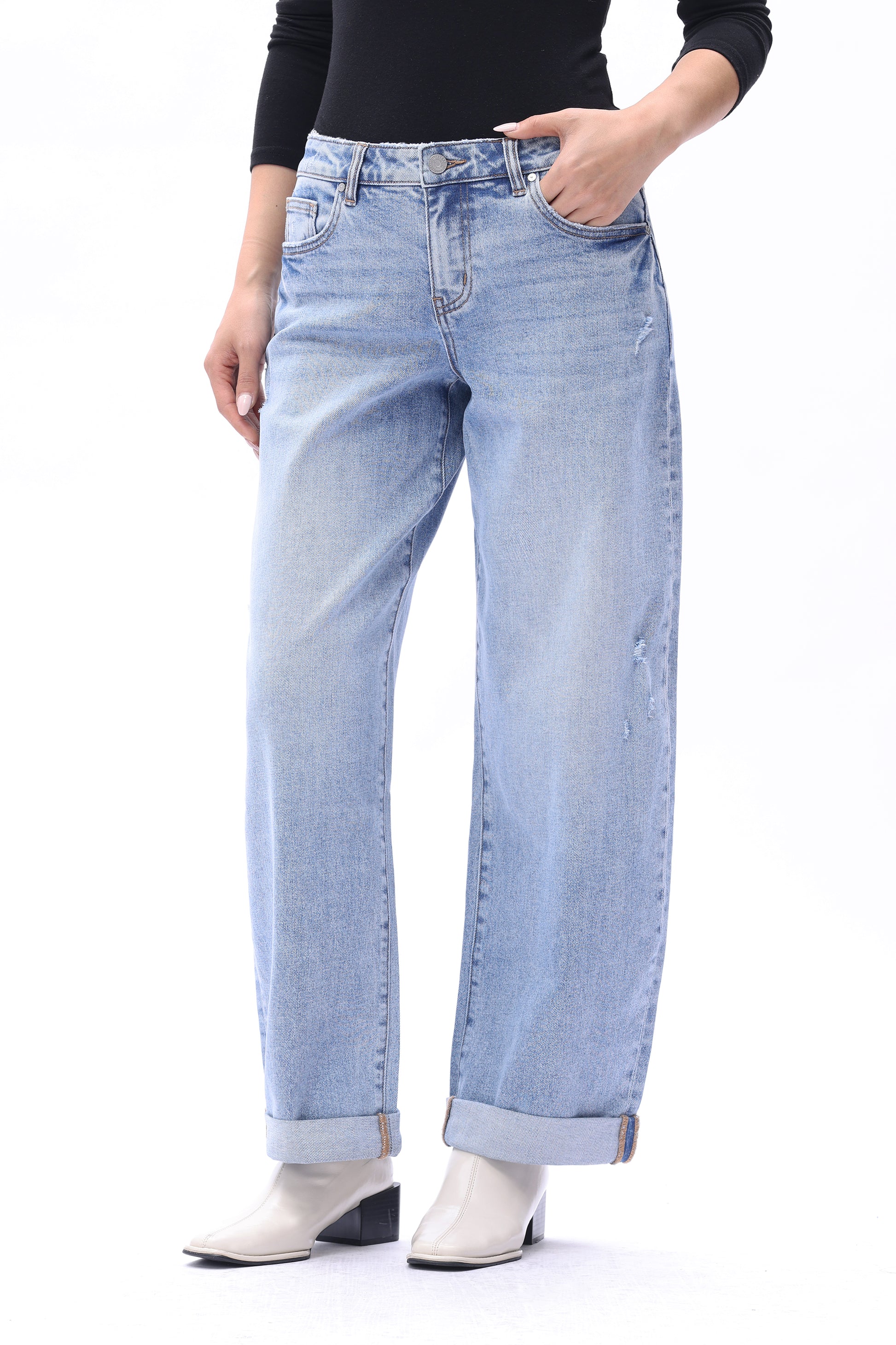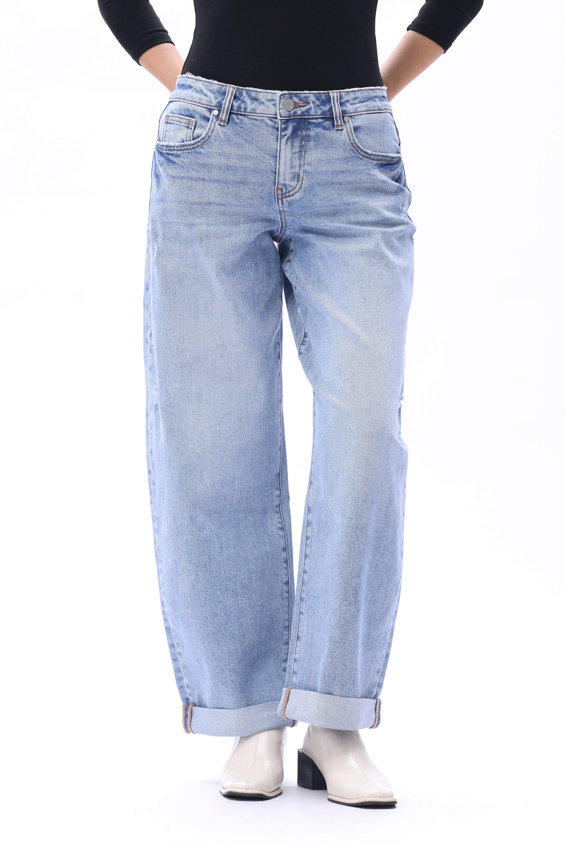 Low rise bucket pants featuring a classic five-pocket design. The garment is treated with a vintage wash to create a naturally worn-in texture with layered depth. The rolled cuffs add casual, effortless detail, making the overall silhouette both comfortable and fashion-forward, exuding understated personal charm.