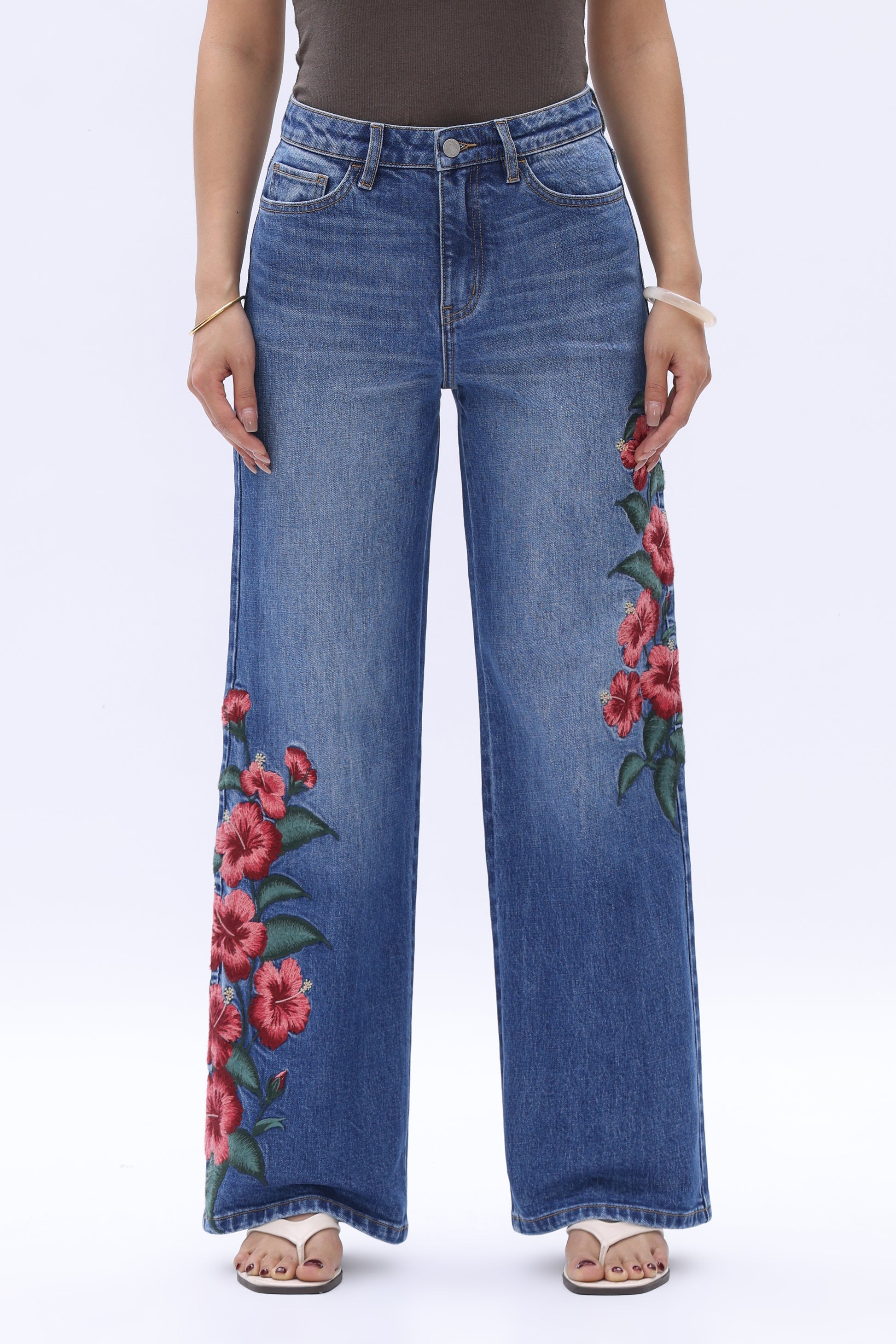 High rise straight denim jeans with a classic five-pocket design, featuring floral embroidery along the side seams and a washed treatment.