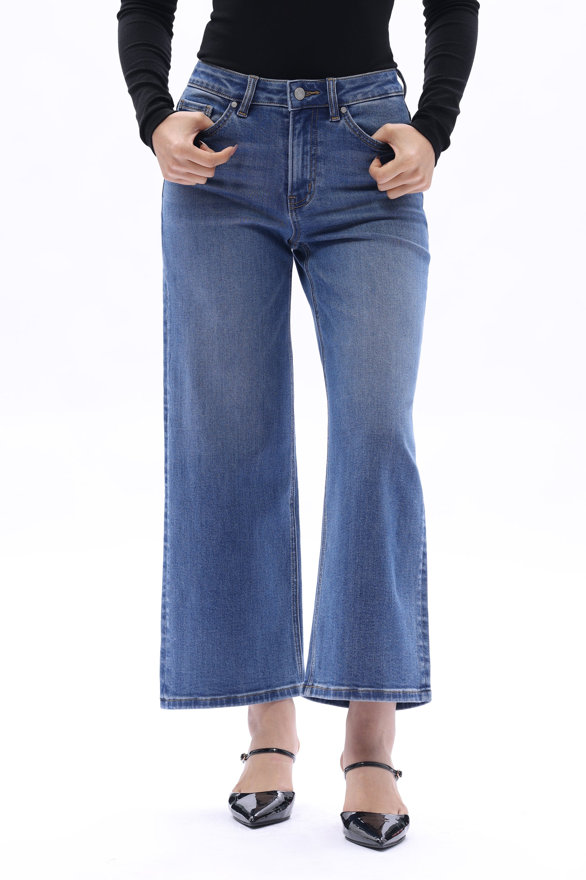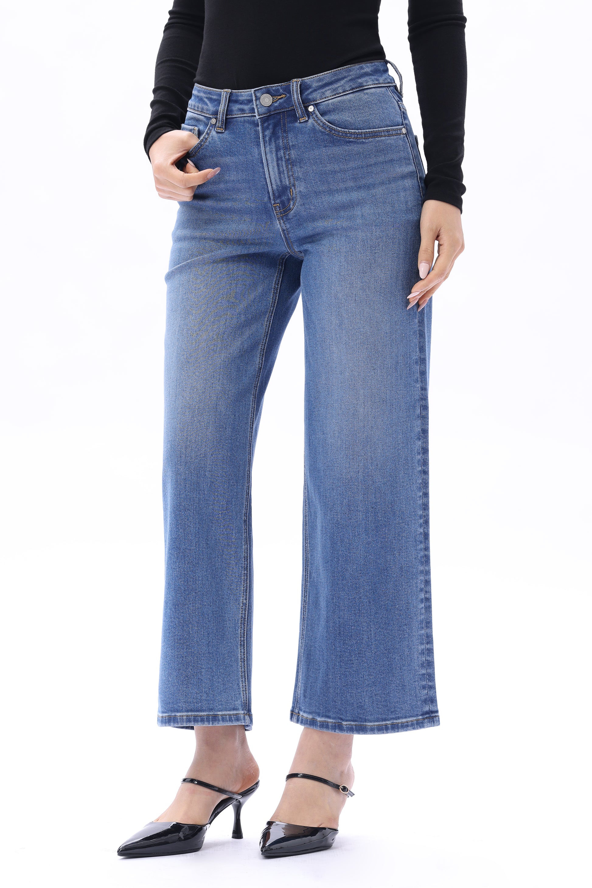 Mid rise straight jeans in a medium blue wash, designed with a classic five-pocket construction. Made from high-stretch fabric for enhanced comfort and easy wear.