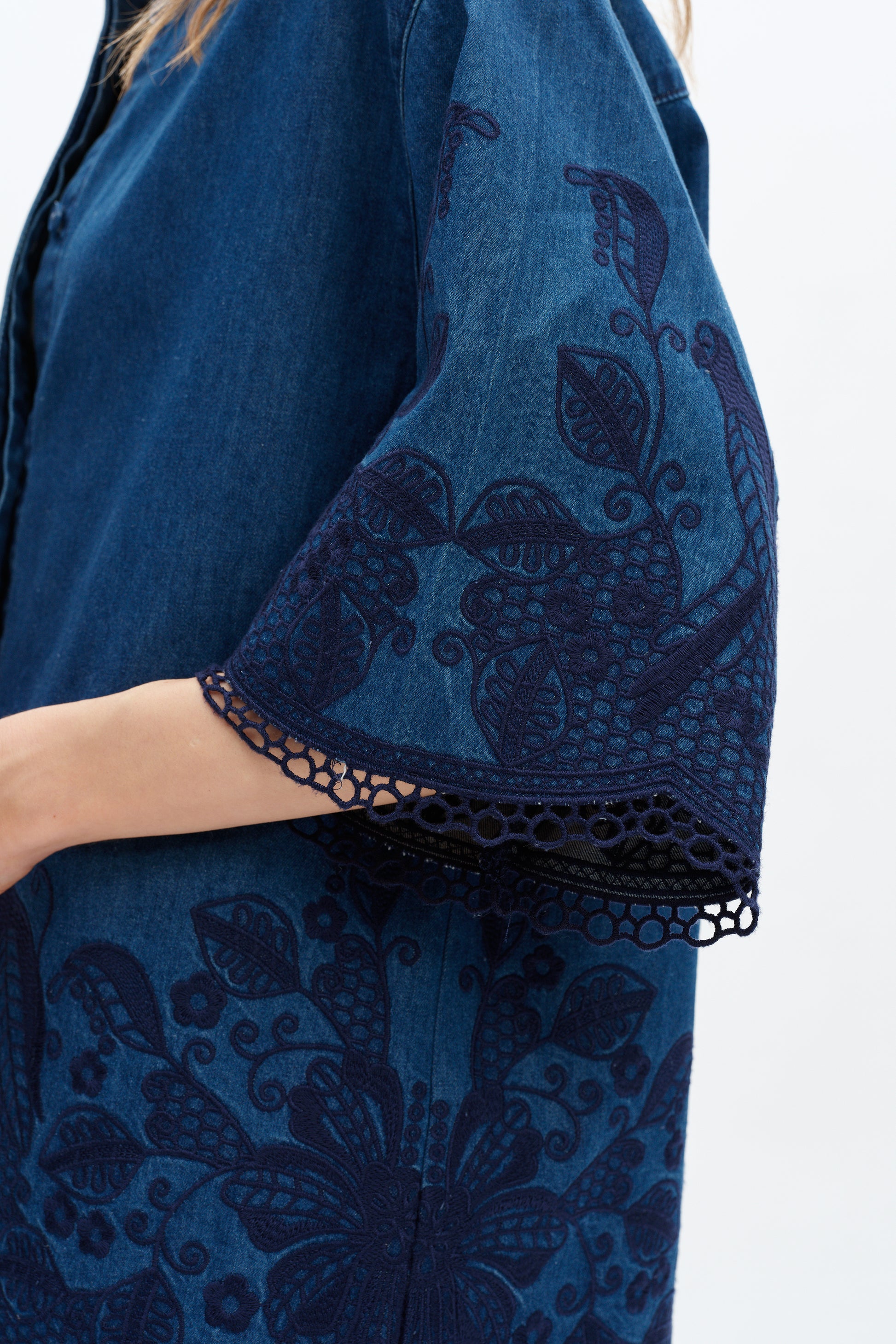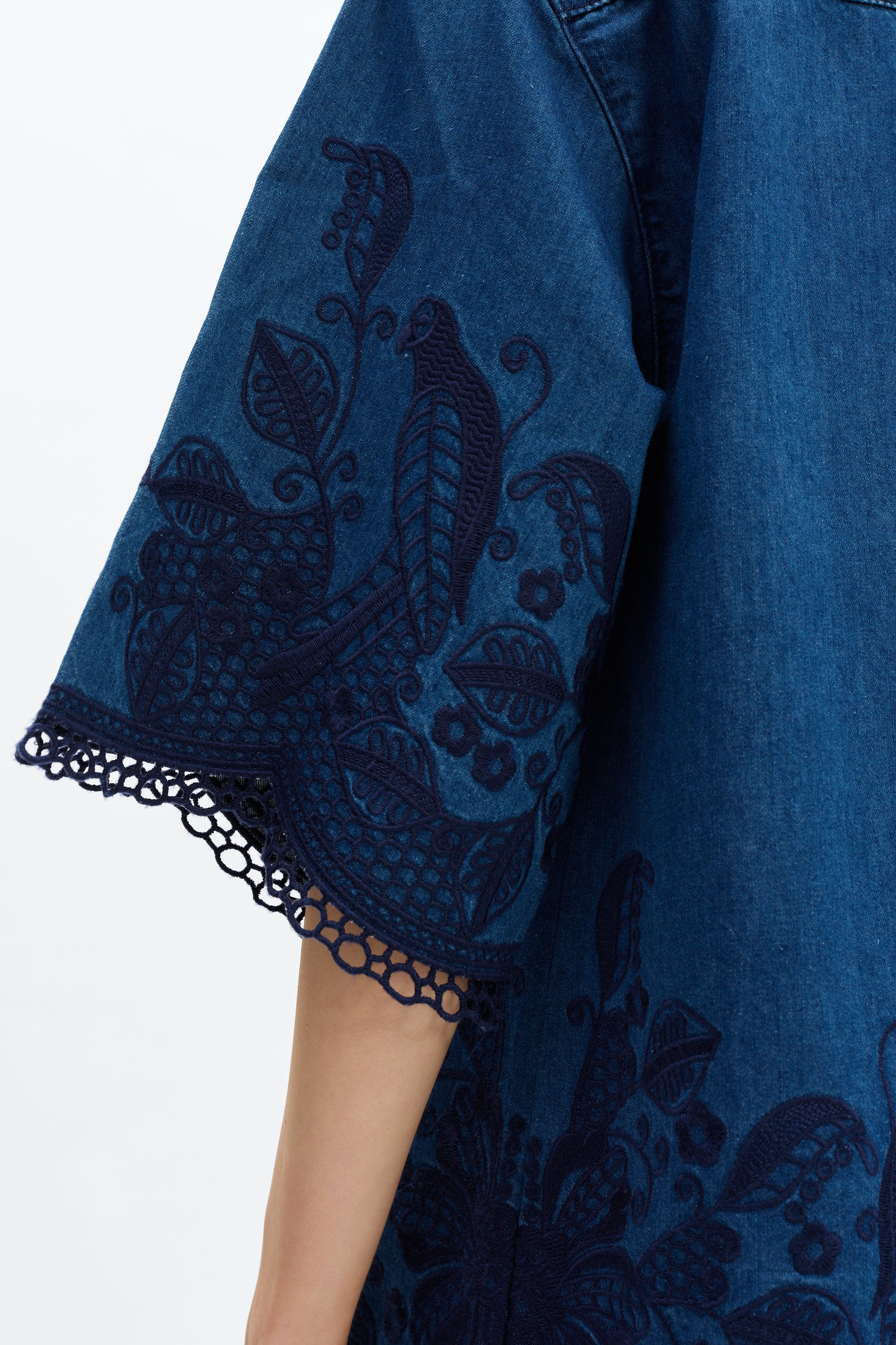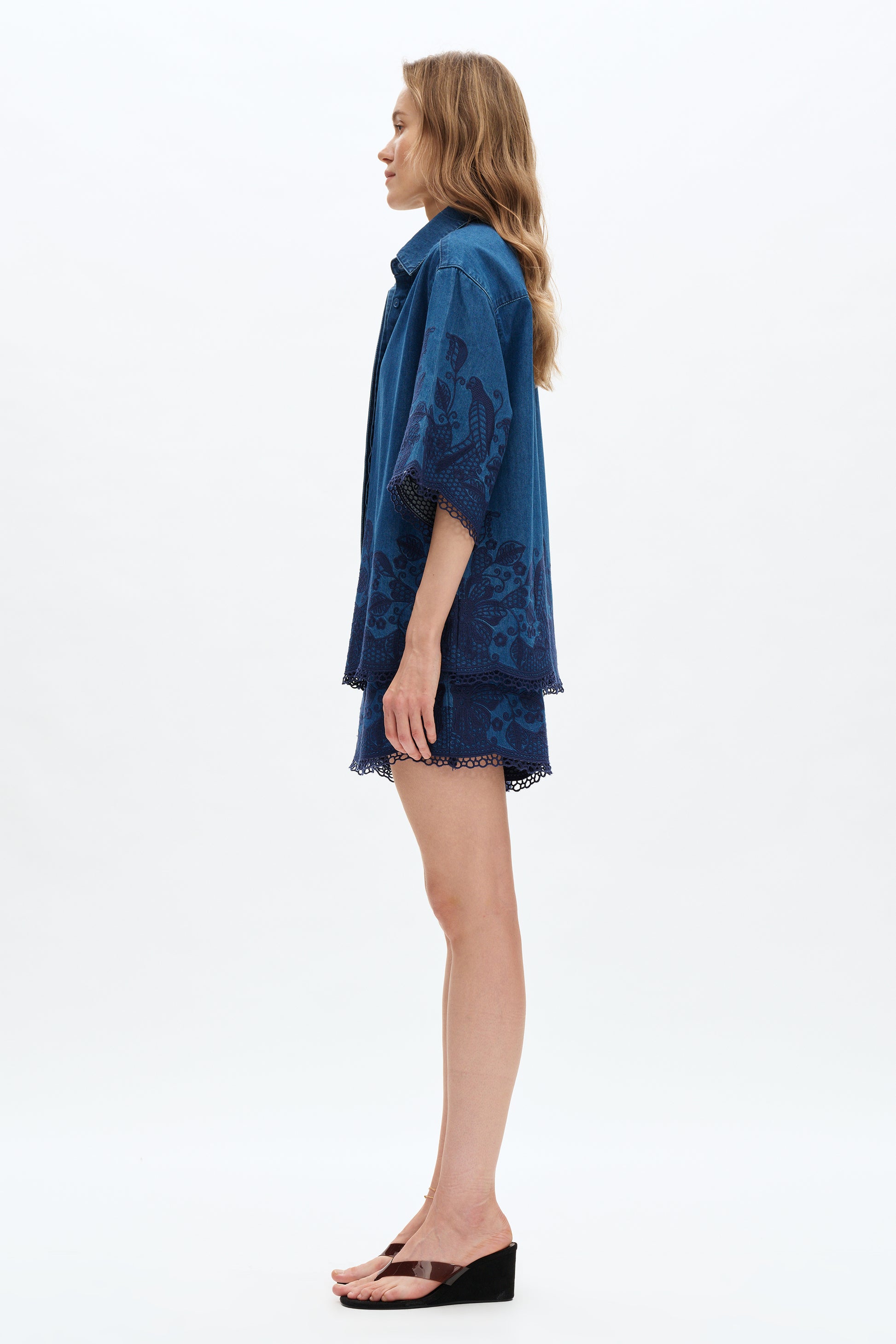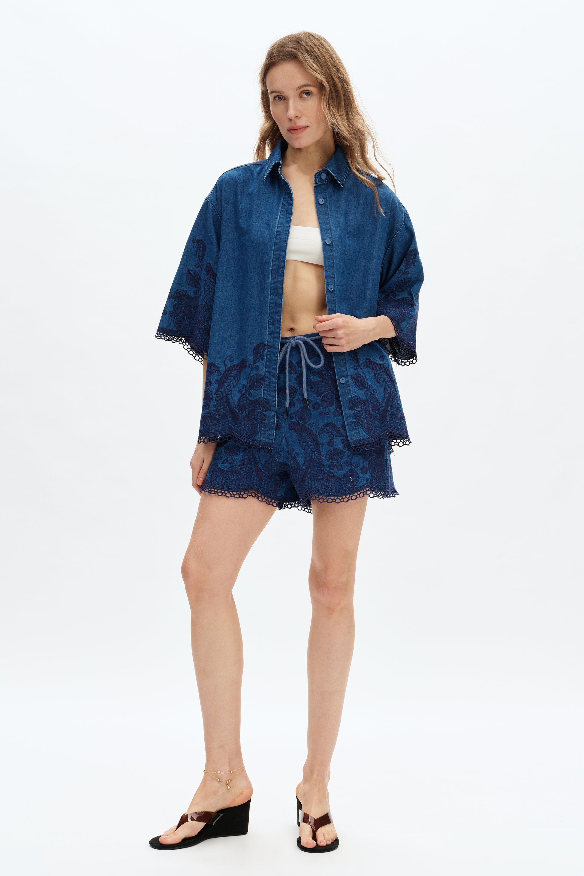 Reykjavik embroidered shirt features intricate floral embroidery that adds a unique artistic touch. The front button-down closure offers a clean and stylish look, perfect for various occasions. The delicate lace detailing on the hem and sleeves enhances its feminine elegance. Paired with matching embroidered shorts, this outfit offers a cohesive and fashionable appearance.