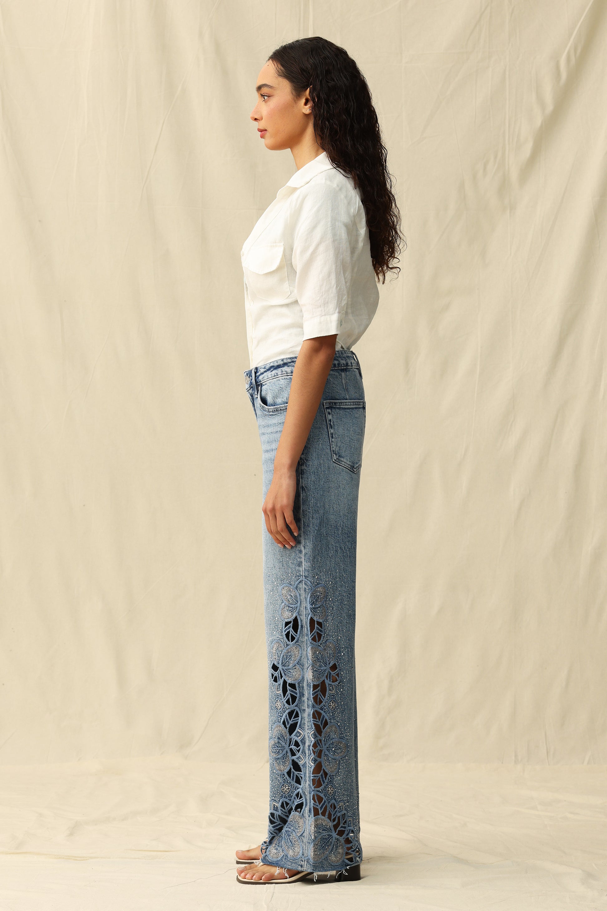 Mid rise wide leg jeans, embroidered style, made of low-stretch denim fabric, with zipper closure.