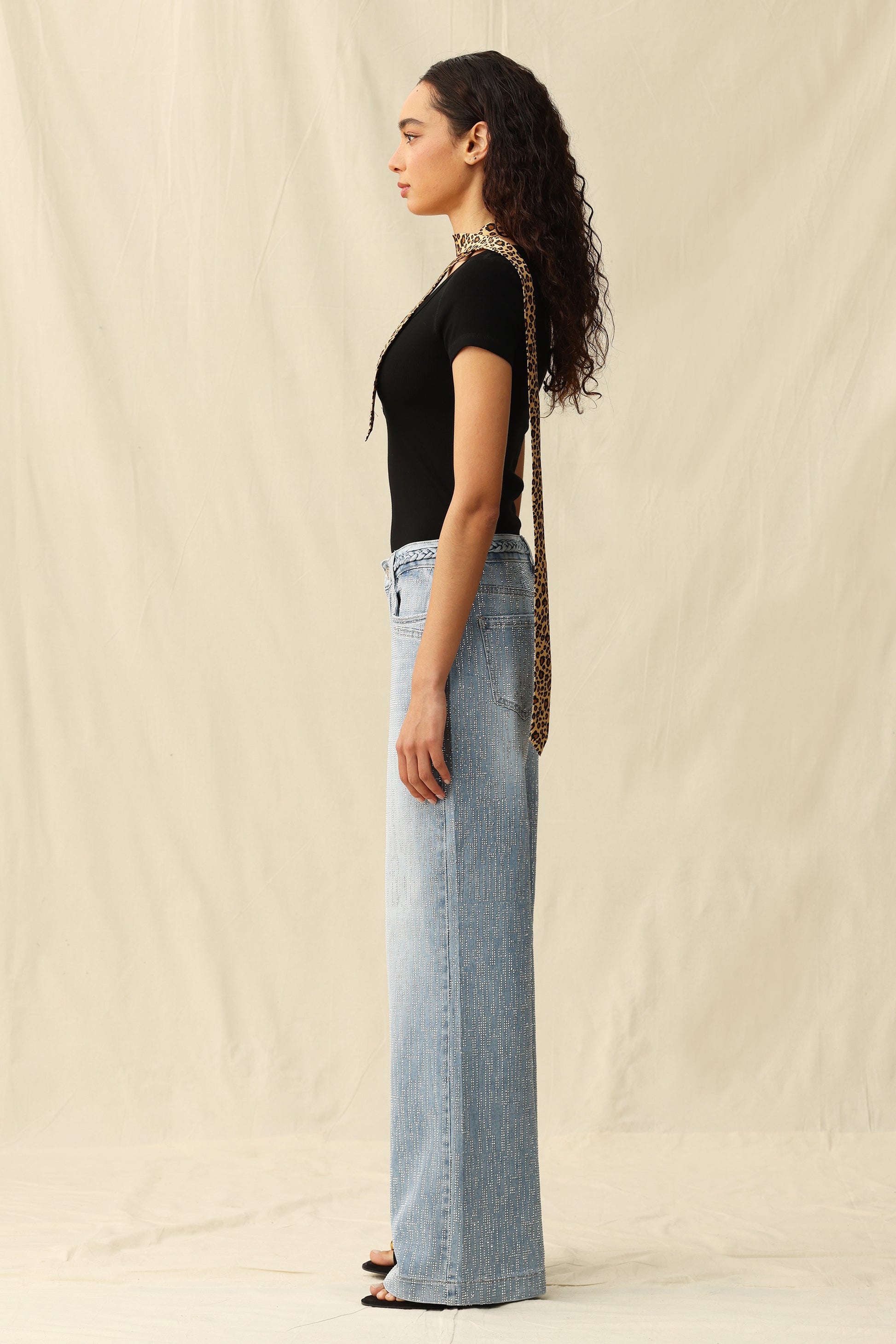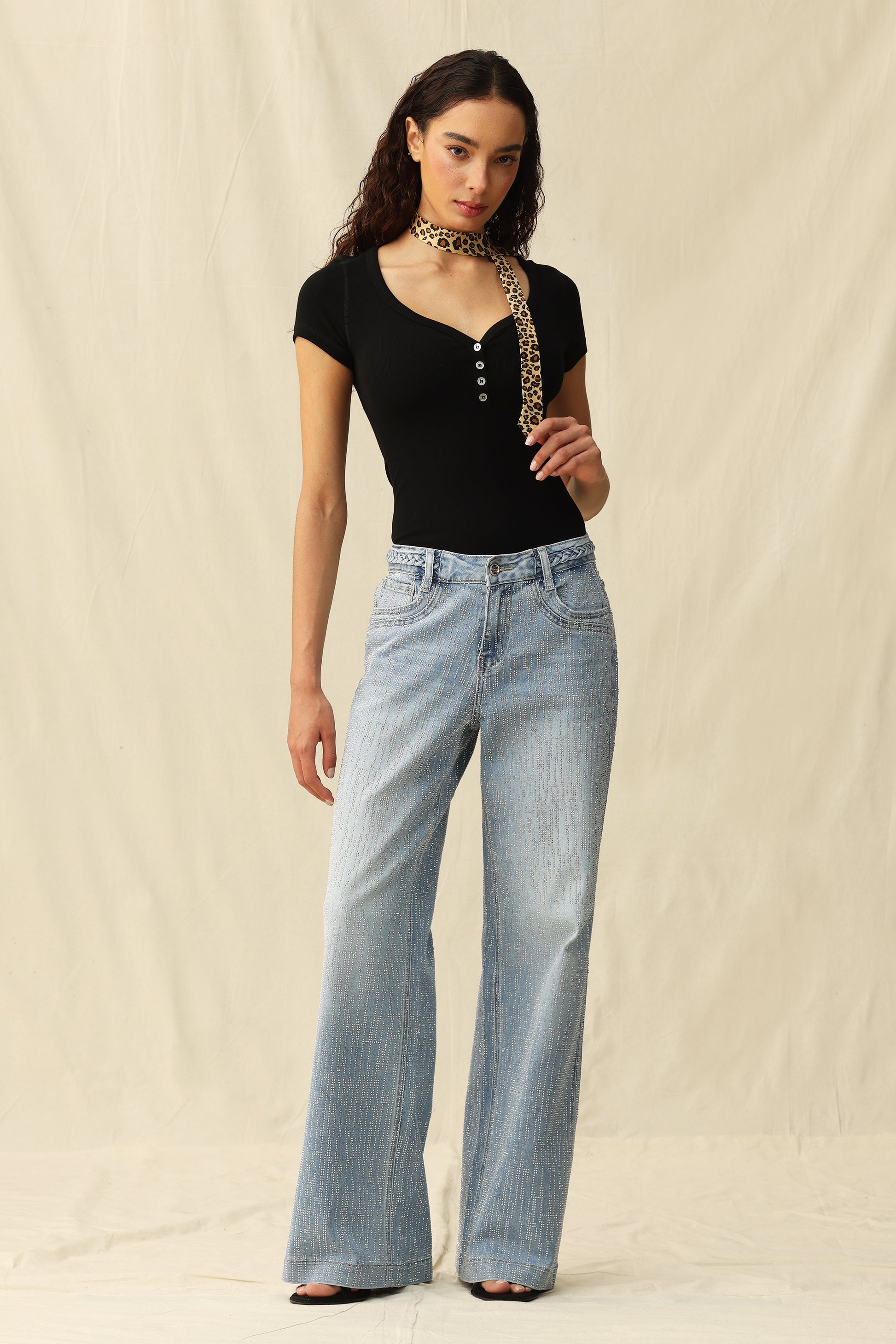 Mid rise wide leg jeans with party ready rhinestone details, crisp base color, guaranteed to make you stand out.