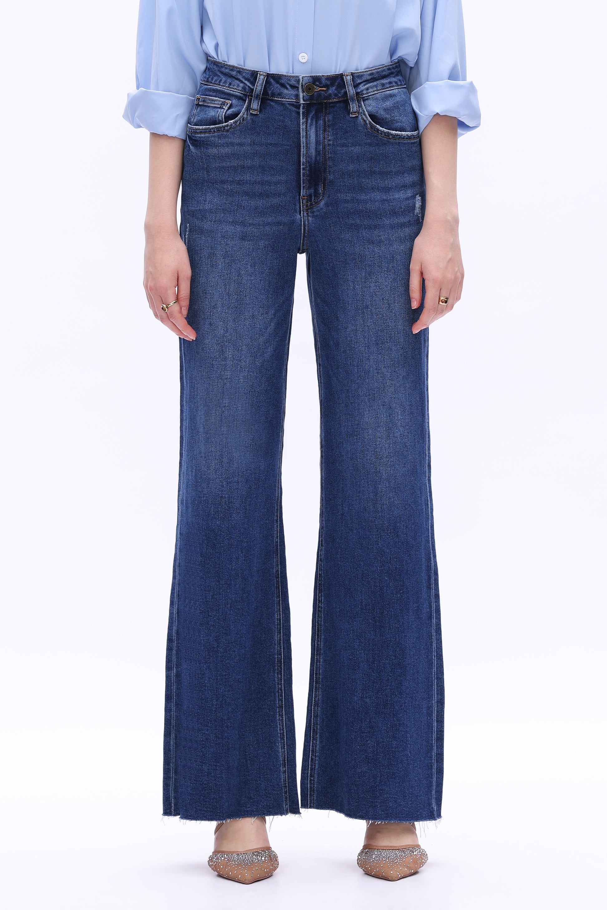 Super high rise wide leg jeans, classic five-pocket design, pleats above back pocket openings, wash-and-tear design, whiskering and hand-sanded effects, raw cut hem.