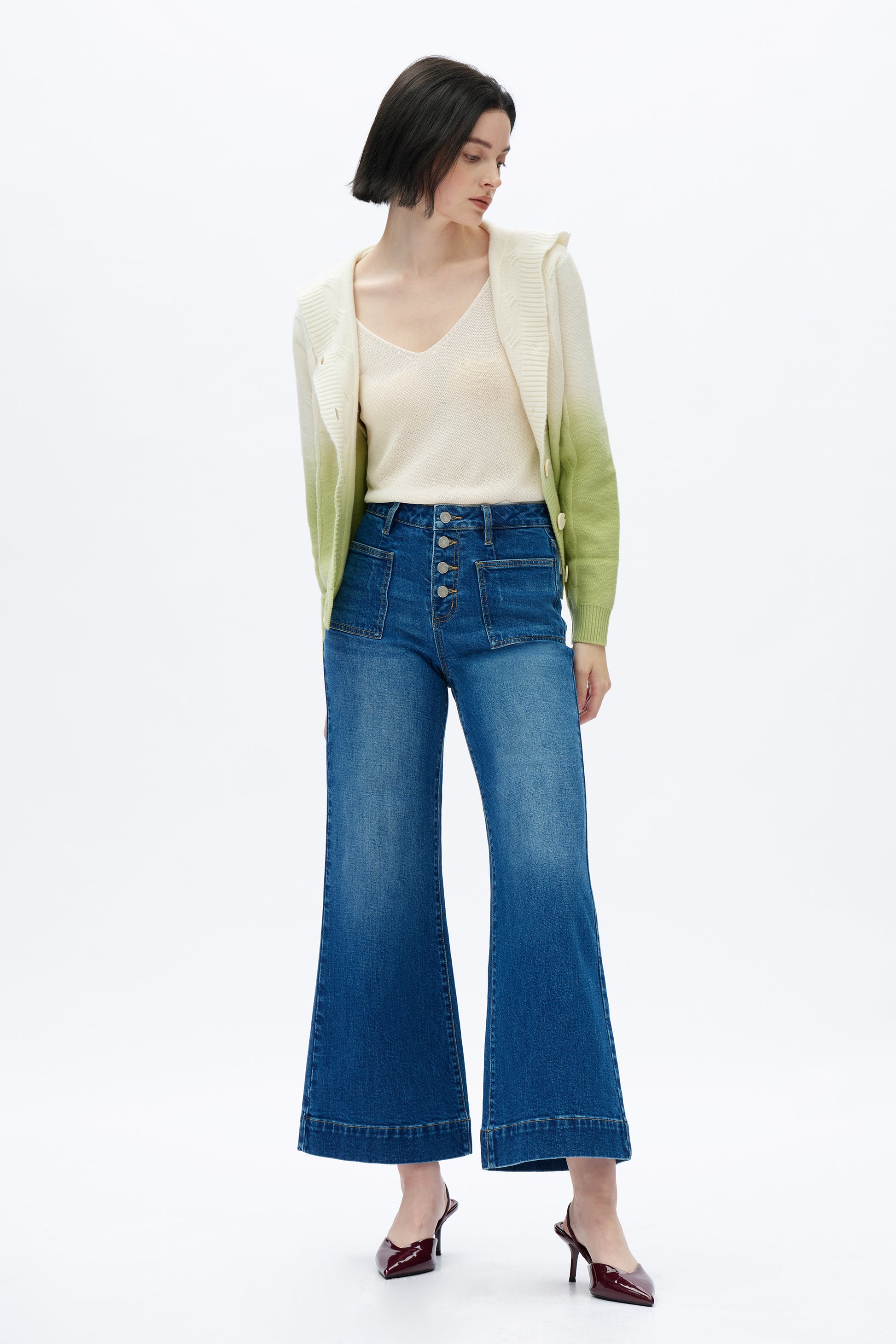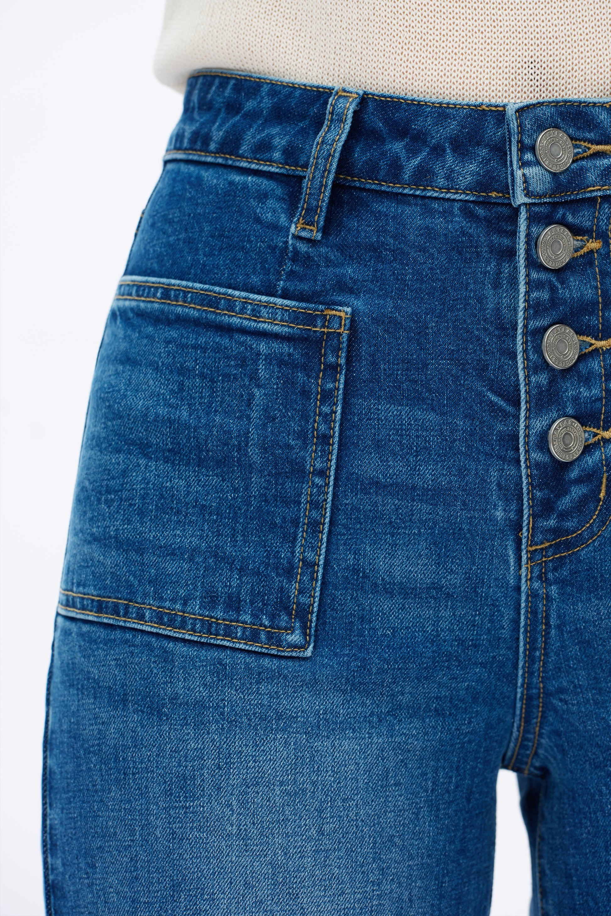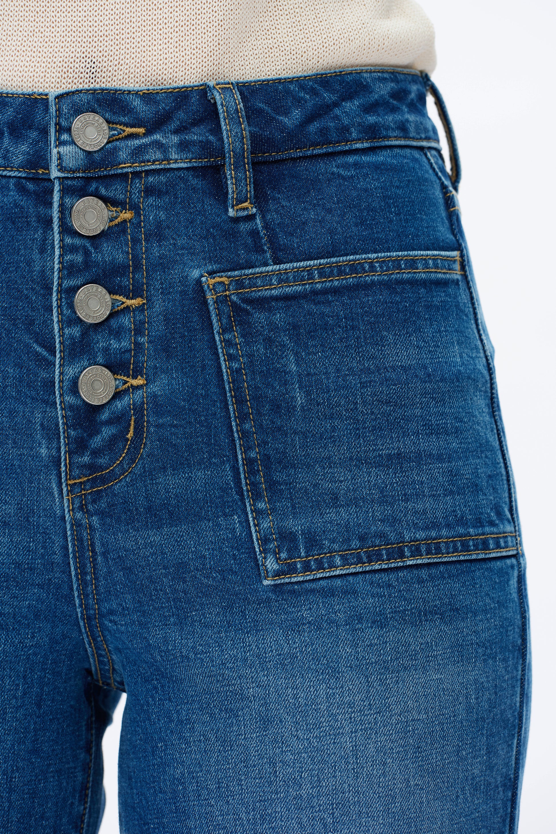 ultra high rise wide leg jeans, button fly closure, two square pockets on the front, whisker and hand-faded finish