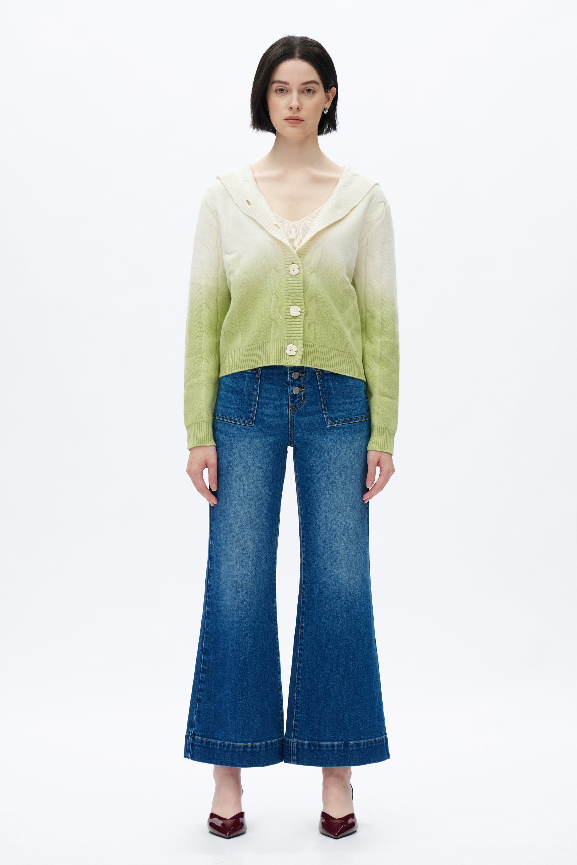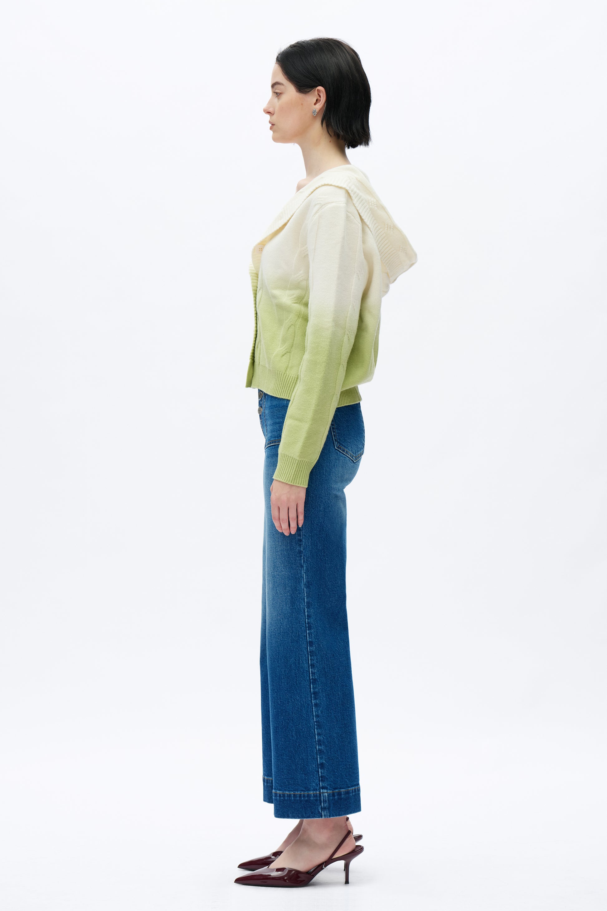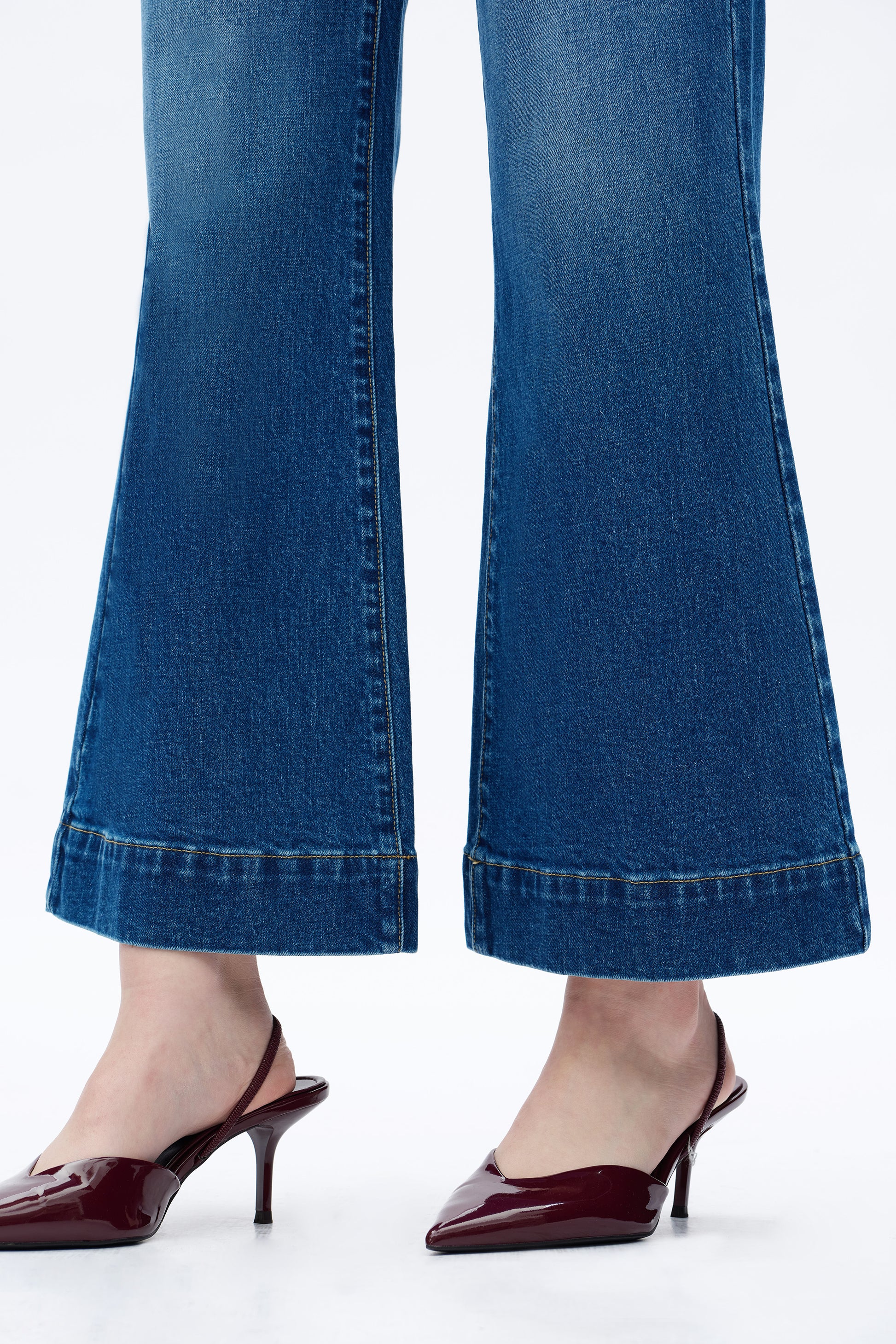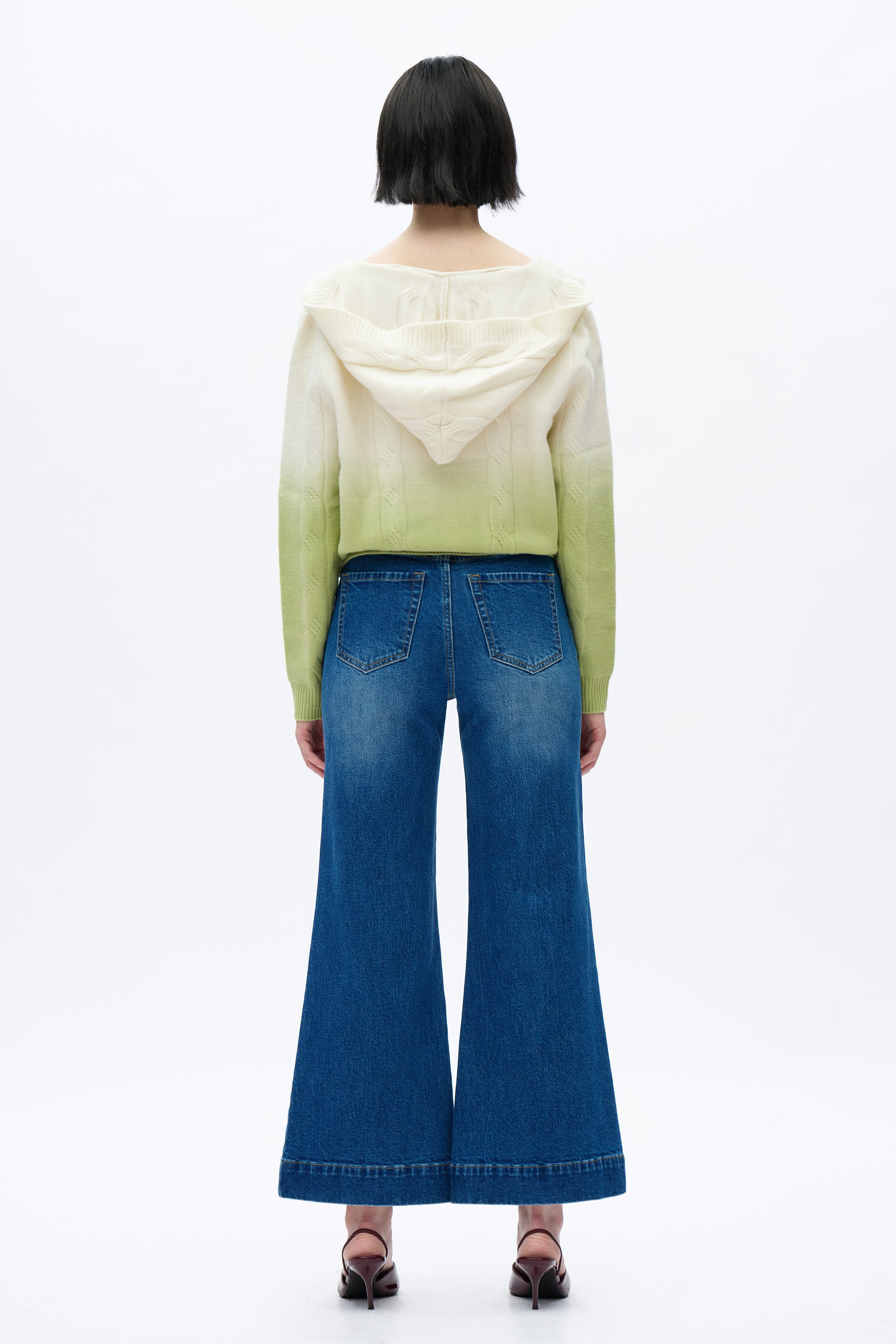 ultra high rise wide leg jeans, button fly closure, two square pockets on the front, whisker and hand-faded finish